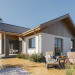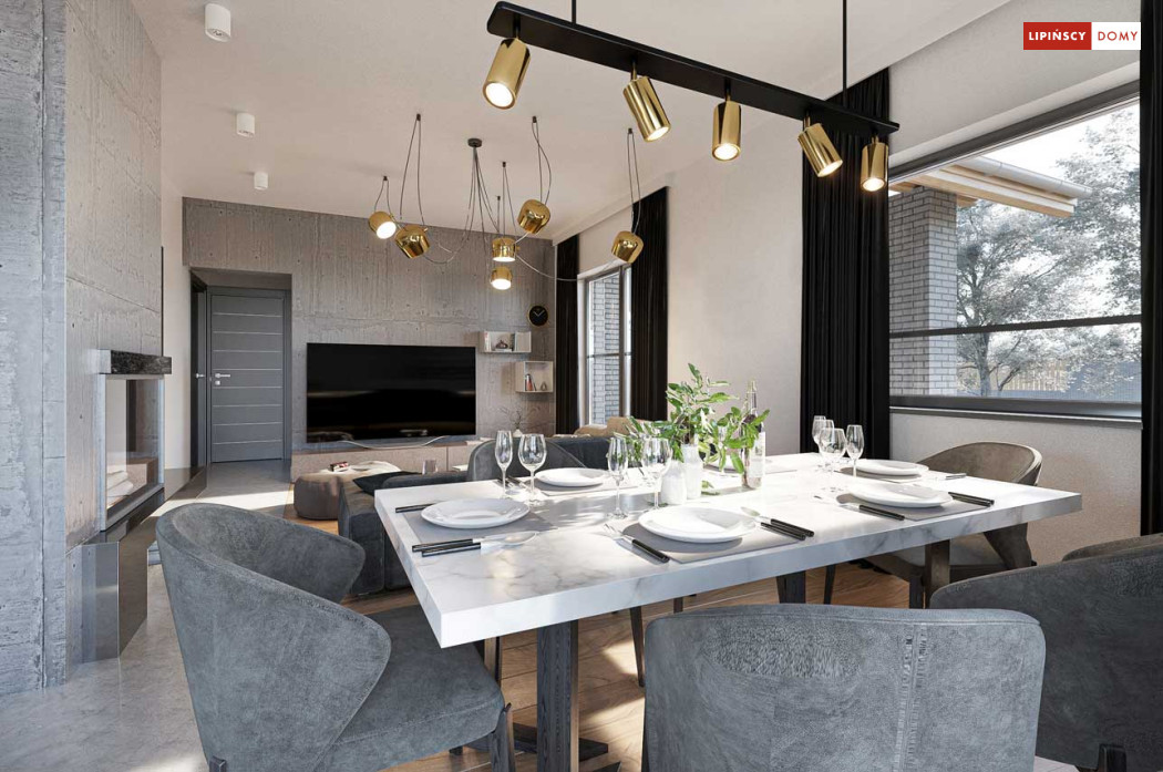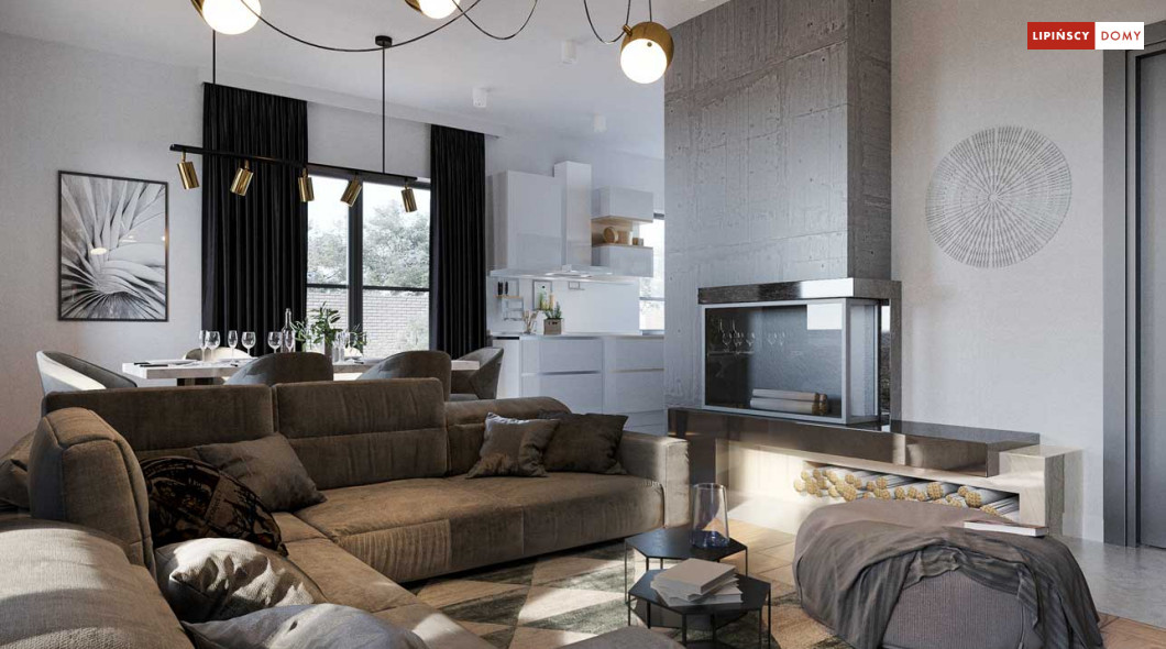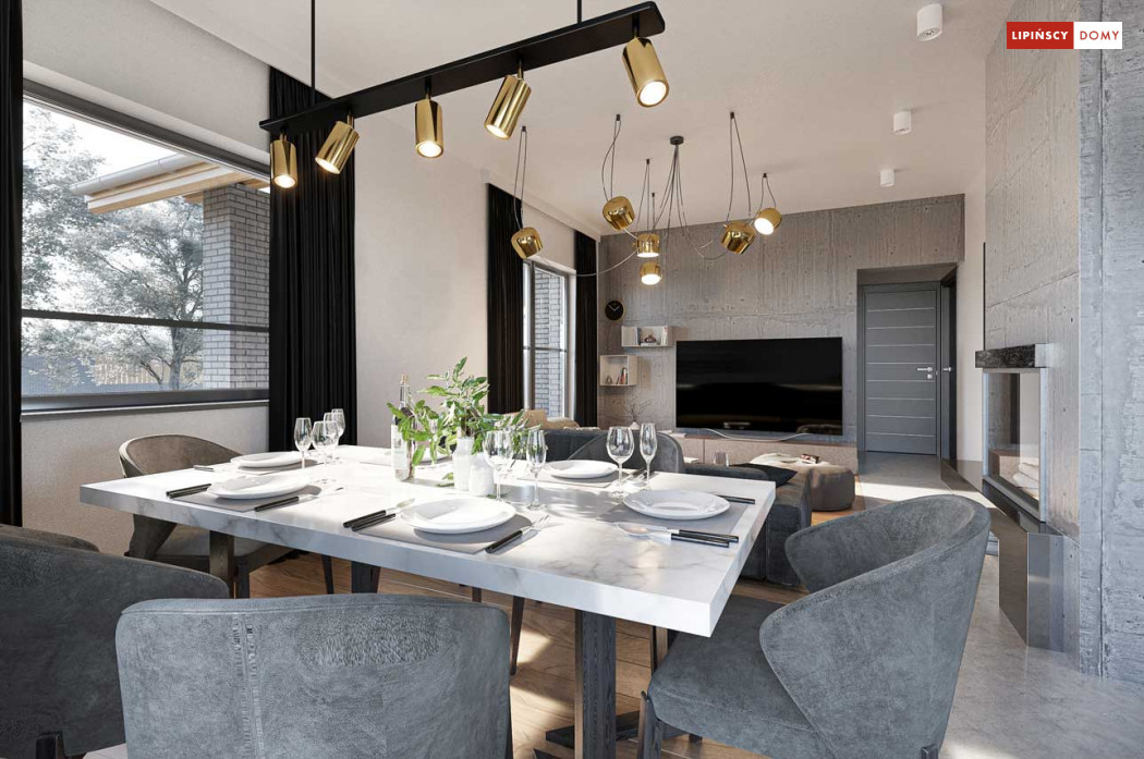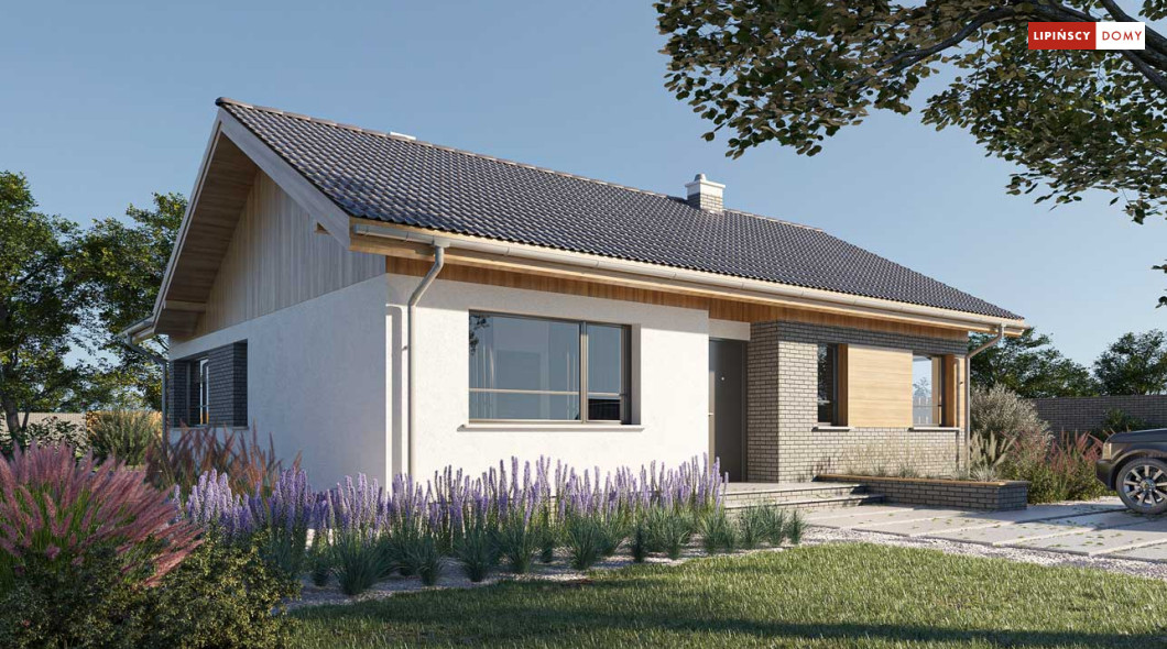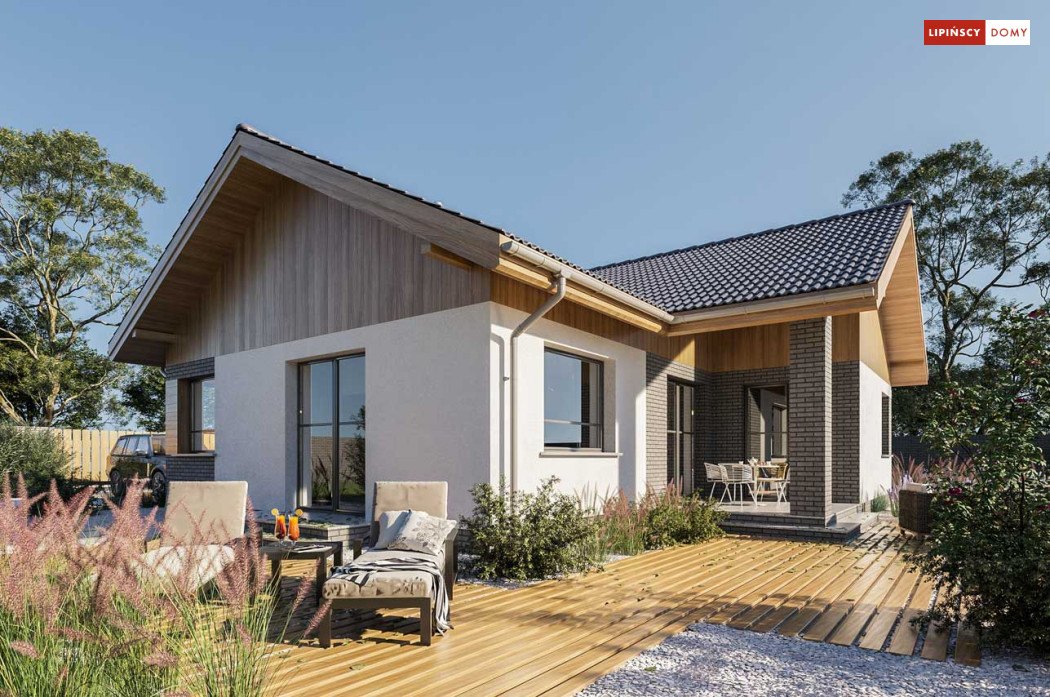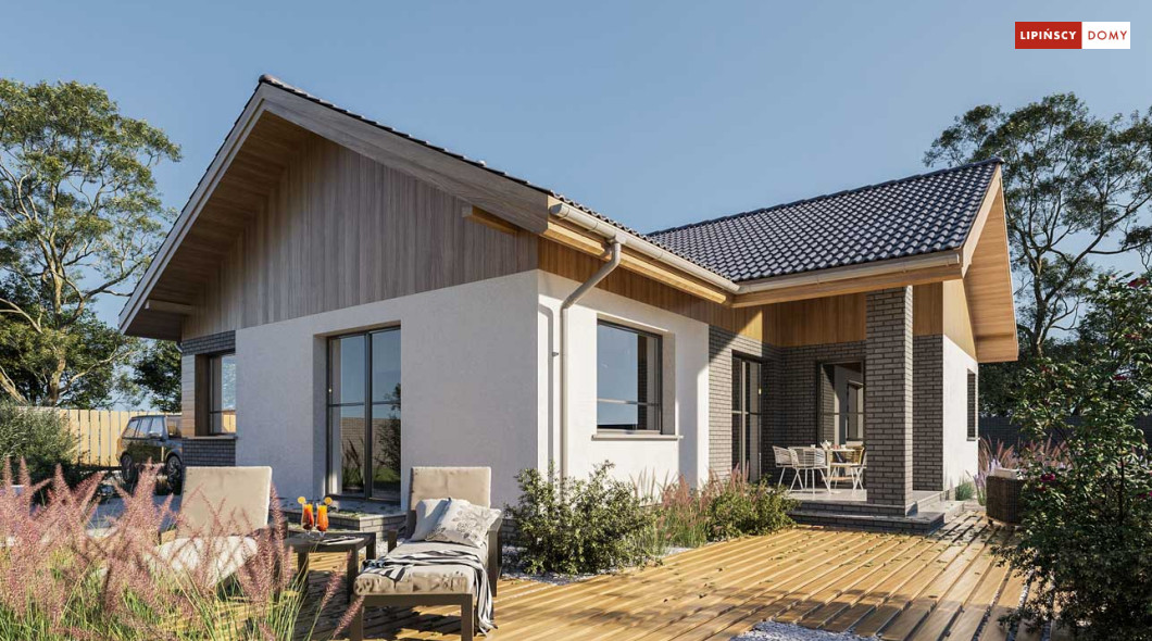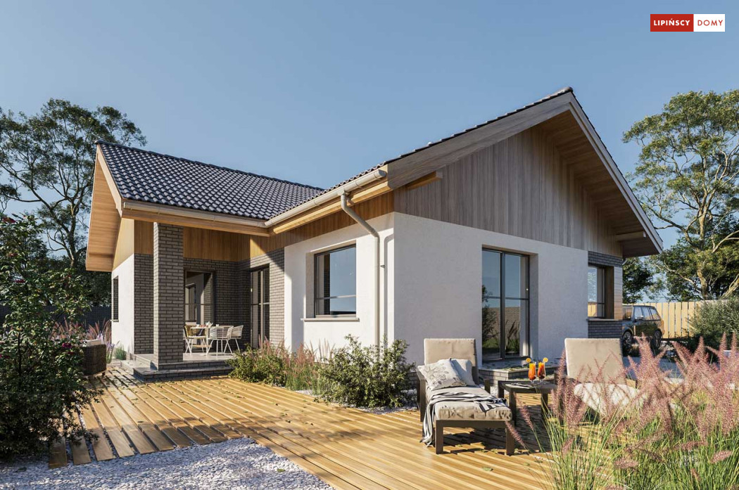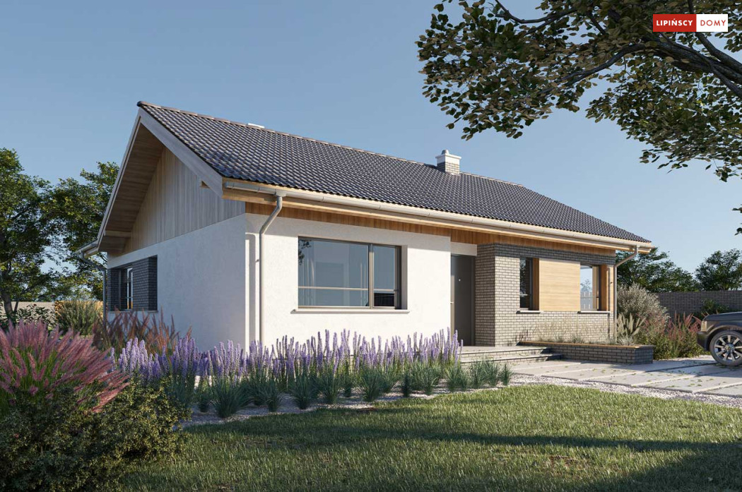 Niewielki i zarazem przestronny dom parterowy dla rodziny 2+1, zapewniający komfort użytkowania i przytulne wnętrze obudowane piękną bryła. W obszernym, doskonale oświetlonym salonie jest miejsce na wygodna sofę i duży stół jadalni. Atrakcyjny jest też funkcjonalny zadaszony taras powiększający przestrzeń użytkową domu o letni pokój. Kuchnia ma bezpośrednie połączenie z pomieszczeniem gospodarczym i wiatrołapem. Ułatwia to przenoszenie zakupów. Sypialnia rodziców jest od strony ogrodu, posiada oryginalne okno narożnikowe i wyjście na zadaszony taras. Sypialnia ta oddzielona jest od sypialni dziecka przestronną łazienką i dodatkowym pomieszczeniem toalety. W tym domu zastosowano ogrzewanie pompą ciepła i wentylacje grawitacyjną. Jeśli nie jesteście zwolennikami kominka to można z niego oczywiście zrezygnować na etapie adaptacji projektu.