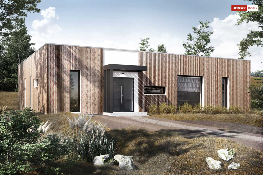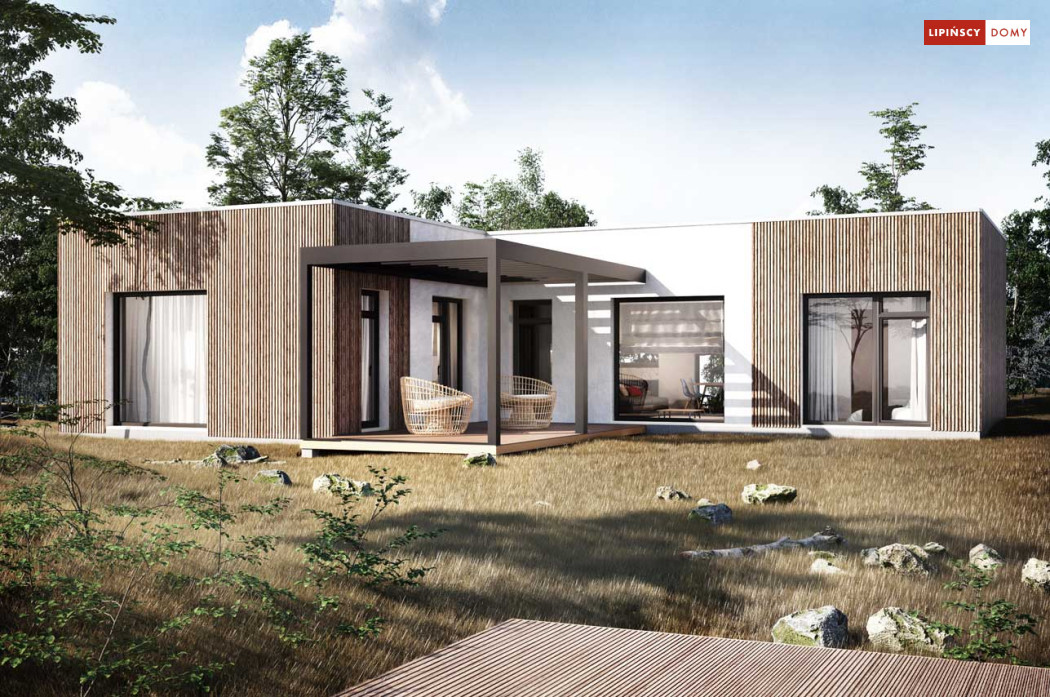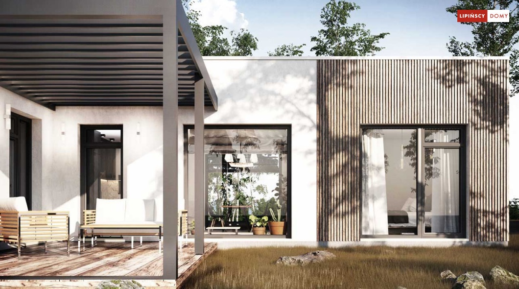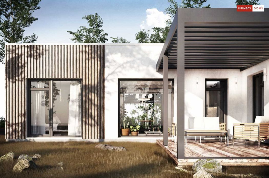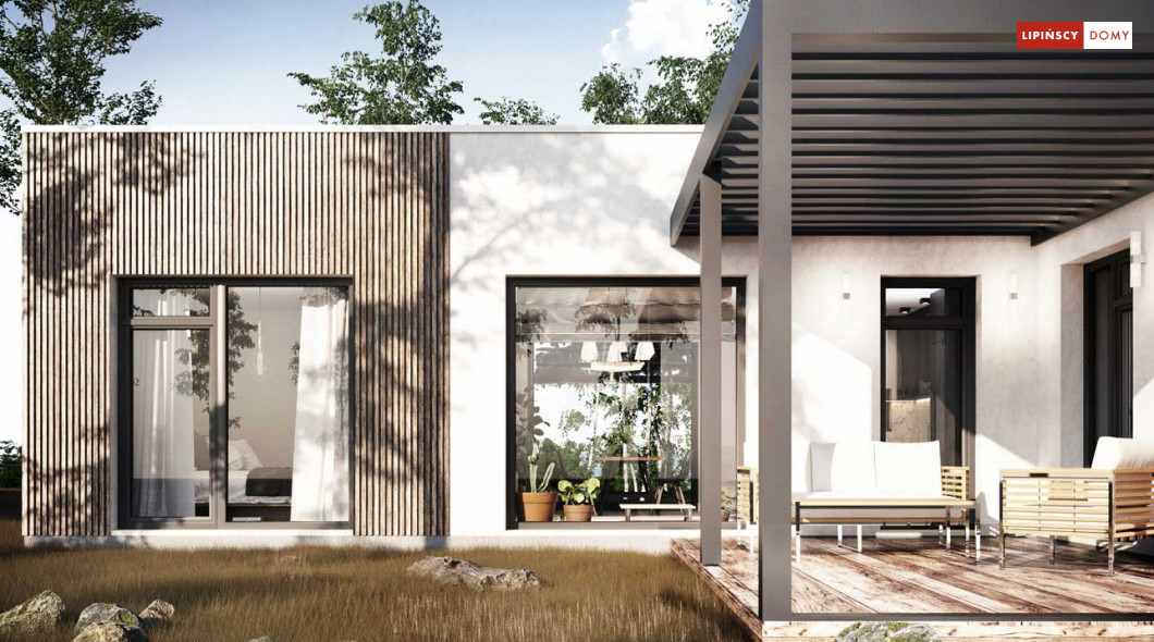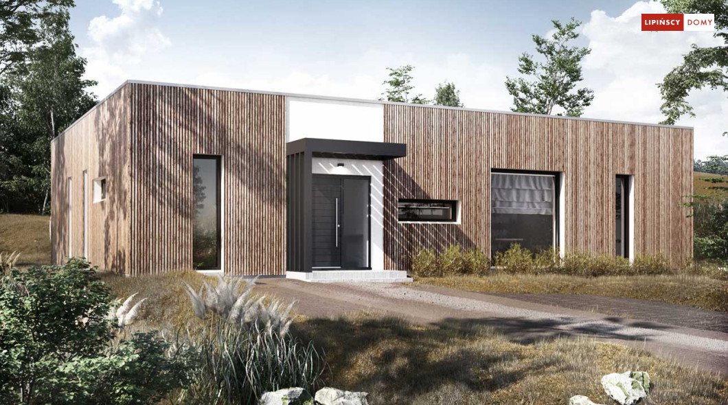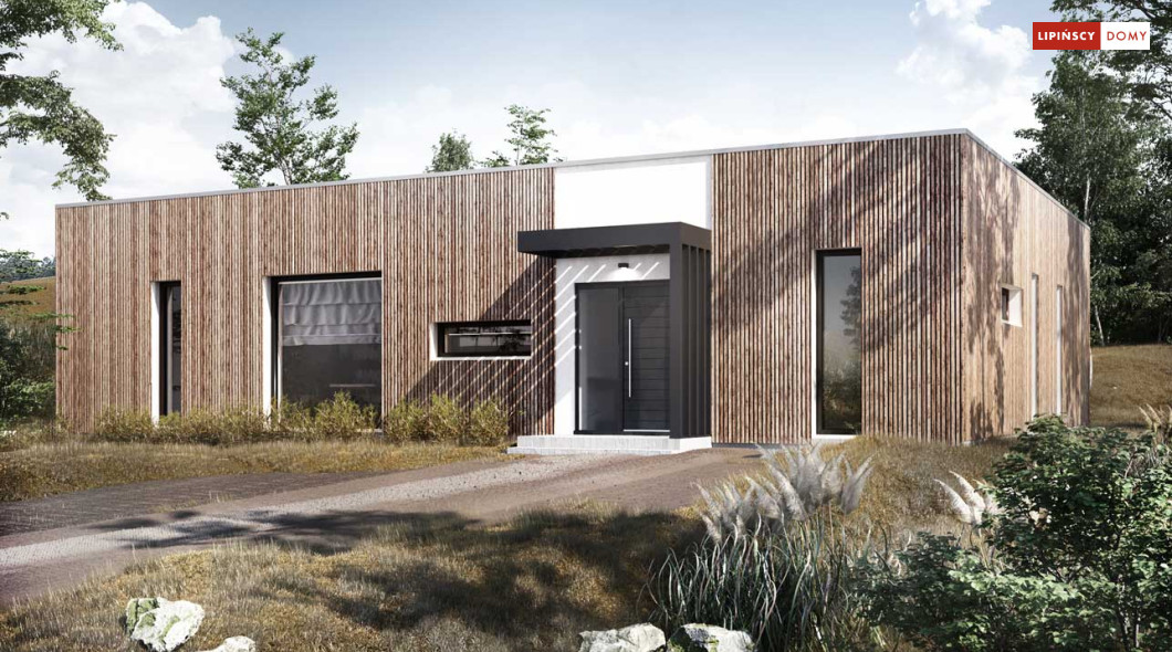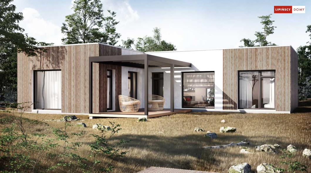 Oryginalny, parterowy dom z płaskim dachem, nowoczesny w formie i w układzie funkcjonalnym. Jest to doskonała propozycja na działki z dużym potencjałem. Przeszklenia są zachwycające i tworzą niepowtarzalny klimat domu. Pokój dzienny stanowi jednoprzestrzenną całość z kuchnią i jadalnią. Oświetlony na przestrzał stanowi serce domu. Stąd jest wejście do apartamentu rodziców z prywatną łazienką. Dwie sypialnie dzieciaków z łazienka są w naprzeciwległej części domu. Jest tu również duże popieszczenie gospodarcze. Rzut domu w kształcie litery L wytwarza atrium wewnętrzne, przekryte pergolą. W okresie letnim jest to bardzo użytkowa i magiczna przestrzeń. Dom jest niewielki powierzchniowo, ale bardzo reprezentacyjny, idealny dla ludzi patrzących w przyszłość. Zastosowano tu ogrzewanie gazowe, instalacje solarną i rekuperację. Możliwa jest zmiana ogrzewania na pompę ciepła.