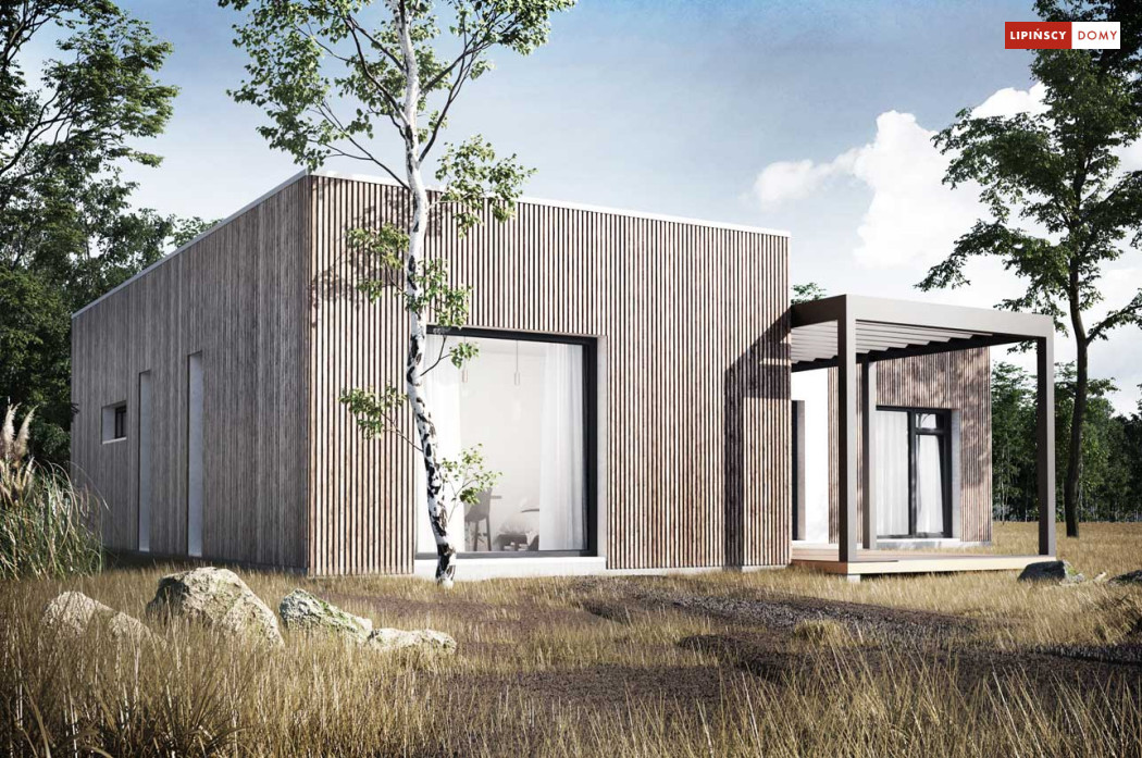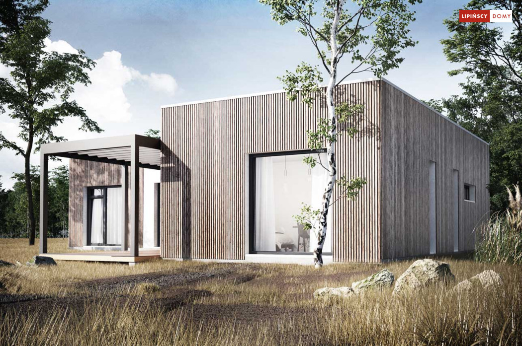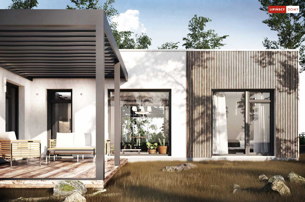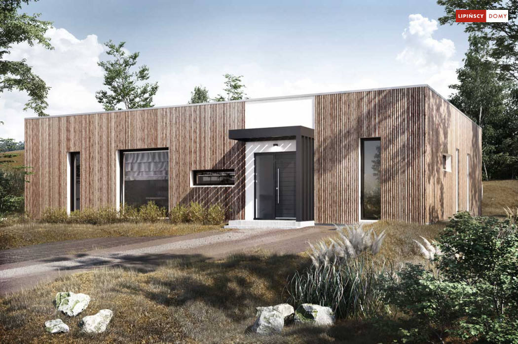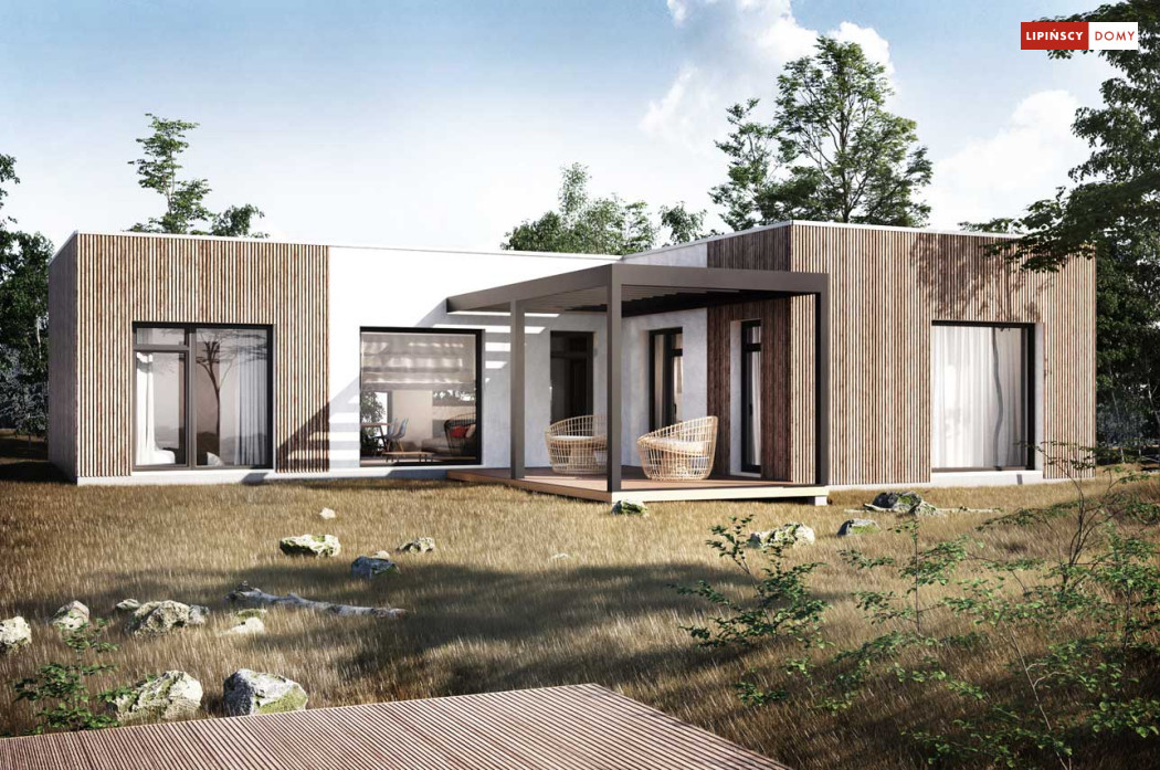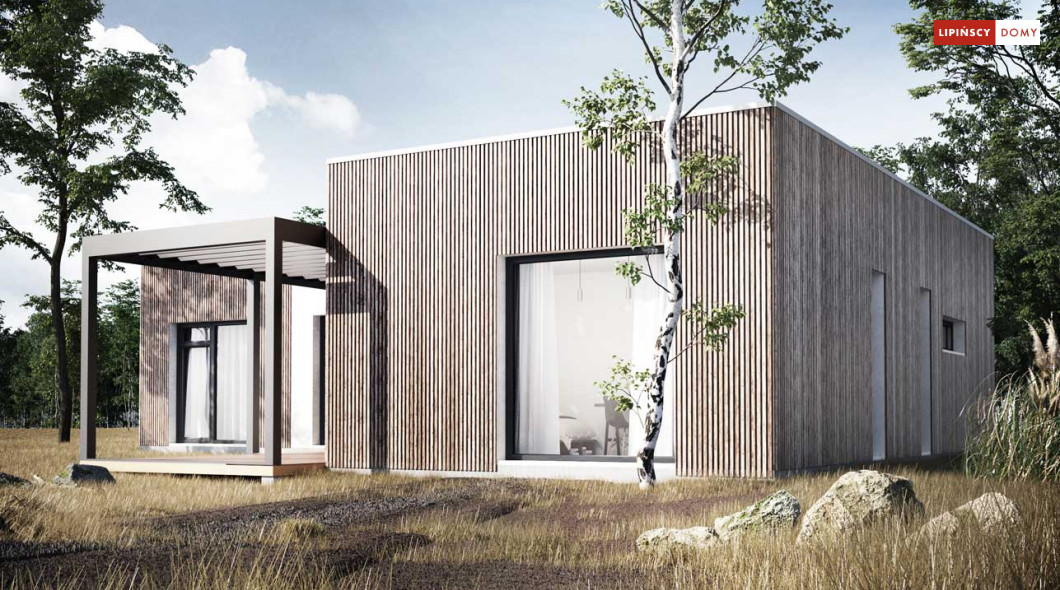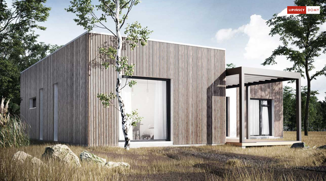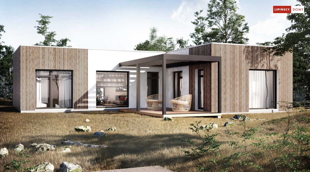 Oryginalny, parterowy dom z płaskim dachem, nowoczesny w formie i w układzie funkcjonalnym. Jest to doskonała propozycja na działki z dużym potencjałem. Przeszklenia są zachwycające i tworzą niepowtarzalny klimat domu. Pokój dzienny stanowi jednoprzestrzenną całość z kuchnią i jadalnią. Oświetlony na przestrzał stanowi serce domu. Stąd jest wejście do apartamentu rodziców z prywatną łazienką. Dwie sypialnie dzieciaków z łazienka są w naprzeciwległej części domu. Jest tu również duże popieszczenie gospodarcze. Rzut domu w kształcie litery L wytwarza atrium wewnętrzne, przekryte pergolą. W okresie letnim jest to bardzo użytkowa i magiczna przestrzeń. Dom jest niewielki powierzchniowo, ale bardzo reprezentacyjny, idealny dla ludzi patrzących w przyszłość. Zastosowano tu ogrzewanie gazowe, instalacje solarną i rekuperację. Możliwa jest zmiana ogrzewania na pompę ciepła.