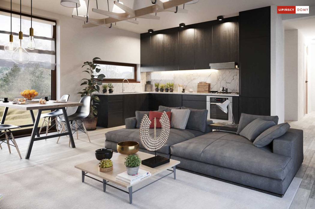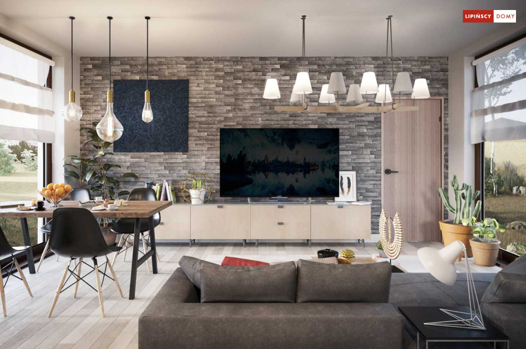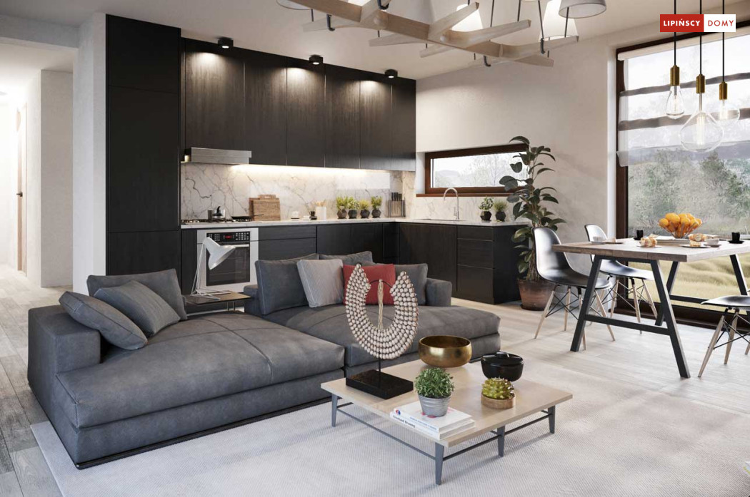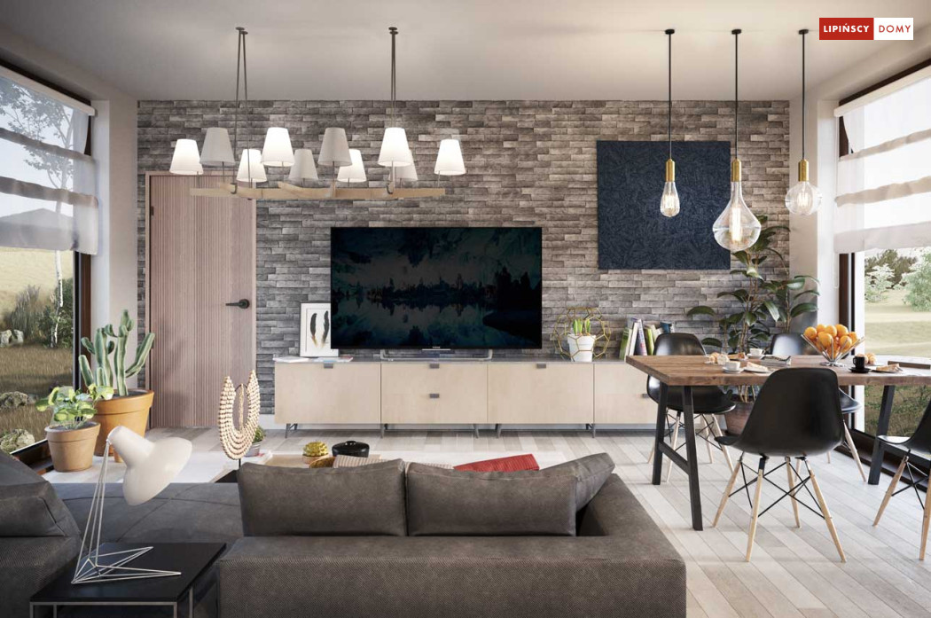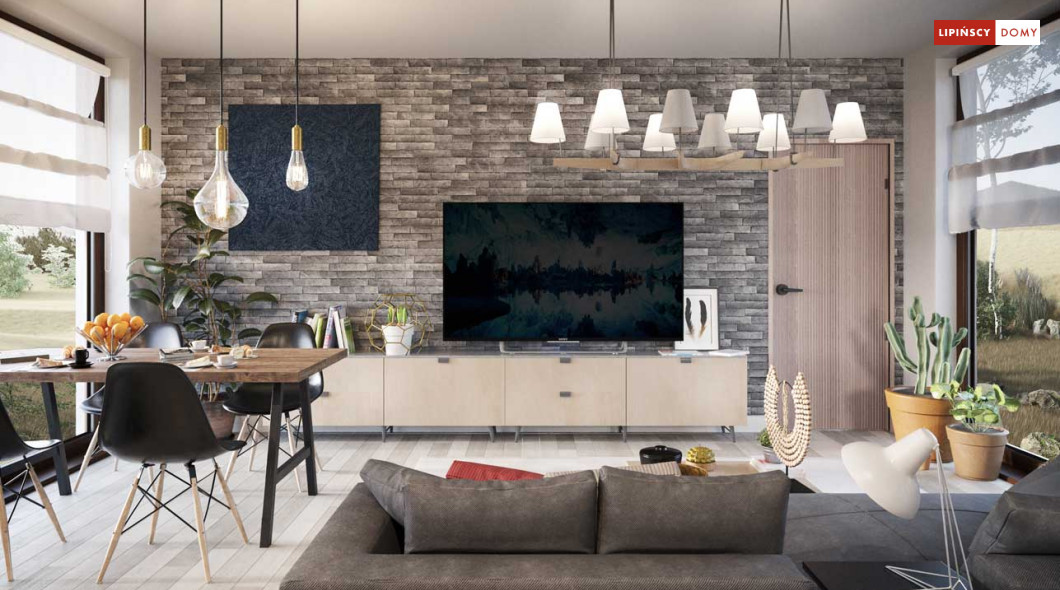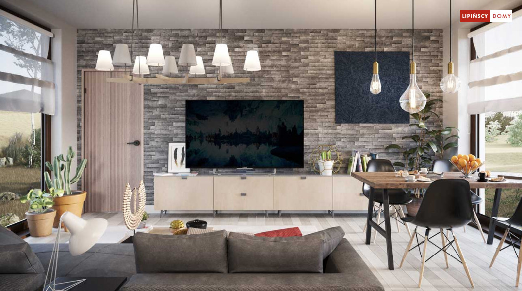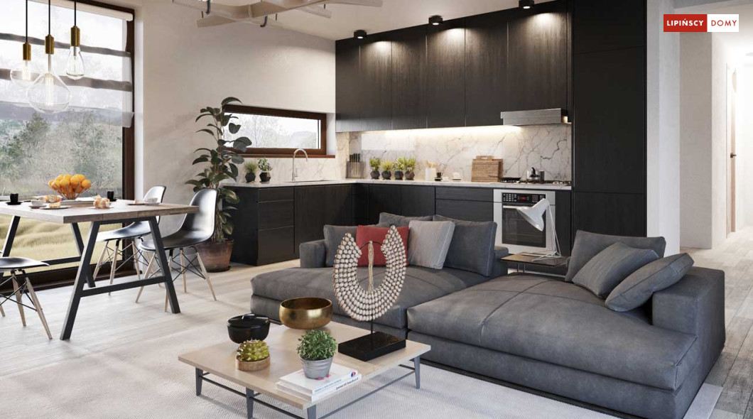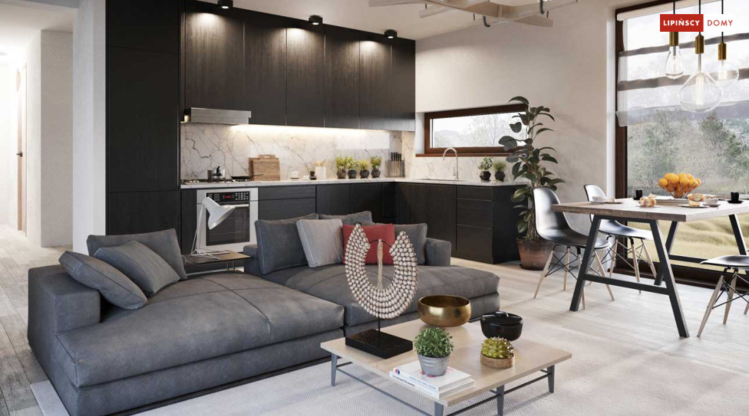 Oryginalny, parterowy dom z płaskim dachem, nowoczesny w formie i w układzie funkcjonalnym. Jest to doskonała propozycja na działki z dużym potencjałem. Przeszklenia są zachwycające i tworzą niepowtarzalny klimat domu. Pokój dzienny stanowi jednoprzestrzenną całość z kuchnią i jadalnią. Oświetlony na przestrzał stanowi serce domu. Stąd jest wejście do apartamentu rodziców z prywatną łazienką. Dwie sypialnie dzieciaków z łazienka są w naprzeciwległej części domu. Jest tu również duże popieszczenie gospodarcze. Rzut domu w kształcie litery L wytwarza atrium wewnętrzne, przekryte pergolą. W okresie letnim jest to bardzo użytkowa i magiczna przestrzeń. Dom jest niewielki powierzchniowo, ale bardzo reprezentacyjny, idealny dla ludzi patrzących w przyszłość. Zastosowano tu ogrzewanie gazowe, instalacje solarną i rekuperację. Możliwa jest zmiana ogrzewania na pompę ciepła.