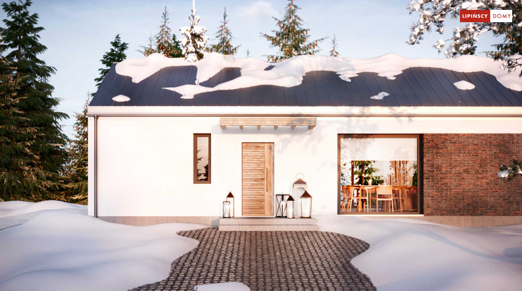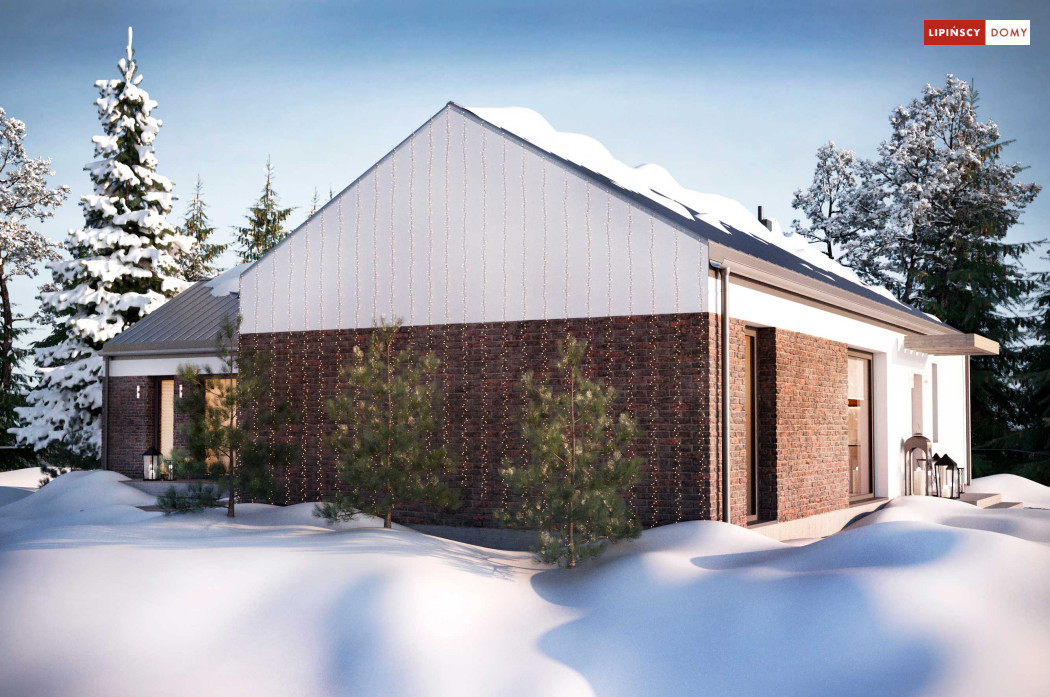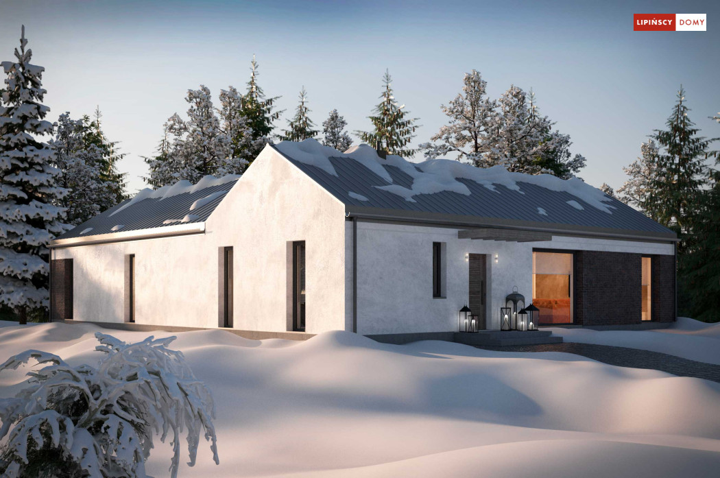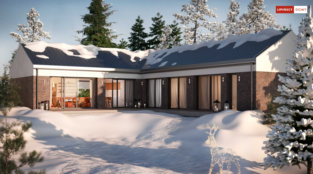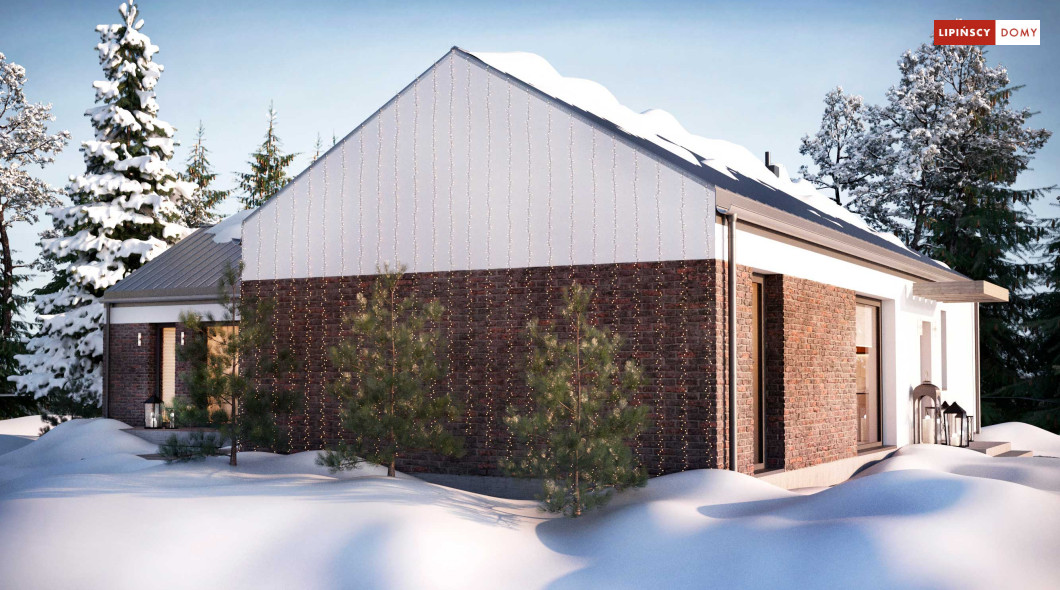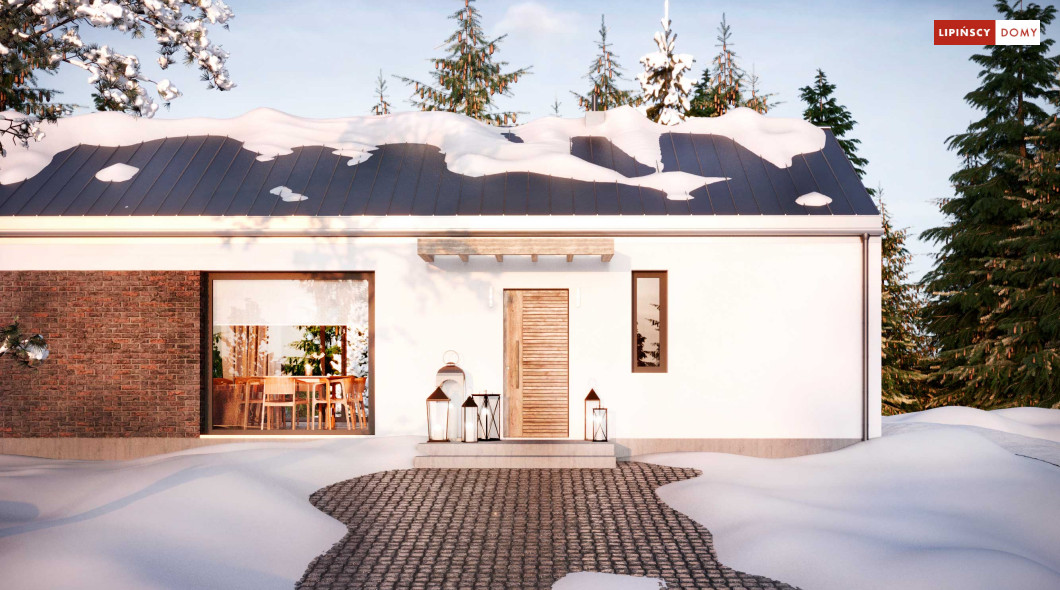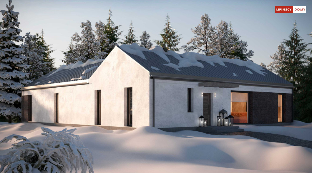 Nowoczesny dom parterowy, z dwuspadowym bez okapowym dachem, na rzucie litery L. Spełnienie marzeń o niewielkim nowoczesnym domu, rozplanowanym wokół wewnętrznego dziedzińca. Ogród jest tu bardzo ważnym elementem użytkowym domu. Wszystkie główne pomieszczenia są usytuowane wokół dziedzińca i posiadają duże przeszklenia umożliwiające bezpośrednie korzystanie z uroków otaczającej natury. Bryła domu również doskonale zespoli się z naturą, przez co dom ten może być intrygującą propozycją dla ludzi ukierunkowanych na ekologiczne rozwiązania i poszanowanie natury. Układ funkcjonalny jest bardzo przejrzysty: część dzienna to otwarta przestrzeń o wysokim wnętrzu, obejmuje salon i kuchnia z jadalnią oraz część nocna to trzy sypialnie, w tym wydzielony apartament rodziców z własną łazienką i garderobą oraz dwie dodatkowe łazienki. Przy wejściu jest pomieszczenie gospodarcze z kotłem gazowym, który może być zamieniony na pompę ciepła w ramach adaptacji do warunków miejscowych. W projekcie przewidziano ogrzewanie kotłem na gaz. Możliwa jest zmiana ogrzewania na pompę ciepła.