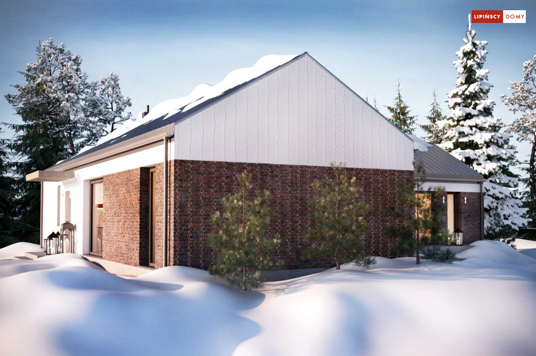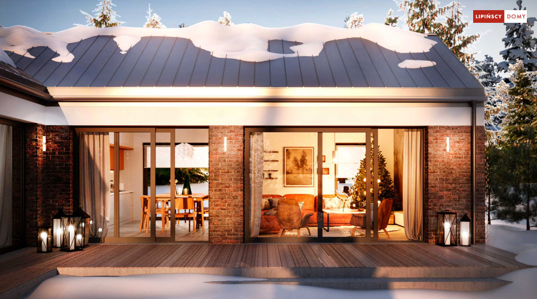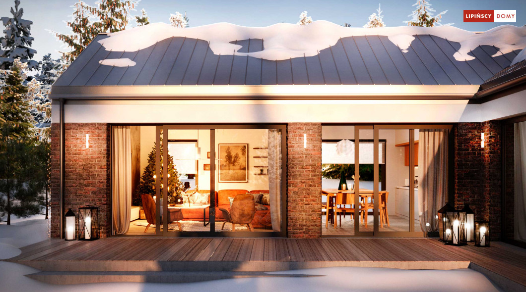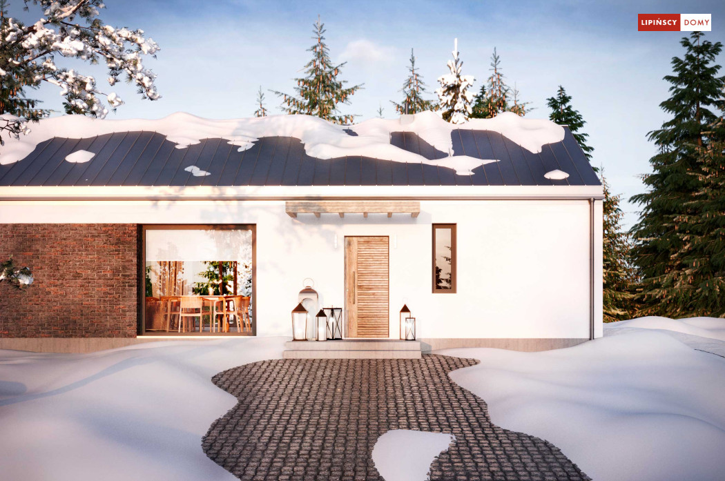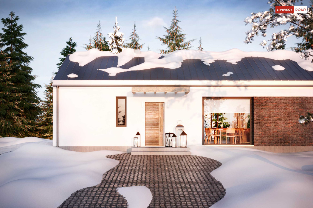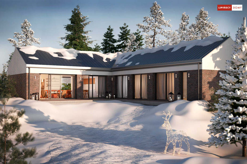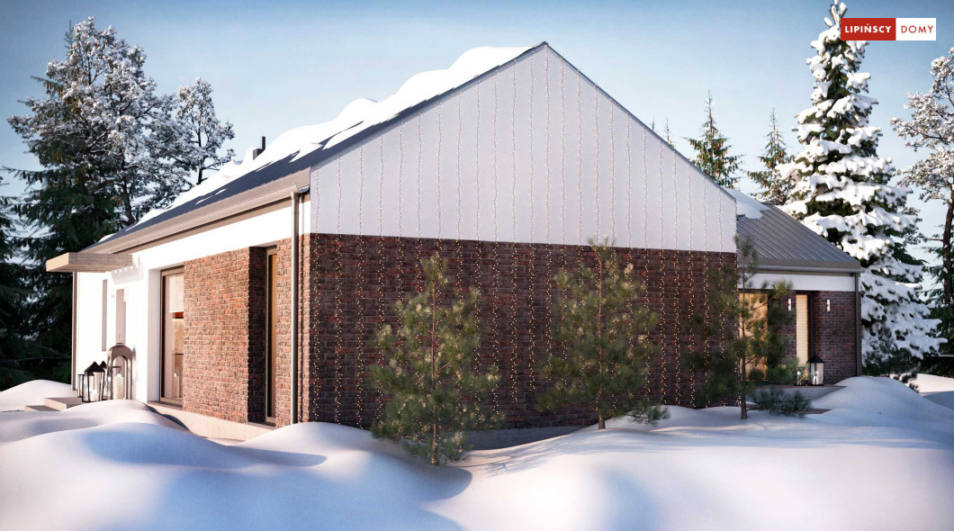 Nowoczesny dom parterowy, z dwuspadowym bez okapowym dachem, na rzucie litery L. Spełnienie marzeń o niewielkim nowoczesnym domu, rozplanowanym wokół wewnętrznego dziedzińca. Ogród jest tu bardzo ważnym elementem użytkowym domu. Wszystkie główne pomieszczenia są usytuowane wokół dziedzińca i posiadają duże przeszklenia umożliwiające bezpośrednie korzystanie z uroków otaczającej natury. Bryła domu również doskonale zespoli się z naturą, przez co dom ten może być intrygującą propozycją dla ludzi ukierunkowanych na ekologiczne rozwiązania i poszanowanie natury. Układ funkcjonalny jest bardzo przejrzysty: część dzienna to otwarta przestrzeń o wysokim wnętrzu, obejmuje salon i kuchnia z jadalnią oraz część nocna to trzy sypialnie, w tym wydzielony apartament rodziców z własną łazienką i garderobą oraz dwie dodatkowe łazienki. Przy wejściu jest pomieszczenie gospodarcze z kotłem gazowym, który może być zamieniony na pompę ciepła w ramach adaptacji do warunków miejscowych. W projekcie przewidziano ogrzewanie kotłem na gaz. Możliwa jest zmiana ogrzewania na pompę ciepła.