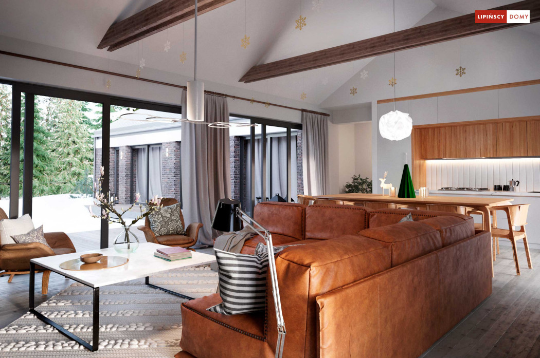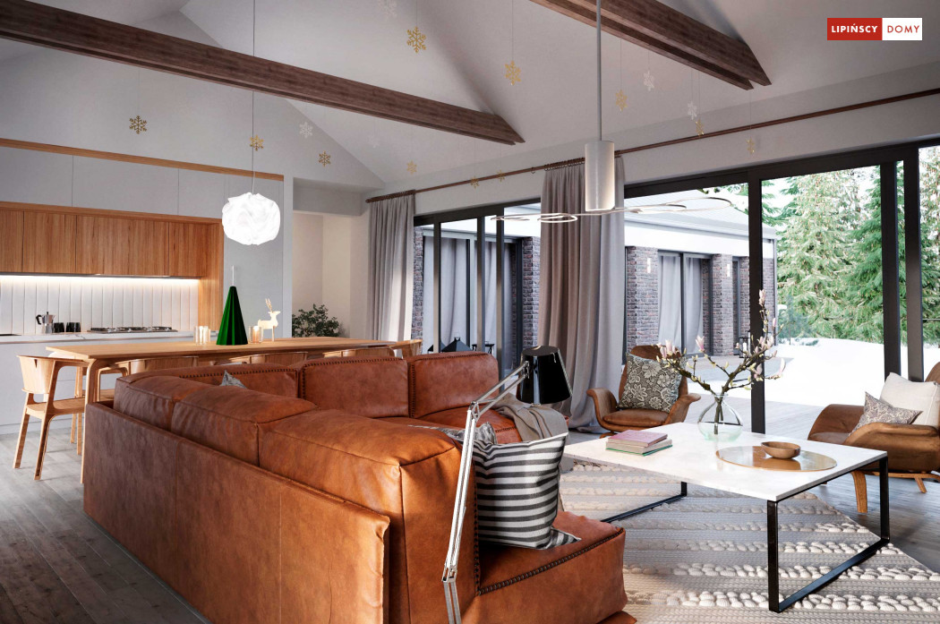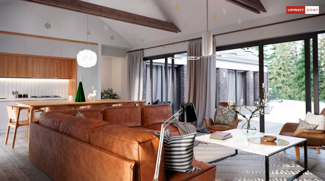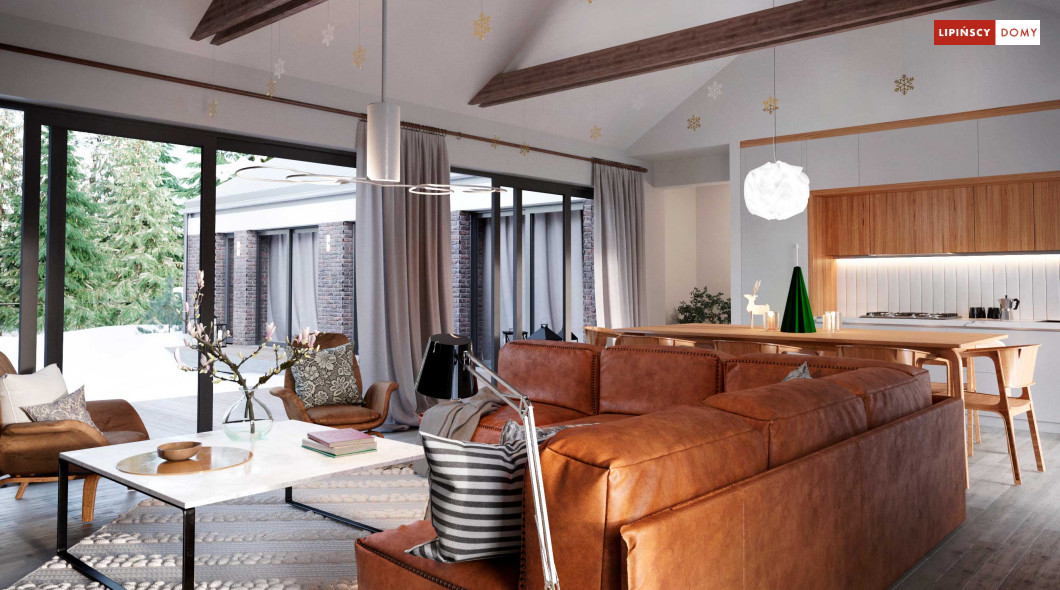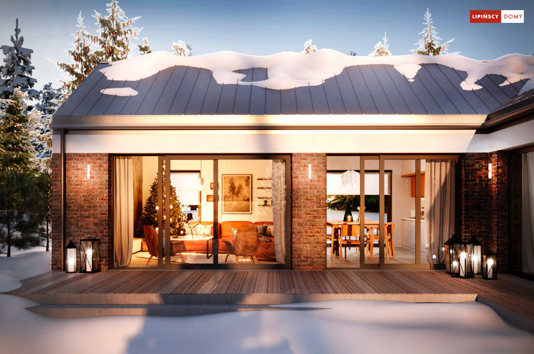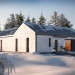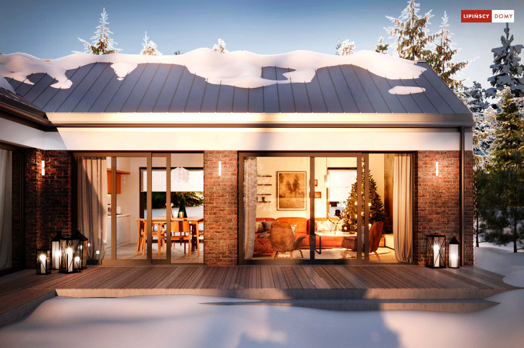 Nowoczesny dom parterowy, z dwuspadowym bez okapowym dachem, na rzucie litery L. Spełnienie marzeń o niewielkim nowoczesnym domu, rozplanowanym wokół wewnętrznego dziedzińca. Ogród jest tu bardzo ważnym elementem użytkowym domu. Wszystkie główne pomieszczenia są usytuowane wokół dziedzińca i posiadają duże przeszklenia umożliwiające bezpośrednie korzystanie z uroków otaczającej natury. Bryła domu również doskonale zespoli się z naturą, przez co dom ten może być intrygującą propozycją dla ludzi ukierunkowanych na ekologiczne rozwiązania i poszanowanie natury. Układ funkcjonalny jest bardzo przejrzysty: część dzienna to otwarta przestrzeń o wysokim wnętrzu, obejmuje salon i kuchnia z jadalnią oraz część nocna to trzy sypialnie, w tym wydzielony apartament rodziców z własną łazienką i garderobą oraz dwie dodatkowe łazienki. Przy wejściu jest pomieszczenie gospodarcze z kotłem gazowym, który może być zamieniony na pompę ciepła w ramach adaptacji do warunków miejscowych. W projekcie przewidziano ogrzewanie kotłem na gaz. Możliwa jest zmiana ogrzewania na pompę ciepła.
