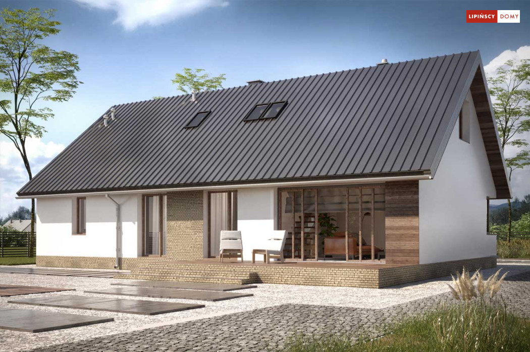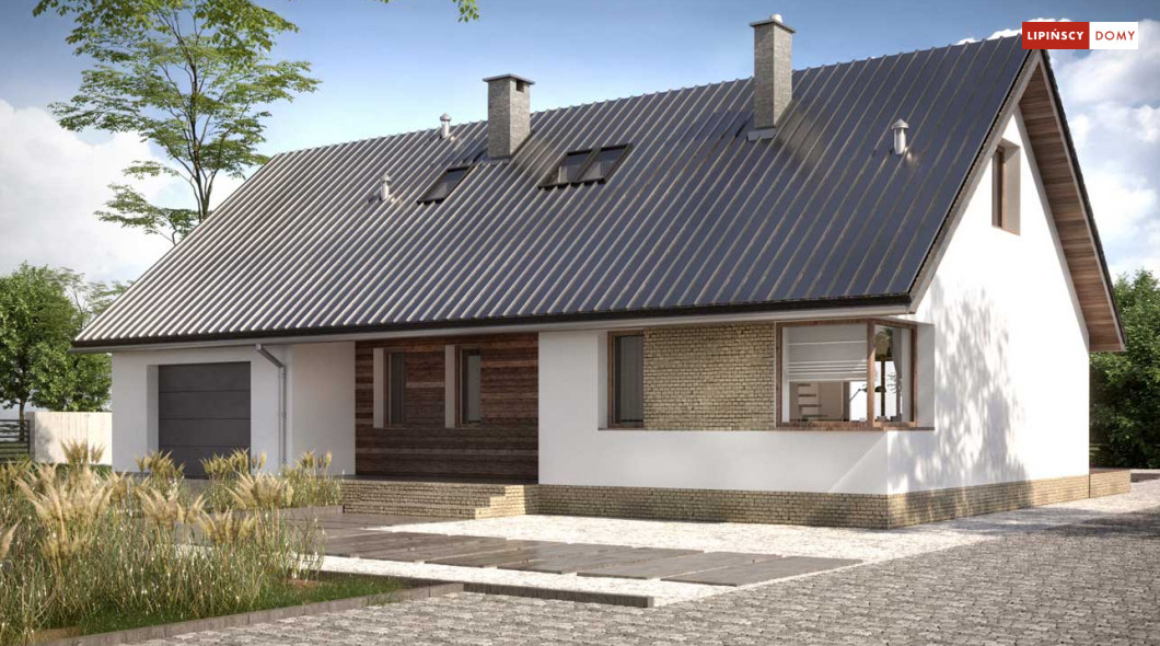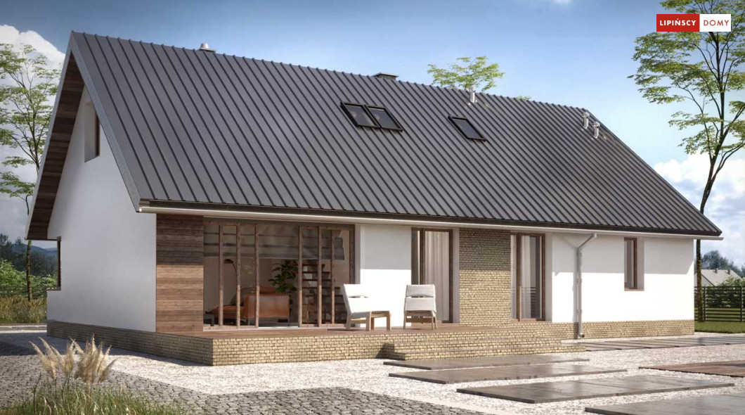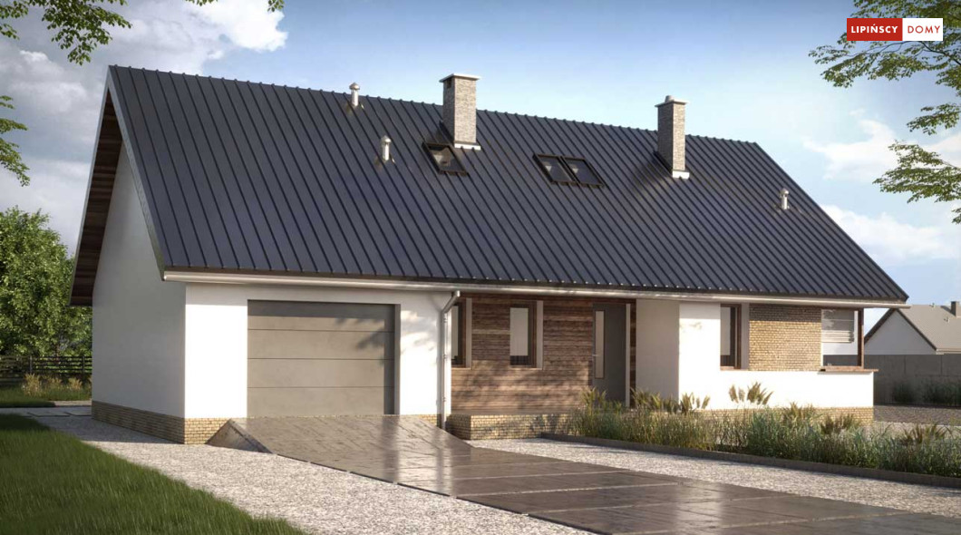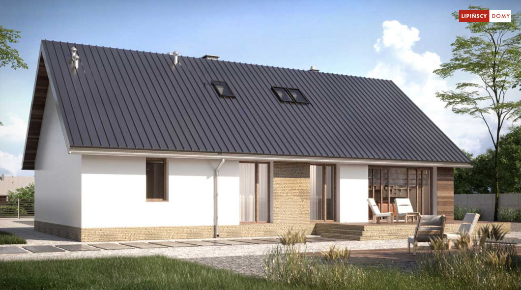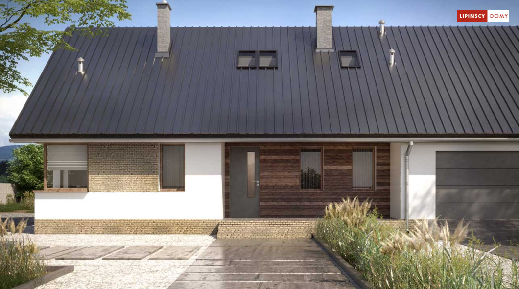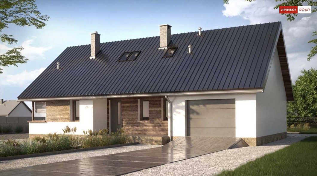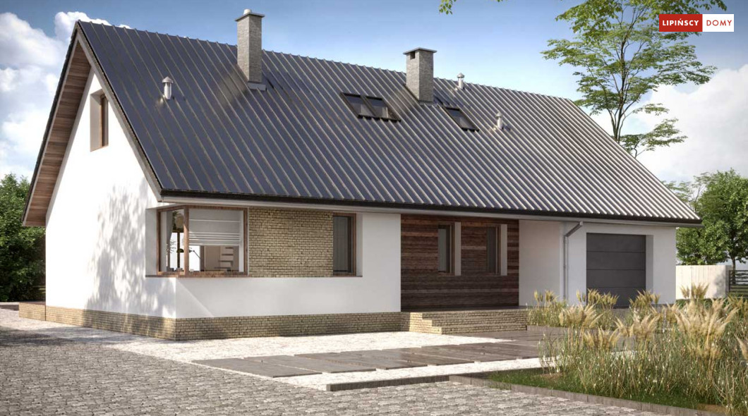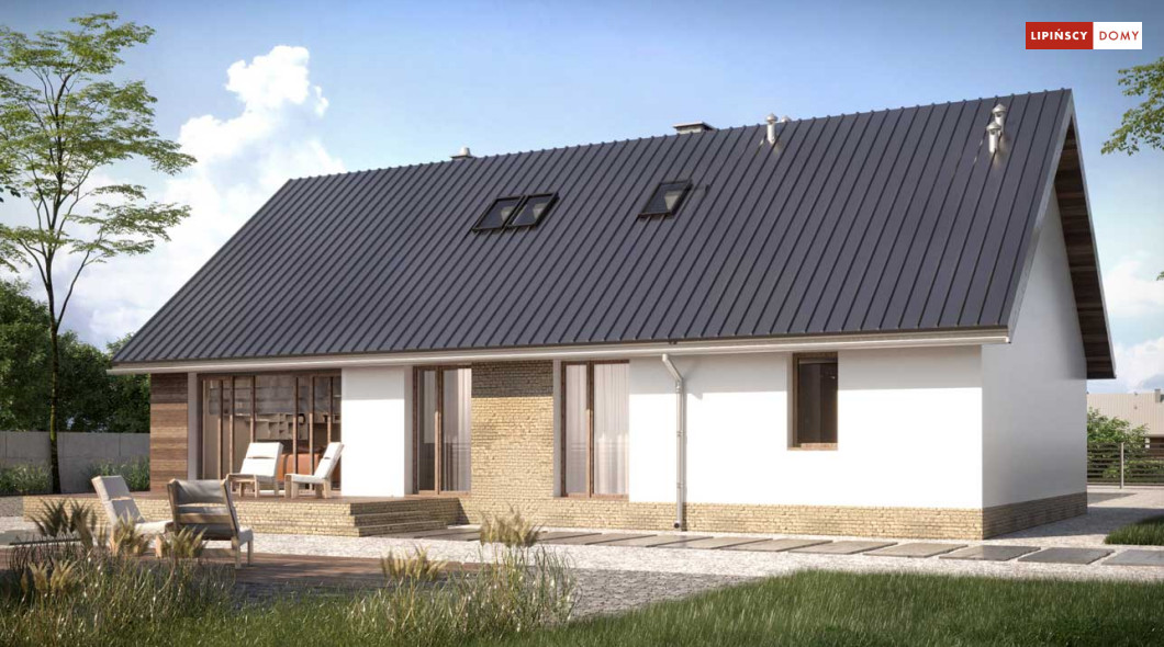 Parterowy dom jednorodzinny z możliwością adaptacji poddasza. Parter to wysoki pokój dzienny otwarty na kuchnię ze spiżarką. Są tu schody na antresolę, na której jest duża przestrzeń użytkowa z łazienką, gdzie może powstać, zależnie od potrzeb, dodatkowy apartament rodziców bądź pracownia. Na parterze są też dwie sypialnie, dwie łazienki, pralnia oraz przestrzeń gospodarcza: obszerny garaż i pomieszczenie pomocnicze. Bryła domu jest przekryta dwuspadowym dachem, jest to bardzo ekonomiczne rozwiązanie. W tym małym domu przestrzeń jest idealnie rozplanowana, zapewnia komfort każdemu domownikowi. Możliwość adaptacji poddasza sprawia, że dom doskonale sprawdzi się przy zmieniających się oczekiwaniach mieszkańców. Można również realizować ten dom etapowo. W projekcie przewidziano ogrzewanie pompą ciepła.