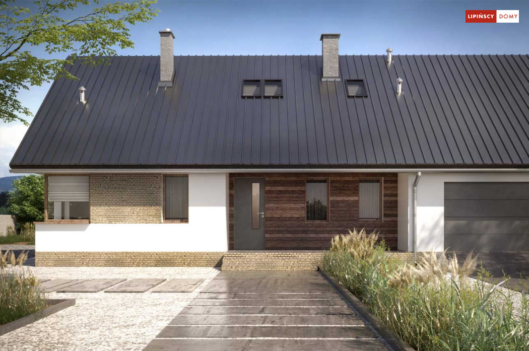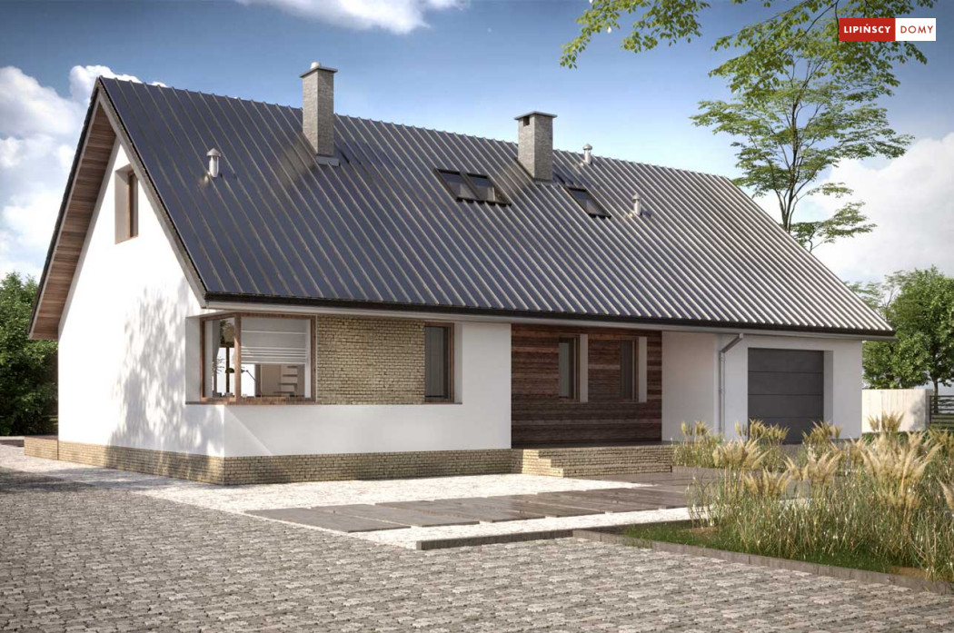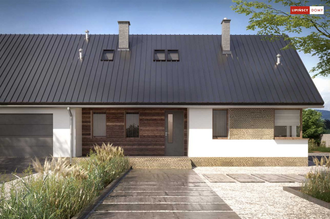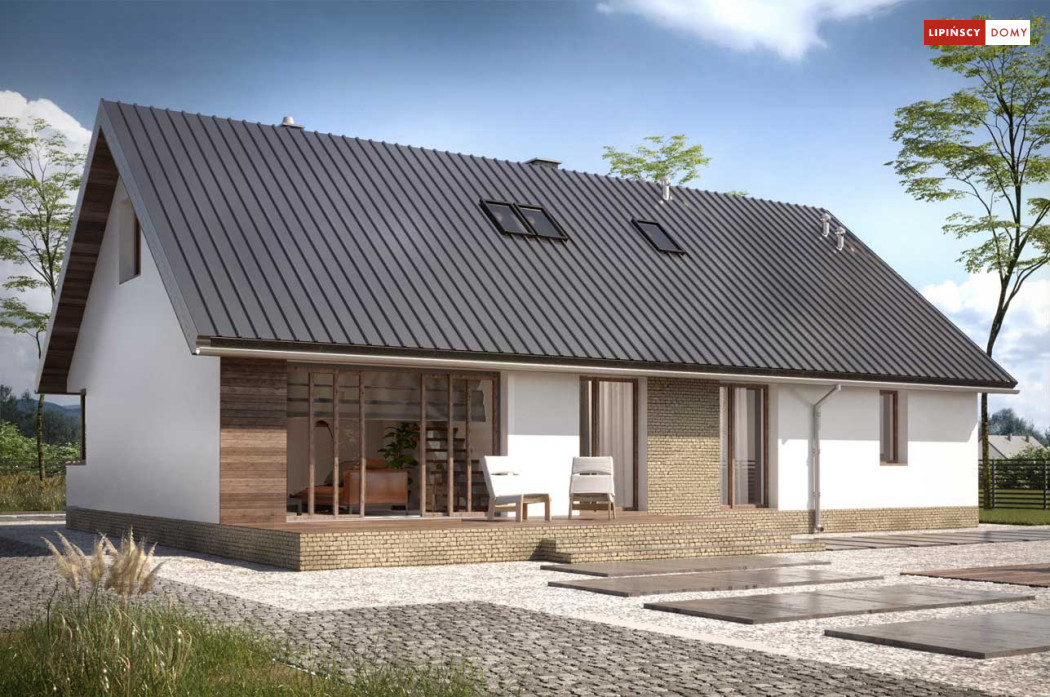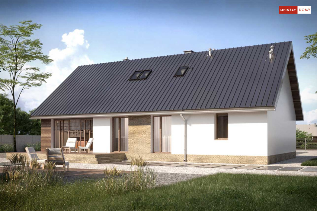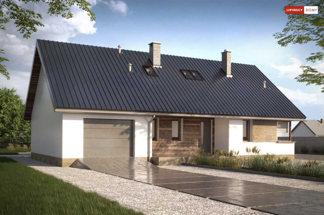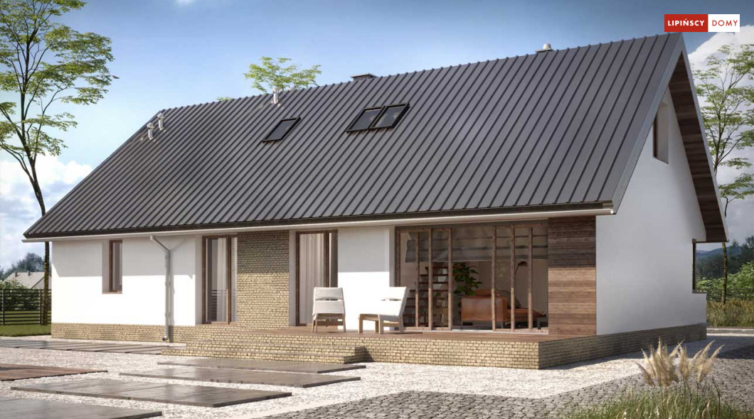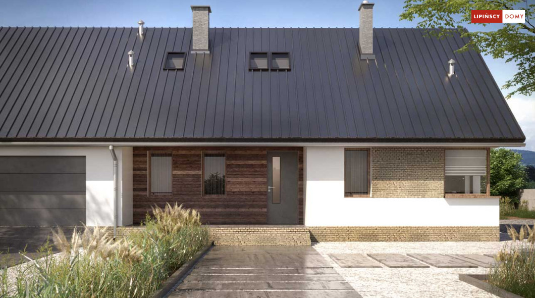 Parterowy dom jednorodzinny z możliwością adaptacji poddasza. Parter to wysoki pokój dzienny otwarty na kuchnię ze spiżarką. Są tu schody na antresolę, na której jest duża przestrzeń użytkowa z łazienką, gdzie może powstać, zależnie od potrzeb, dodatkowy apartament rodziców bądź pracownia. Na parterze są też dwie sypialnie, dwie łazienki, pralnia oraz przestrzeń gospodarcza: obszerny garaż i pomieszczenie pomocnicze. Bryła domu jest przekryta dwuspadowym dachem, jest to bardzo ekonomiczne rozwiązanie. W tym małym domu przestrzeń jest idealnie rozplanowana, zapewnia komfort każdemu domownikowi. Możliwość adaptacji poddasza sprawia, że dom doskonale sprawdzi się przy zmieniających się oczekiwaniach mieszkańców. Można również realizować ten dom etapowo. W projekcie przewidziano ogrzewanie pompą ciepła.