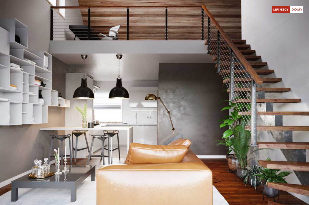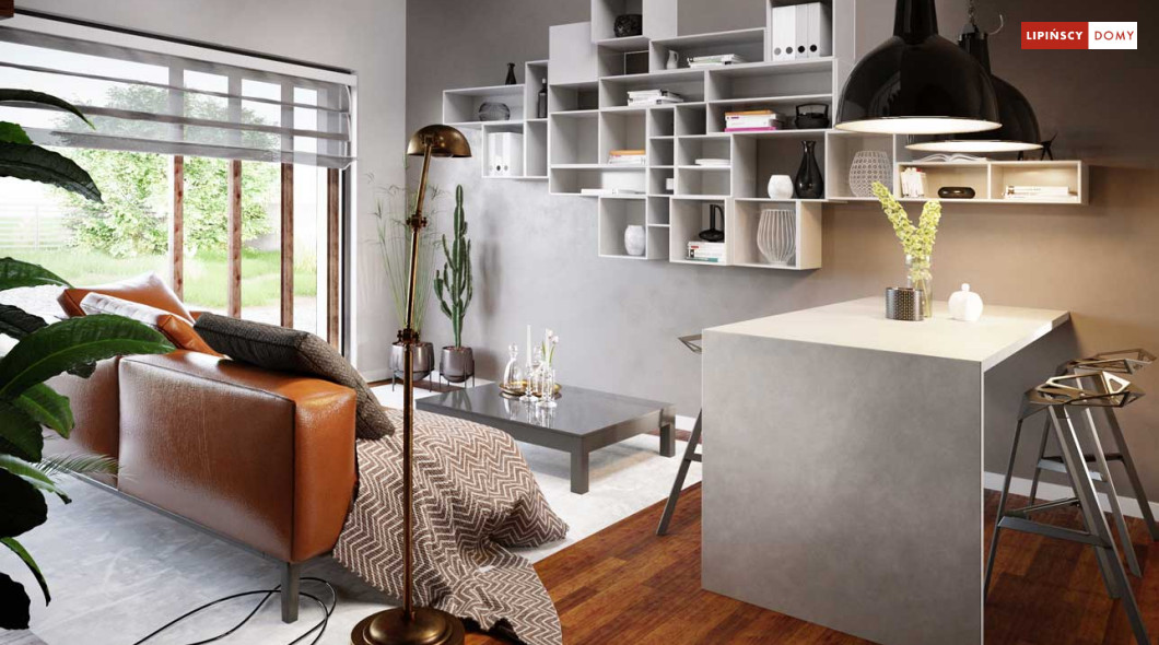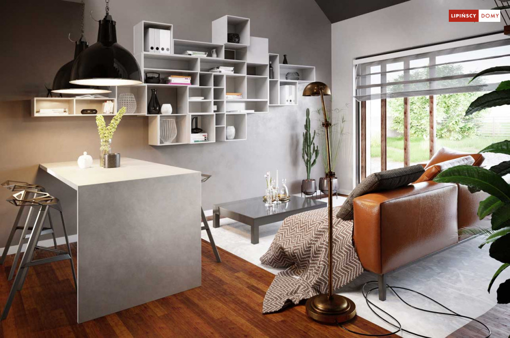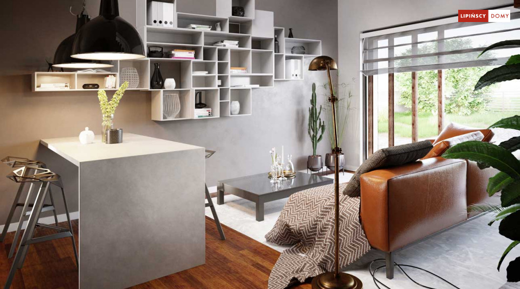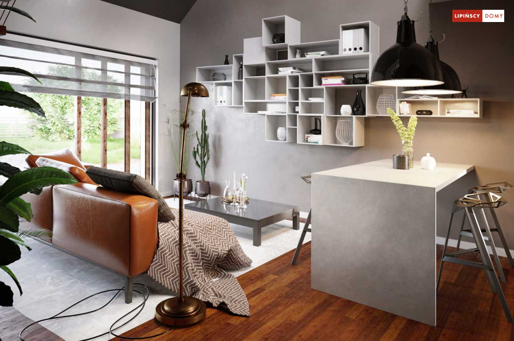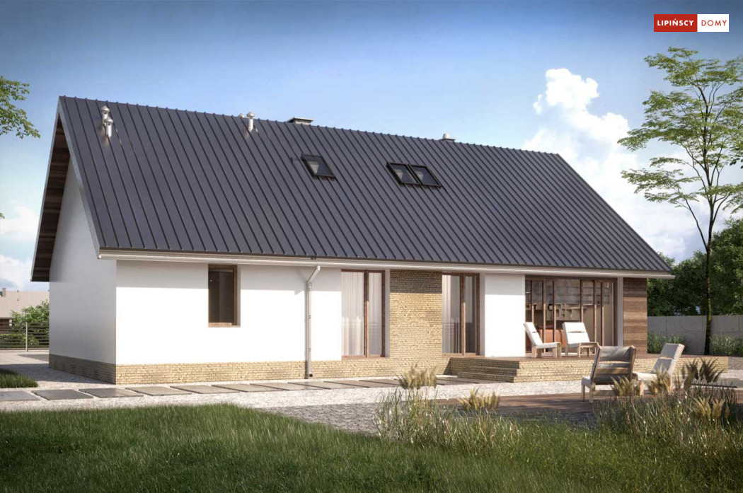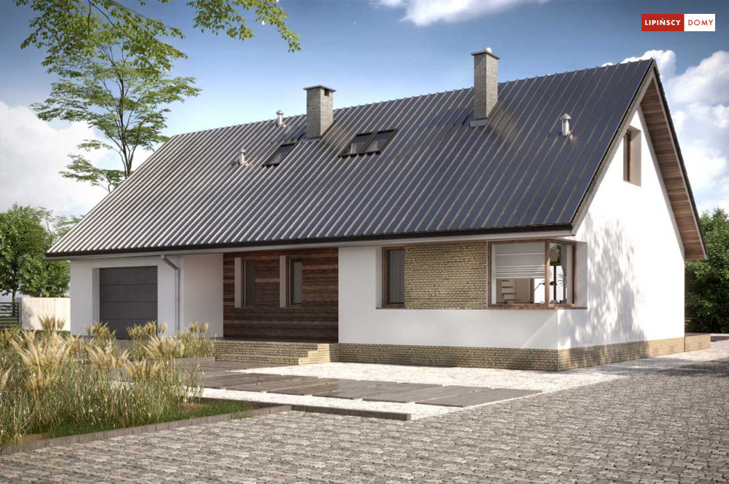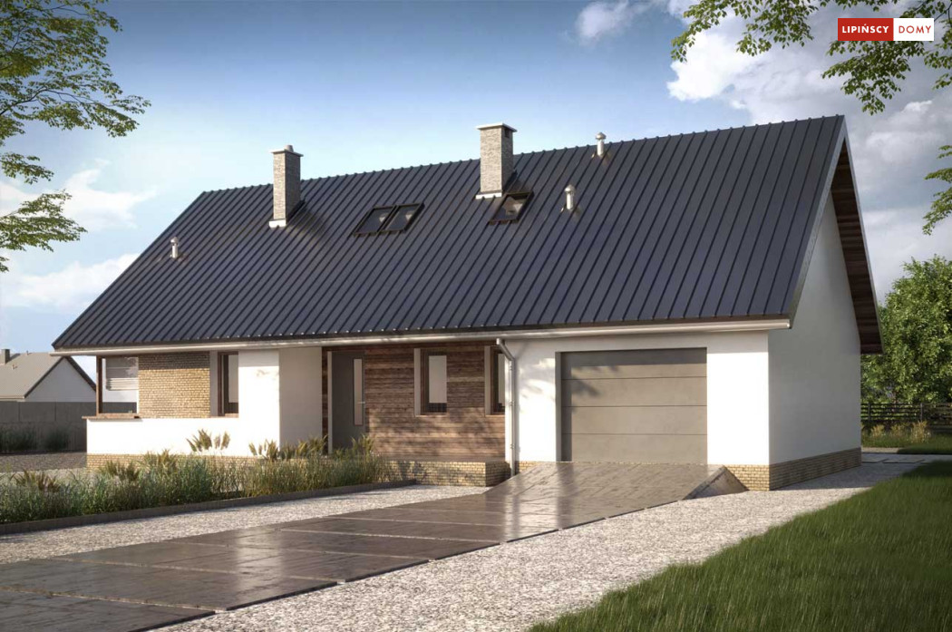 Parterowy dom jednorodzinny z możliwością adaptacji poddasza. Parter to wysoki pokój dzienny otwarty na kuchnię ze spiżarką. Są tu schody na antresolę, na której jest duża przestrzeń użytkowa z łazienką, gdzie może powstać, zależnie od potrzeb, dodatkowy apartament rodziców bądź pracownia. Na parterze są też dwie sypialnie, dwie łazienki, pralnia oraz przestrzeń gospodarcza: obszerny garaż i pomieszczenie pomocnicze. Bryła domu jest przekryta dwuspadowym dachem, jest to bardzo ekonomiczne rozwiązanie. W tym małym domu przestrzeń jest idealnie rozplanowana, zapewnia komfort każdemu domownikowi. Możliwość adaptacji poddasza sprawia, że dom doskonale sprawdzi się przy zmieniających się oczekiwaniach mieszkańców. Można również realizować ten dom etapowo. W projekcie przewidziano ogrzewanie pompą ciepła.