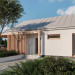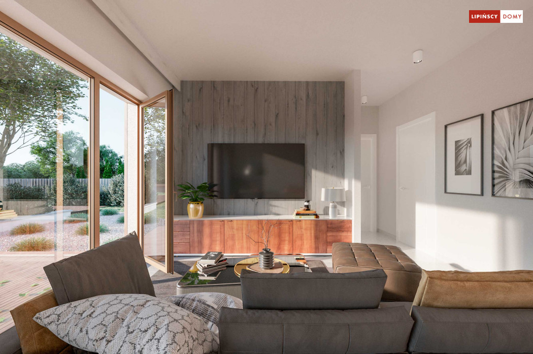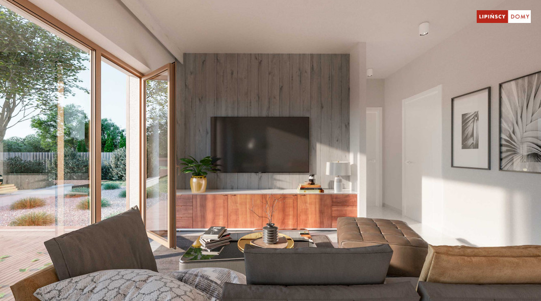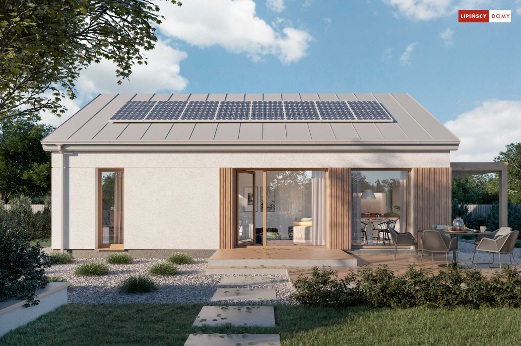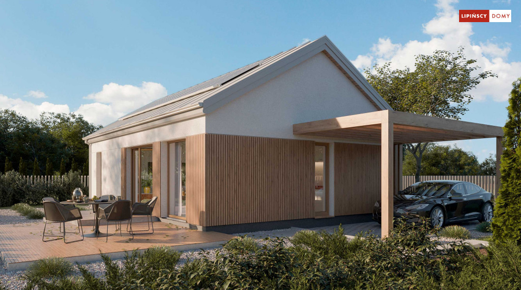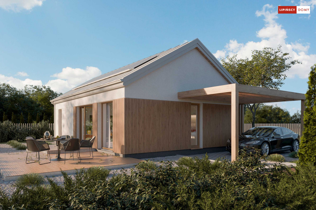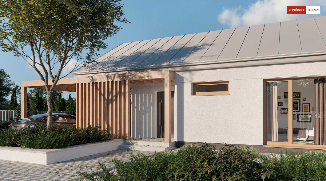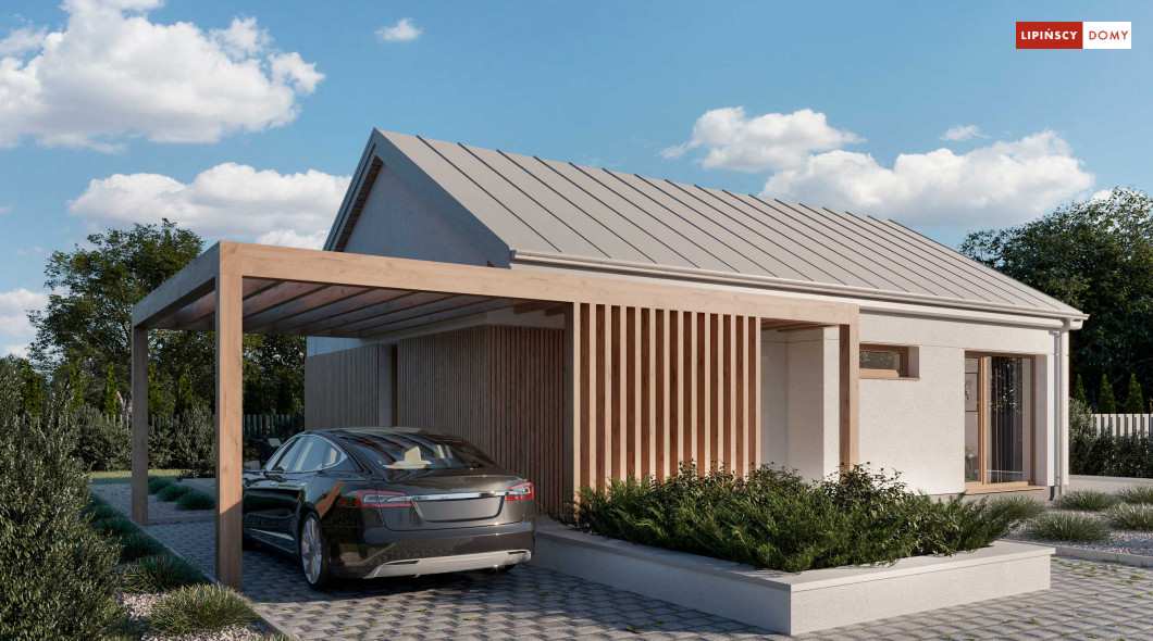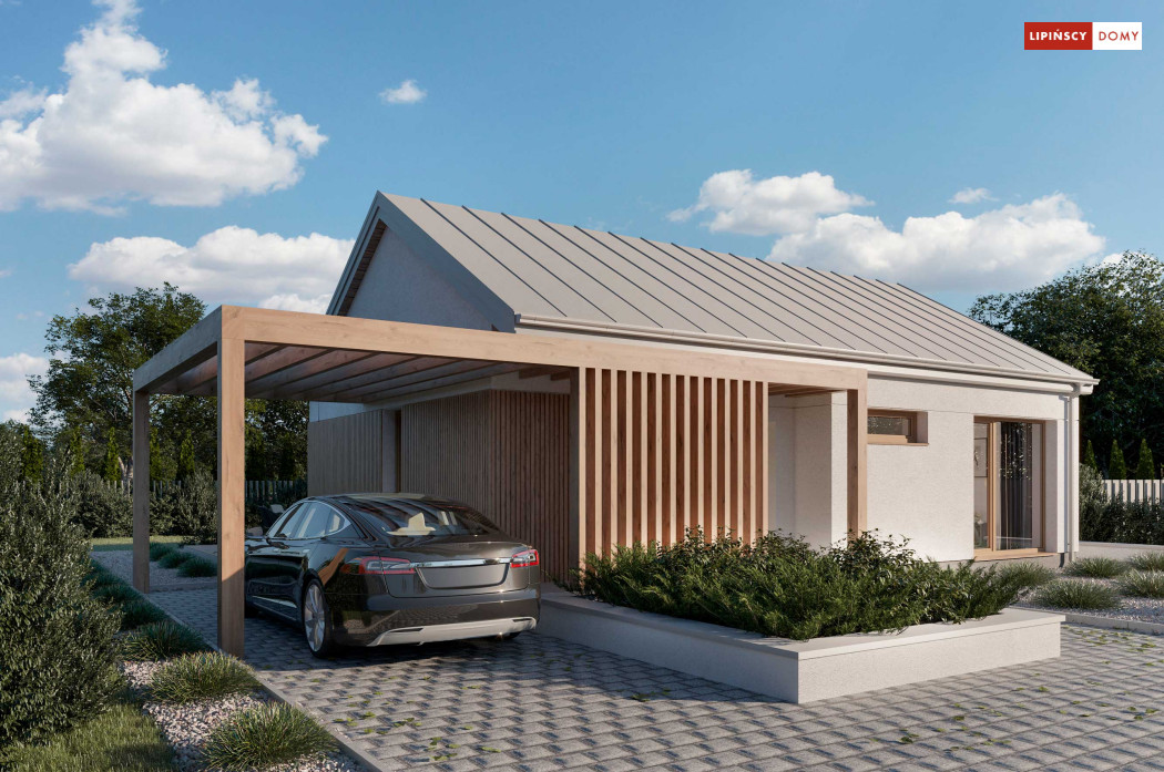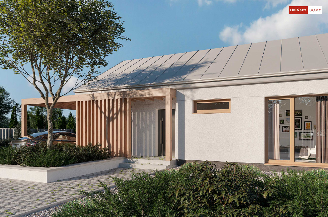 Projekt domu Tenna to niewielki energooszczędny dom parterowy z dwuspadowym dachem i ciekawą drewnianą pergolą wejściową z wiatą. Spore przeszklenia powiększają optycznie pomieszczenia i nadają bryle budynku nowoczesnego rysu. Minimalna powierzchnia komunikacyjna pozwala w pełni wykorzystać powierzchnię domu. Przestrzeń dzienna to salon z aneksem kuchennym, a w części nocnej znajdują się dwie sypialnie z łazienką. Przewidziana została osobna kotłownia z nowoczesną pompą ciepła i rekuperatorem, a w wiatrołapie zmieści się spora szafa ubraniowa.