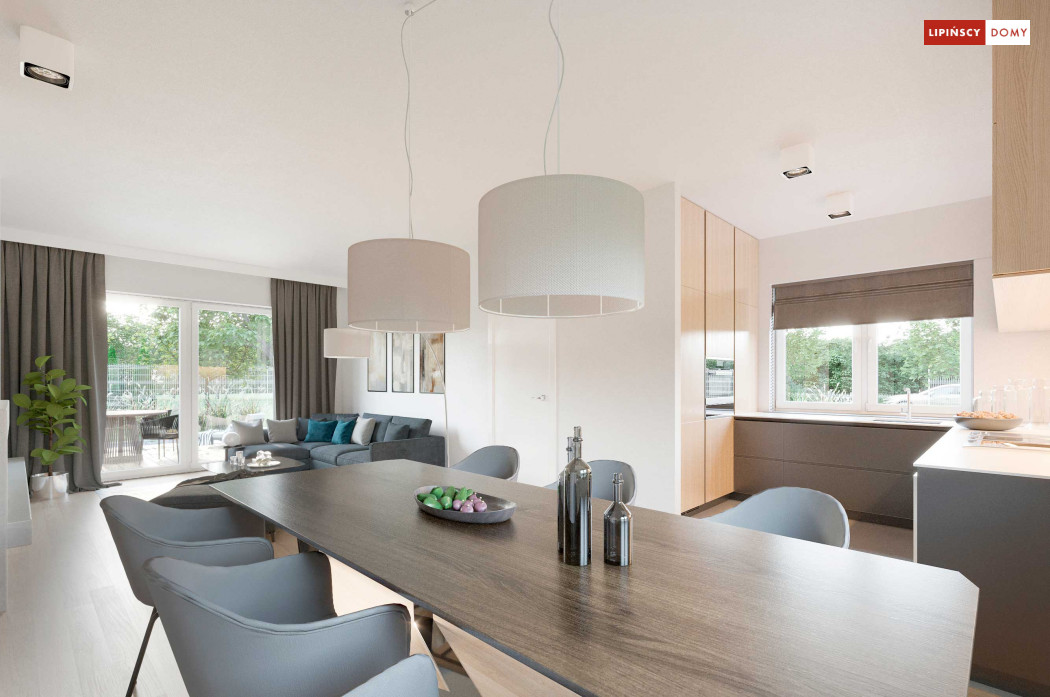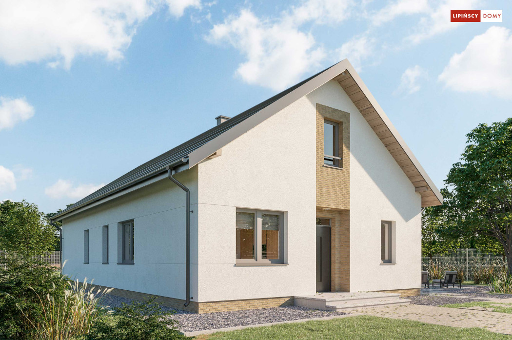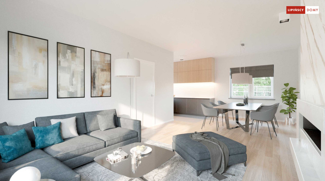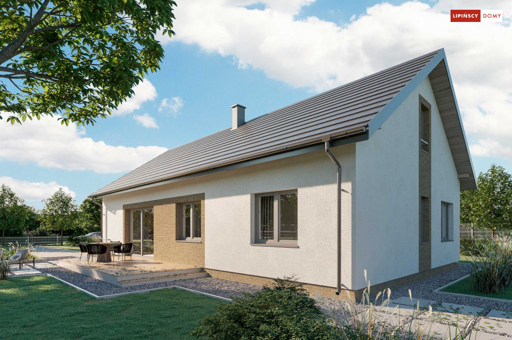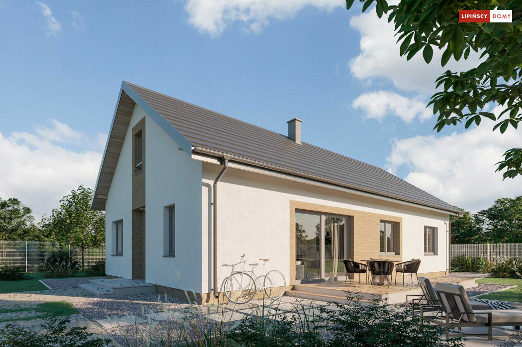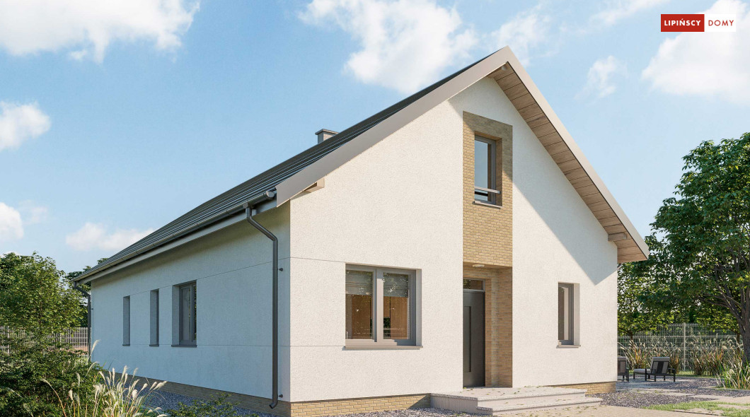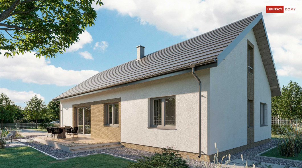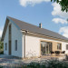 Projekt Derby to energooszczędny parterowy dom z dwuspadowym dachem i możliwością adaptacji 60 m2. poddasza. Kształt wydłużonego prostokąta predysponuje dom do lokalizacji na wąskich działkach. Od wejścia wchodzimy do otwartej części dziennej salonu, jadalni i kuchni, doświetlonej z trzech stron. W dalszej części domu króluje strefa prywatna z trzema sypialniami i łazienką. Program funkcjonalny domu uzupełniony jest o pom. gospodarcze od wejścia, a w głębi domu spiżarnię, wc i pralnię, w której zmieszczą się schody na strych. W projekcie przewidziano ogrzewanie pompą ciepła.