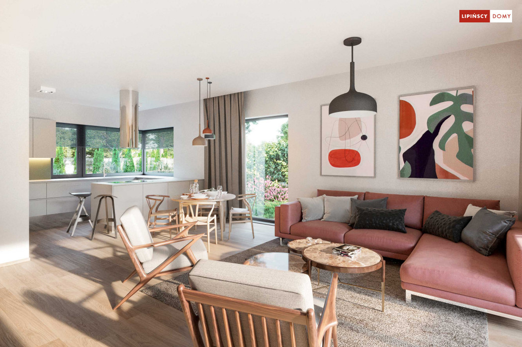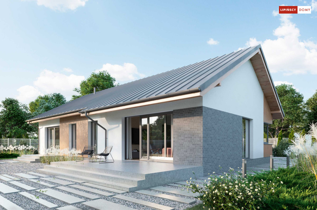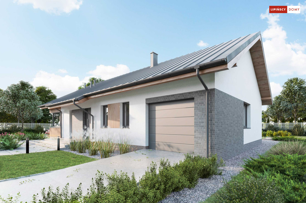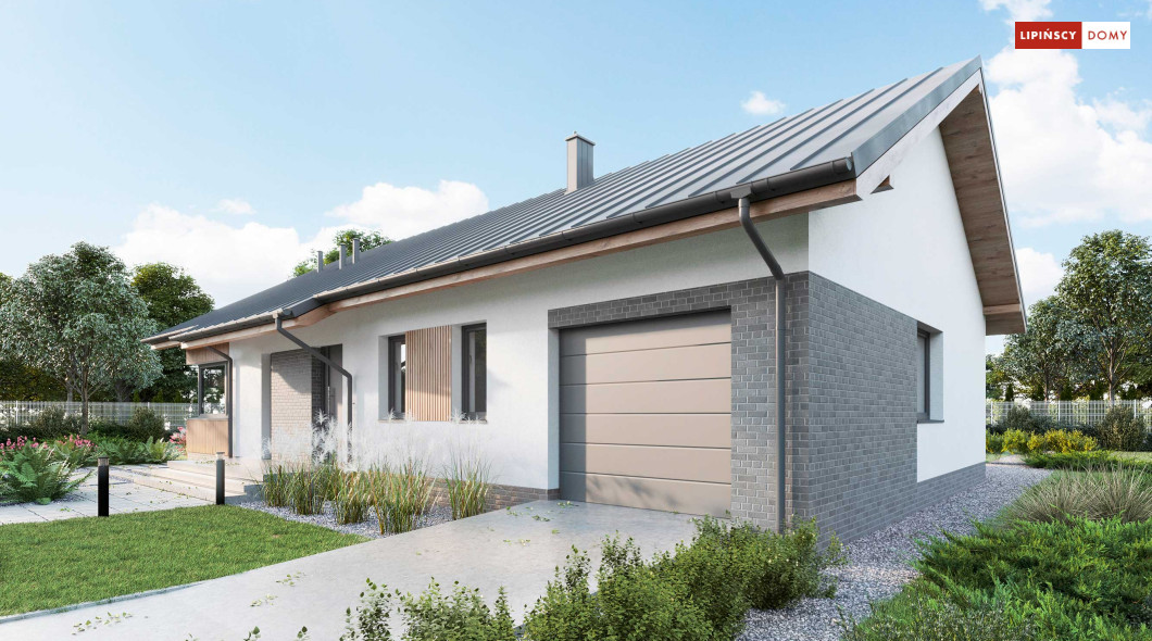 Projekt domu Arosa w wersji V ma jednostanowiskowy garaż schowany w bryle domu, pod jednym dachem z częścią mieszkalną. Jednokondygnacyjne wnętrze dzieli się na strefy: dzienną - z kuchnią i salonem, wejściową, w której znajduje się spora szafa w wiatrołapie, a w korytarzu schody opuszczane na strych i wejście do ogólnodostępnej łazienki oraz część prywatną - z trzema sypialniami, większą łazienką oraz pomieszczeniem gospodarczym z przejściem do garażu. Największą ozdobą domu są duże okna do podłogi w pokojach, a w kuchni piękne okno narożne. W projekcie przewidziano ogrzewanie kotłem na gaz. Możliwa jest zmiana ogrzewania na pompę ciepła.