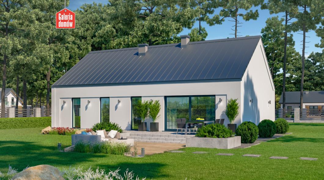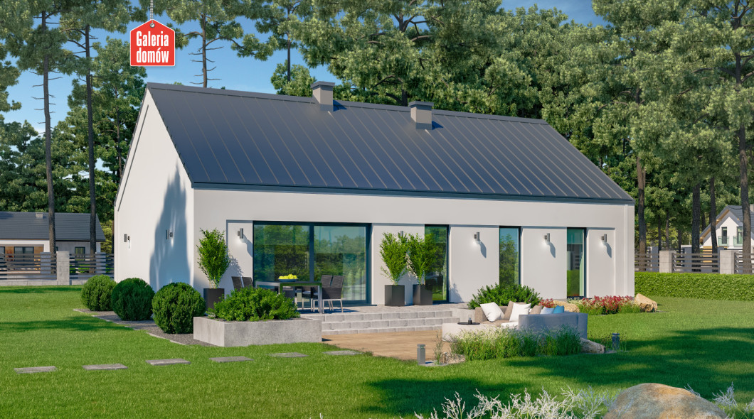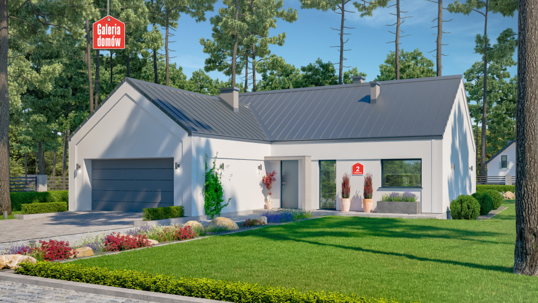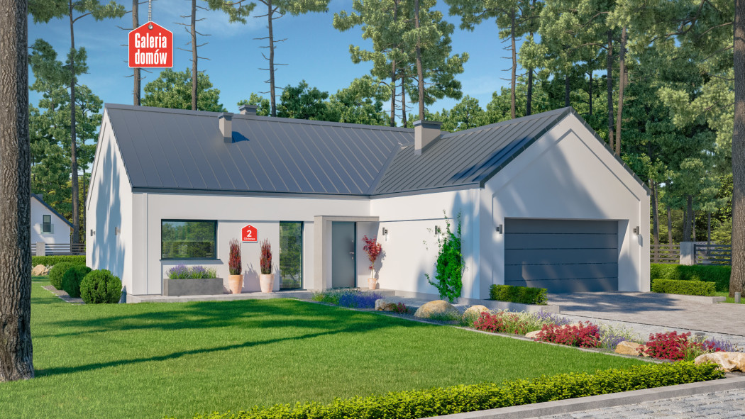 Gotowy projekt Dom przy Olchowej 2 to nowoczesny budynek jednorodzinny z dachem dwuspadowym. Dom parterowy o powierzchni użytkowej 100 m². Szybki w budowie i oszczędny w eksploatacji. Układ funkcjonalny zakłada 4 pokoje, otwartą kuchnię, salon, łazienkę, toaletę, oraz kotłownię z miejscem na pralnię. Projekt domu z podwójnym garażem. Dach bezokapowy, biało-czarna kolorystyka dachu i elewacji, stolarka w kolorze inox . Projekt został przygotowany w oparciu o warunki techniczne WT 2021. Technologia budowy tradycyjna – murowana. Dom przy Olchowej 2 został wyposażony dodatkowo w schematy wentylacji mechanicznej z rekuperacją oraz instalację solarną.