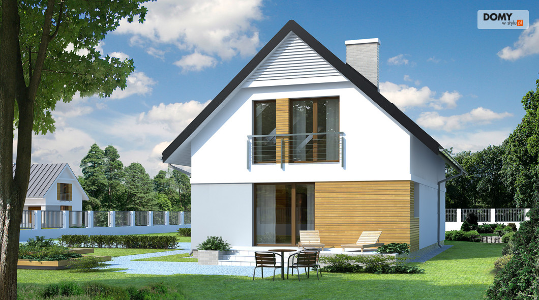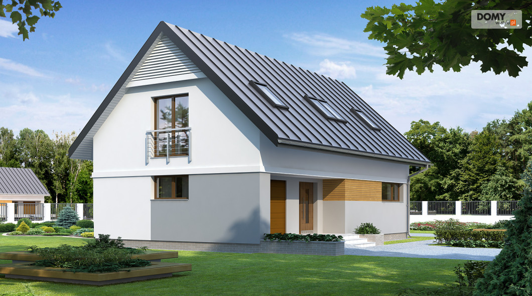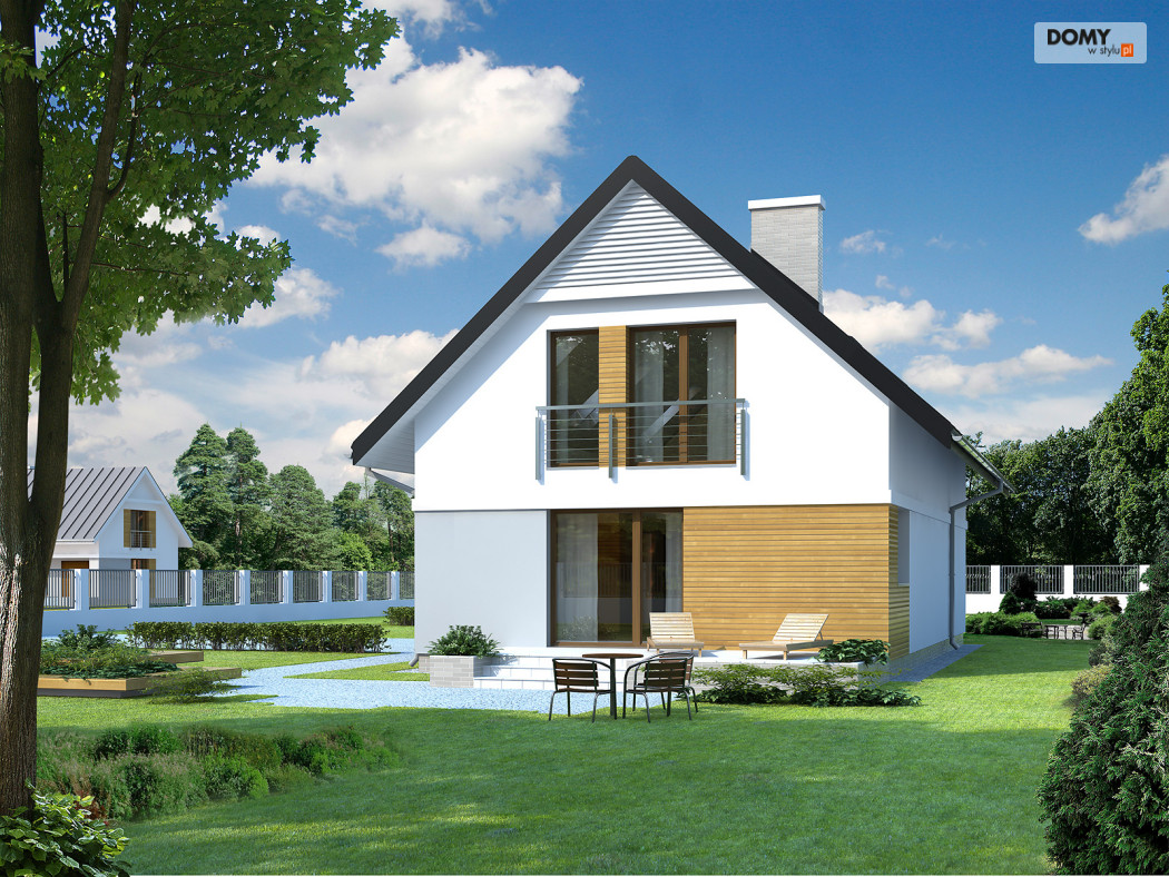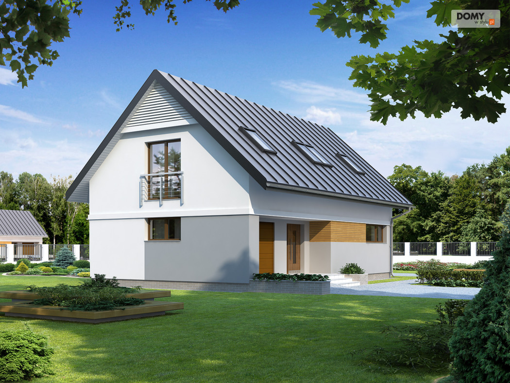 Niewielki, ale wygodny dom na wąską działkę. Prosta, nowoczesna bryła przekryta dwuspadowym dachem oraz tradycyjna technologia budowy czynią dom tanim i dostępnym. Zlokalizowana na parterze część dzienna mieści w sobie pokój dzienny z jadalnią i kuchnię, dodatkowo znajdują się tu: łazienka, kotłownia i jednostanowiskowy garaż. Na poddaszu znajdują się: cztery, dobrze doświetlone sypialnie, jedna z garderobą i łazienka. Do bryły domu przylega letni salon – rozległy taras. Dom ma niewielkie wymiary i z powodzeniem zmieści się na wąskiej działce, także z wjazdem od południa.
