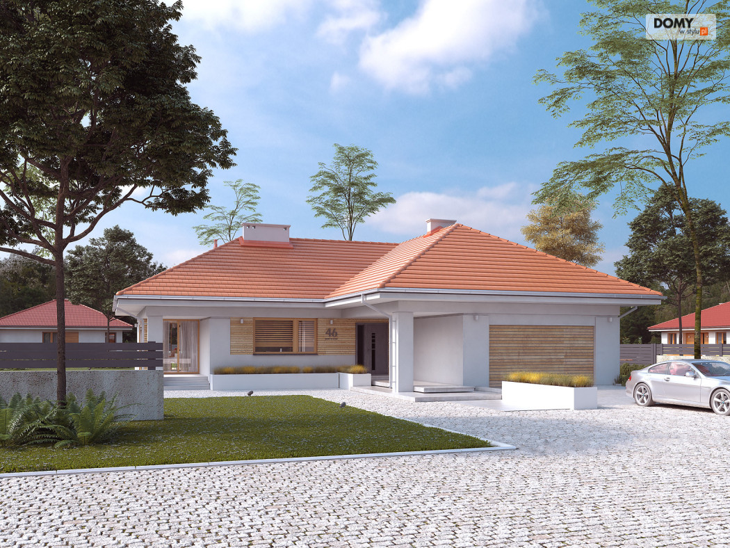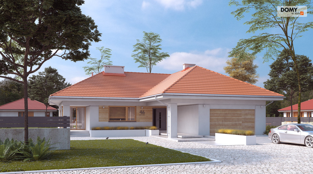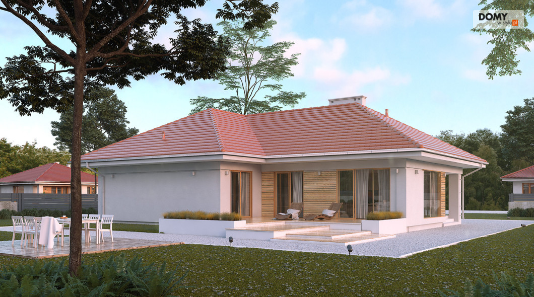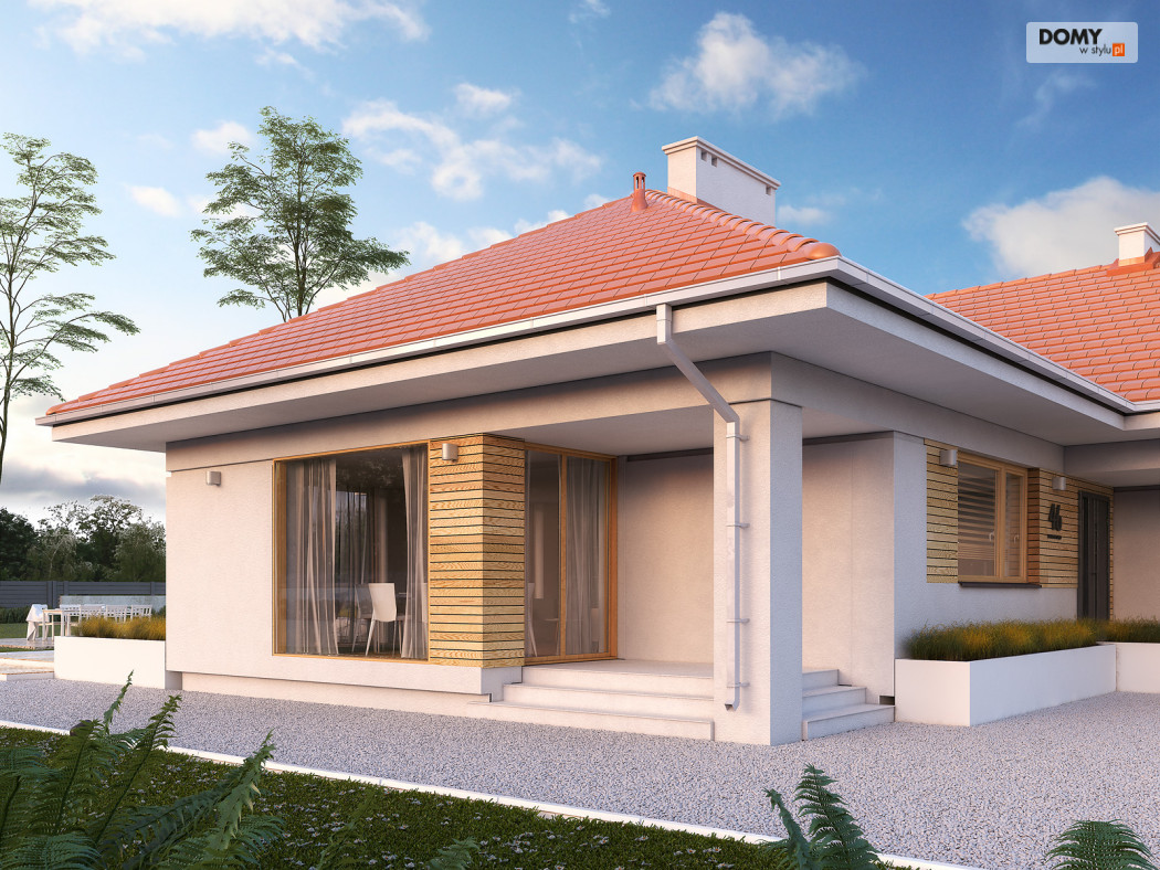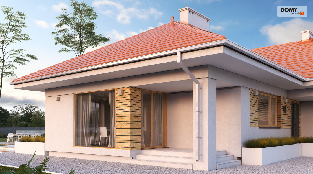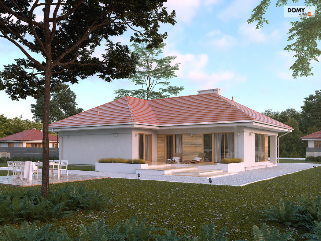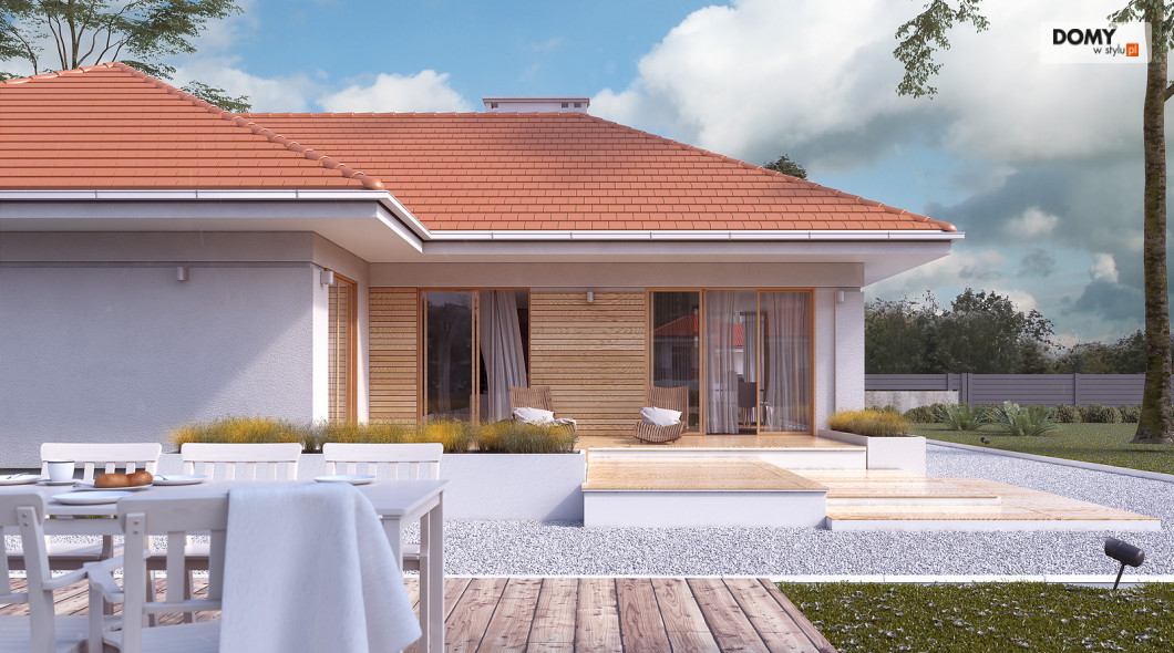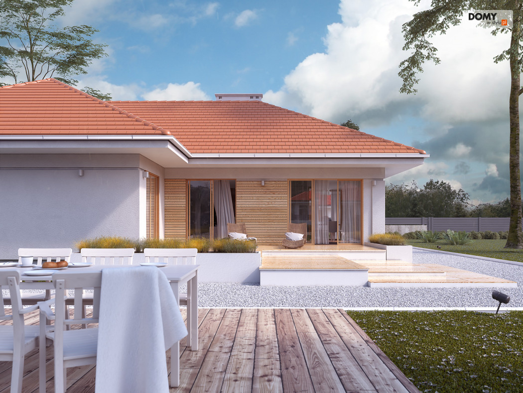 Ambrozja 13 to jednorodzinny dom mieszkalny, parterowy, przeznaczony dla 4-osobowej rodziny. W projekcie widoczny jest wyraźny podział na część dzienną oraz nocną. Na część dzienną składa się przestronny salon z jadalnią oraz kuchnia z przylegającą do niej spiżarnią. W części nocnej zaprojektowano trzy sypialnie, łazienkę oraz WC. W projekcie znajduje się także część gospodarcza z kotłownią i dwustanowiskowym garażem. Atutem projektu są dwa tarasy dostępne z salonu oraz z jadalni.