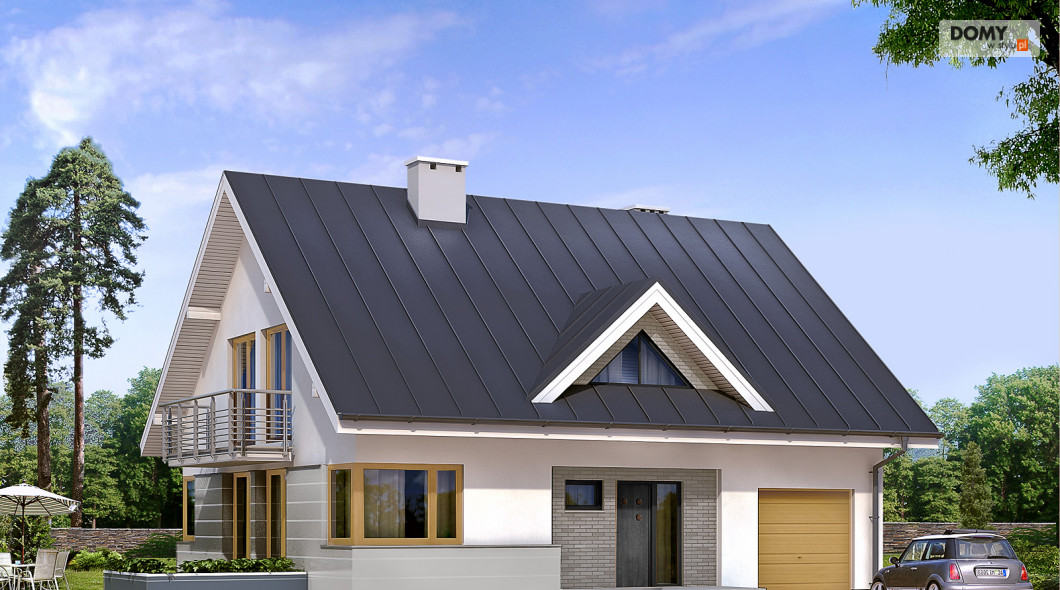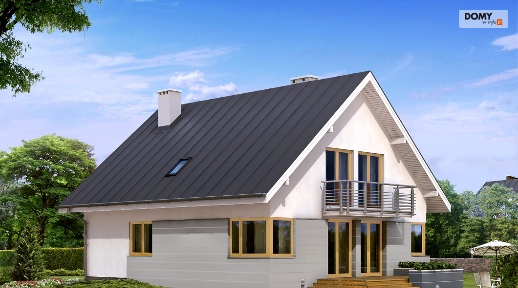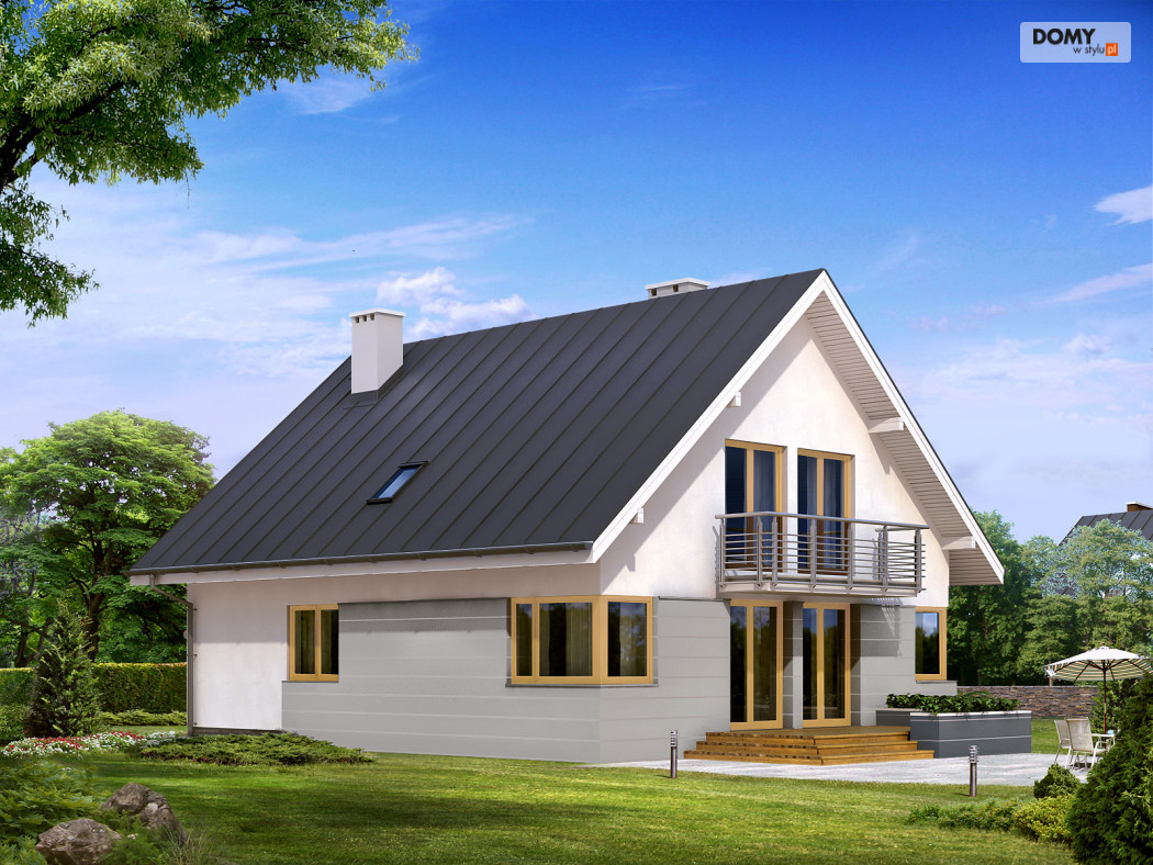 Dom jednorodzinny, wolno stojący, niepodpiwniczony z garażem i użytkowym poddaszem, dla 4 – 5-osobowej rodziny. Na parterze interesujący pokój dzienny z jadalnią i wyeksponowanym kominkiem, dodatkowy pokój dla starszej osoby z możliwością adaptacji na pracownię, ciekawie rozwiązana klatka schodowa. Na poddaszu trzy duże sypialnie. Antresola ma wydzielone miejsce do odpoczynku.