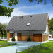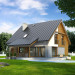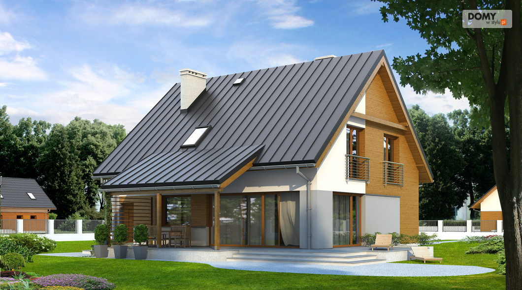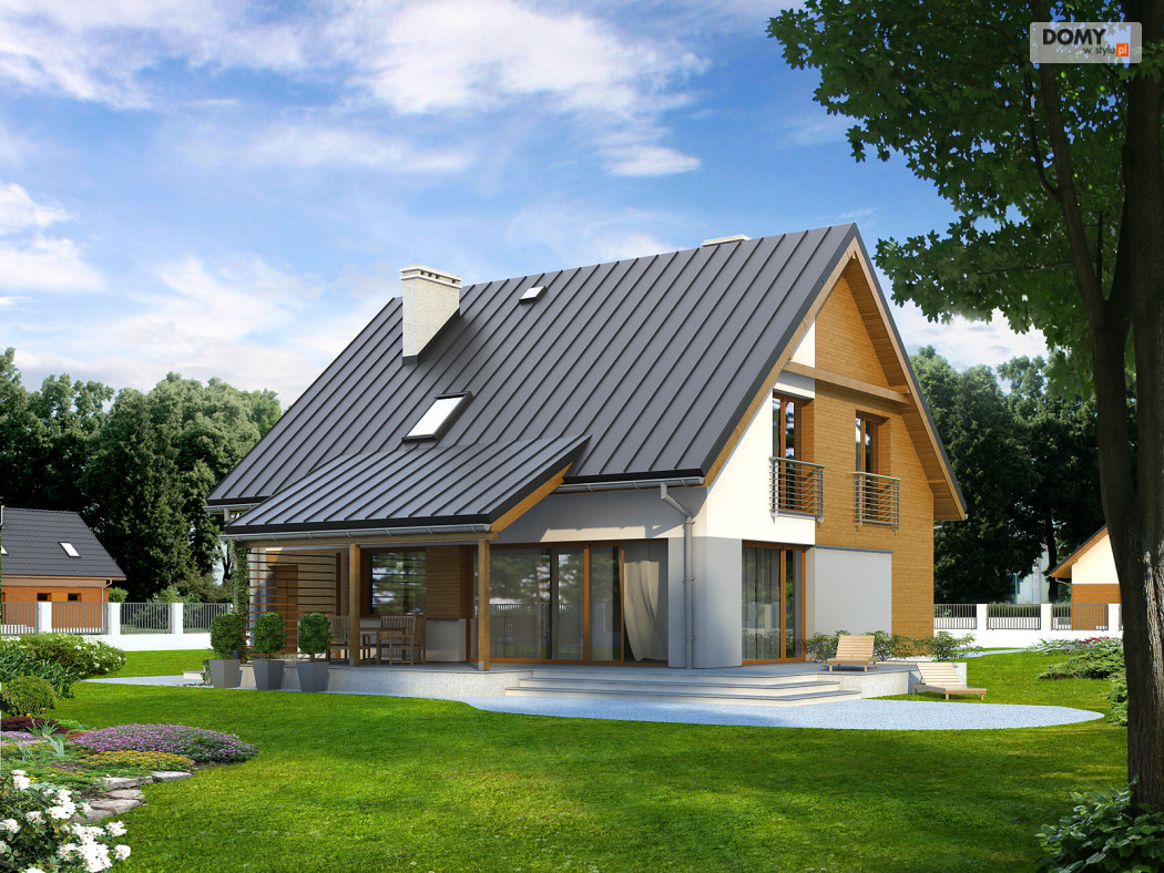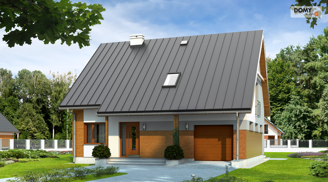 Wygodny dom dla 4 – 5-osobowej rodziny.  Zlokalizowana na parterze część dzienna mieści w sobie przestronny pokój dzienny, jadalnię, kuchnię i gabinet, dodatkowo są tu: łazienka, duża kotłownia i jednostanowiskowy garaż.  Na poddaszu znajdują się trzy obszerne sypialnie, łazienka, wc i garderoba.  Prosta bryła z dwuspadowym dachem i zadaszonym tarasem.