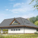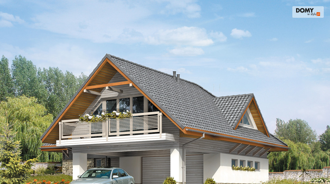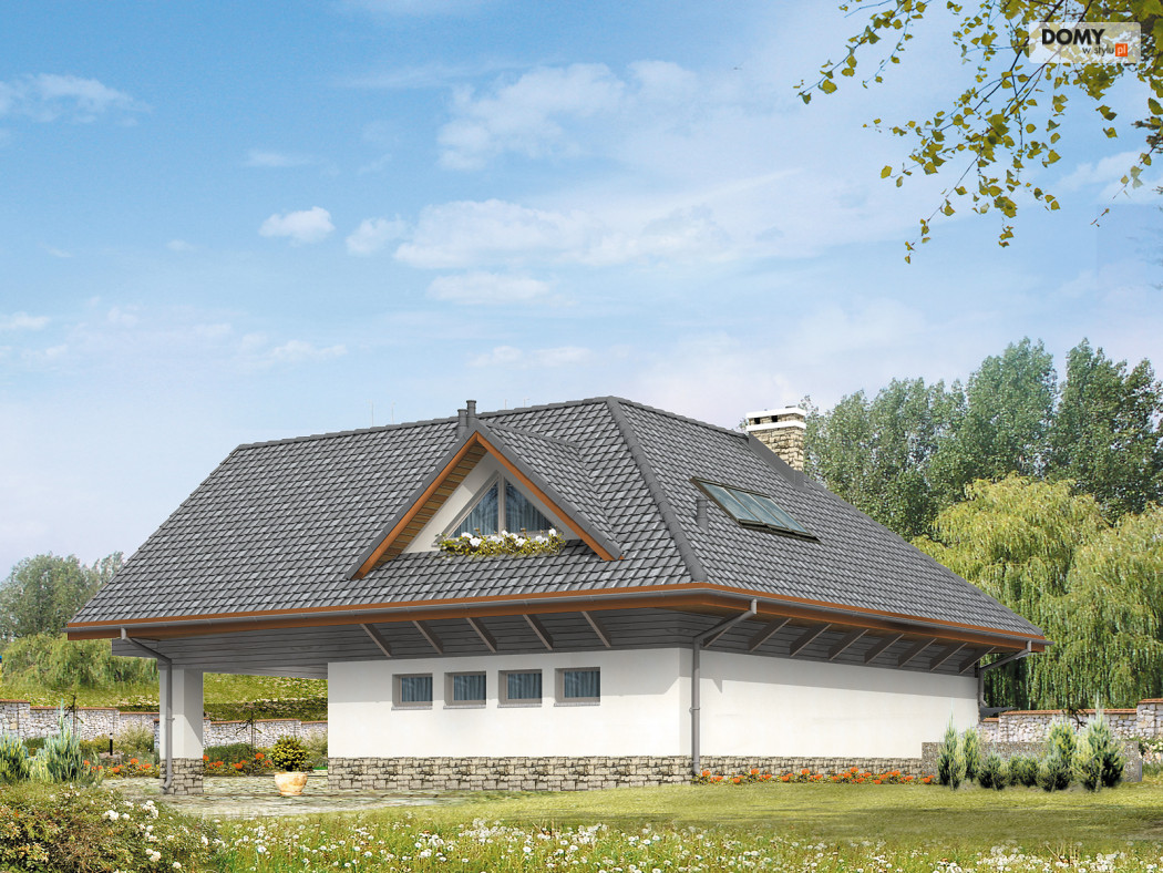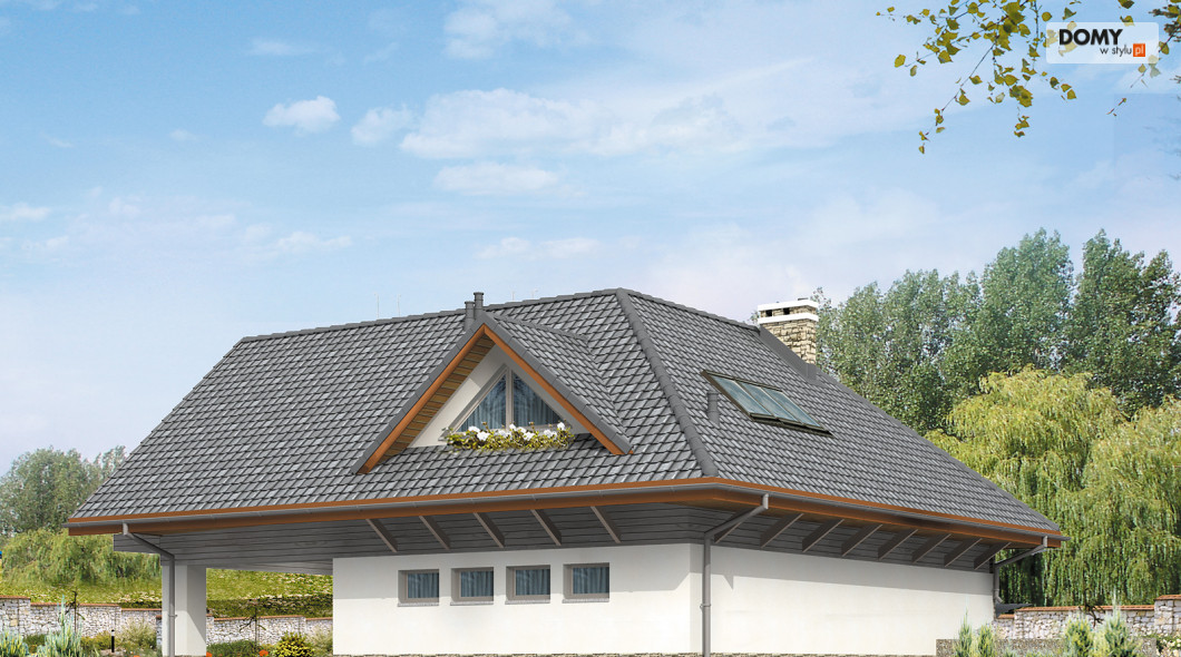 Dom letniskowy, parterowy z poddaszem użytkowym. Przestronny garaż daje możliwość parkowania dwóch samochodów lub samochodu i łodzi. Duże przeszklenie ściany sypialni prowadzące na zadaszony balkon zapewnią komfortowy wypoczynek w niepogodę. Kształt bryły budynku, użycie naturalnych materiałów i dobór detalu architektonicznego pozwolą na wkomponowanie domu w każdy krajobraz.