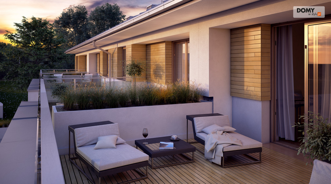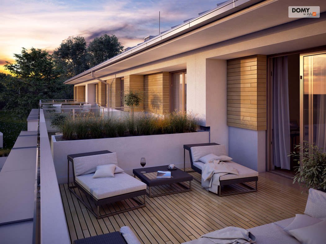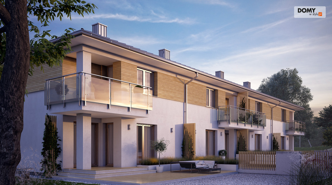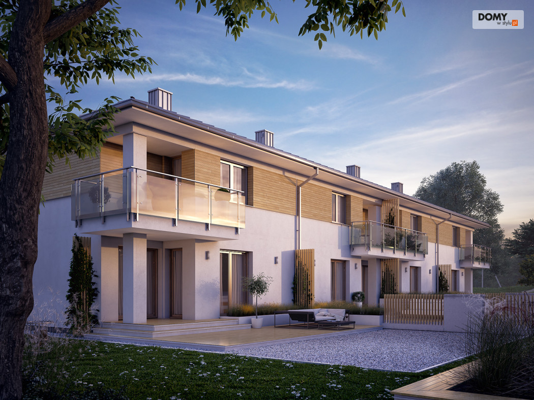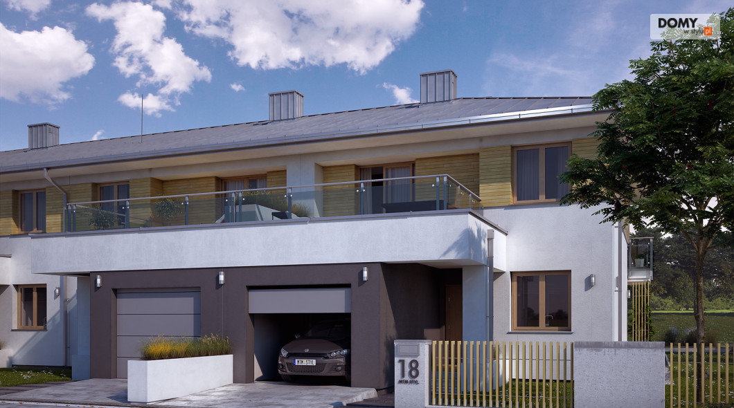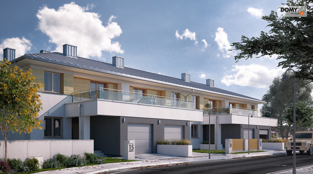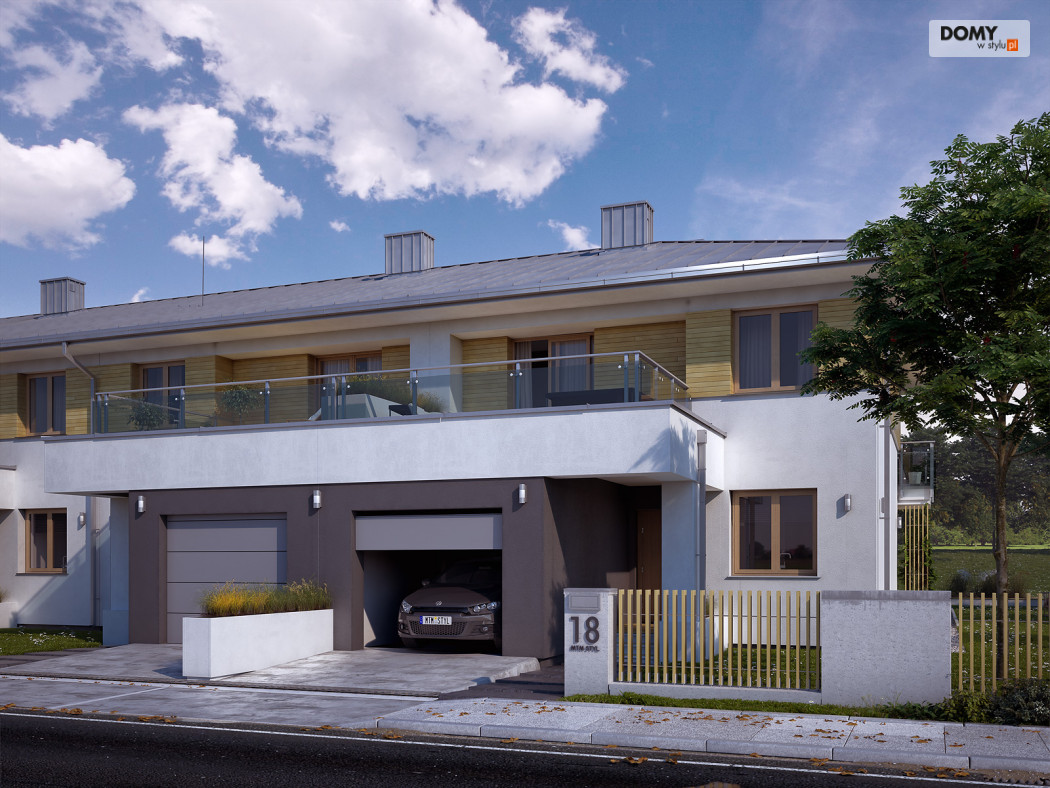 Sekwoja to projekt domu w zabudowie szeregowej. Budynek posiada dwie pełne kondygnacje. Brak skosów na poddaszu znacznie ułatwia zagospodarowanie pomieszczeń. Projekt posiada nowoczesny charakter, który został podkreślony przez jasne kolory tynku, drewniane okładziny na elewacji oraz szklane balustrady. Od strony elewacji frontowej znajduje się wysunięty garaż z tarasem na piętrze tworząc zadaszoną strefę wejścia. Układ funkcjonalny odpowiada potrzebom 4 osobowej rodziny. Na parterze zaprojektowano strefę dzienną na którą składa się kuchnia ze spiżarnią, salon z jadalnią oraz wc. Na piętrze znajduje się strefa nocna z trzema sypialniami, garderobą oraz rodzinną łazienką. Cena dotyczy jednego segmentu. O inne konfiguracje zapytaj telefonicznie.