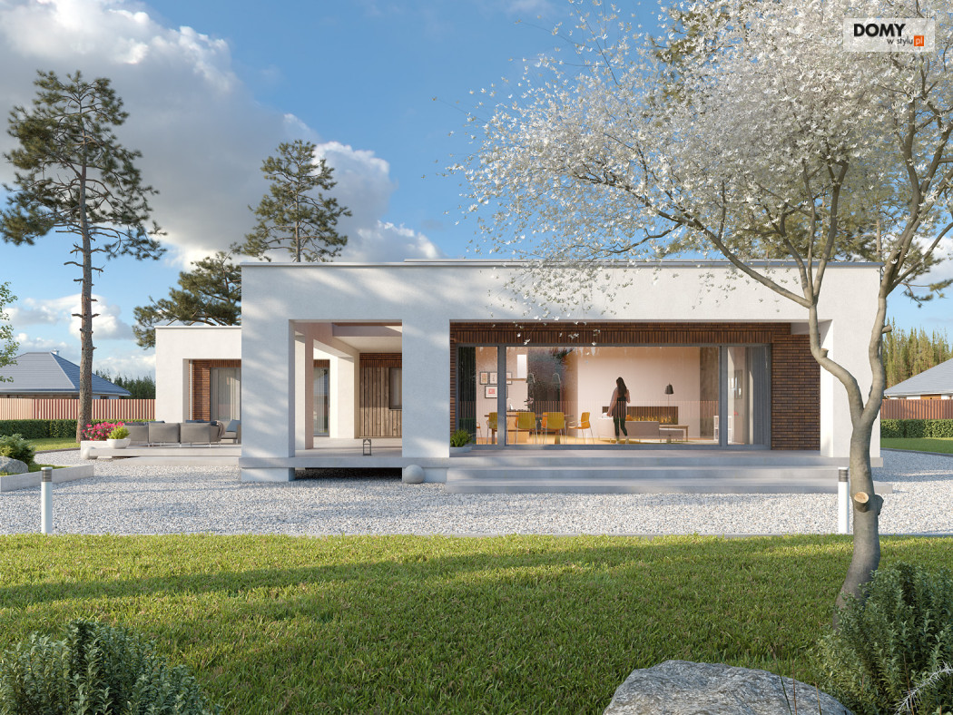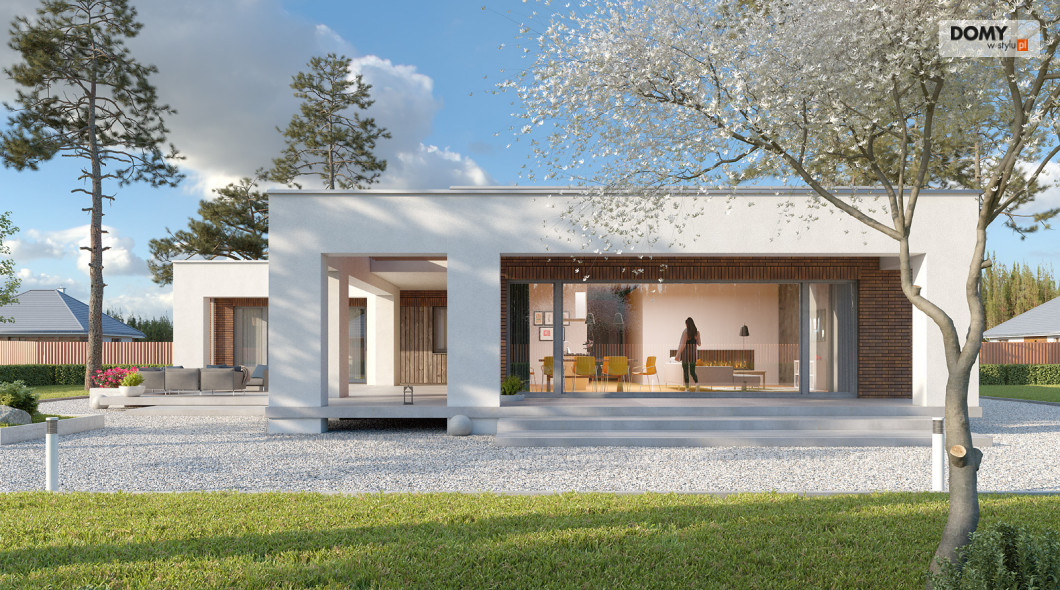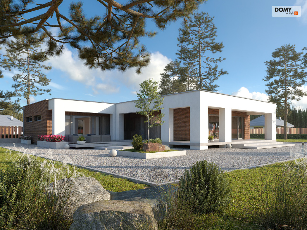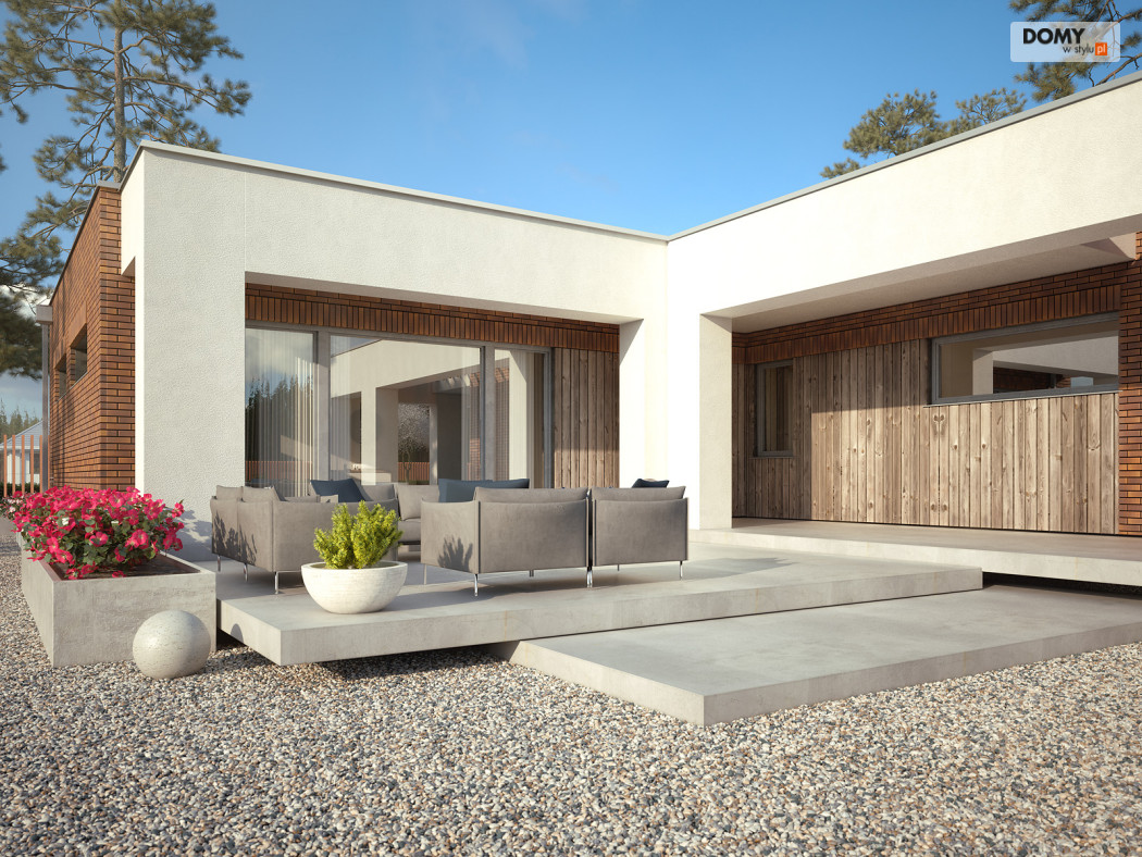 Jadeit 2 to projekt domu parterowego, zaprojektowany z myślą o oryginalnej bryle oraz ciekawych rozwiązaniach elewacyjnych. Projekt podzielono na trzy strefy użytkowe. Strefę dzienną tworzy salon z kuchnią i jadalnią, który jest otwarty na ogród poprzez duże przeszklenie. Strefa nocna to cztery sypialnie, z czego jedna to apartament gospodarzy z przestronną łazienką z widokiem na ogród. Dodatkowo na parterze znajduje się ogólnodostępna łazienka oraz kotłownia.