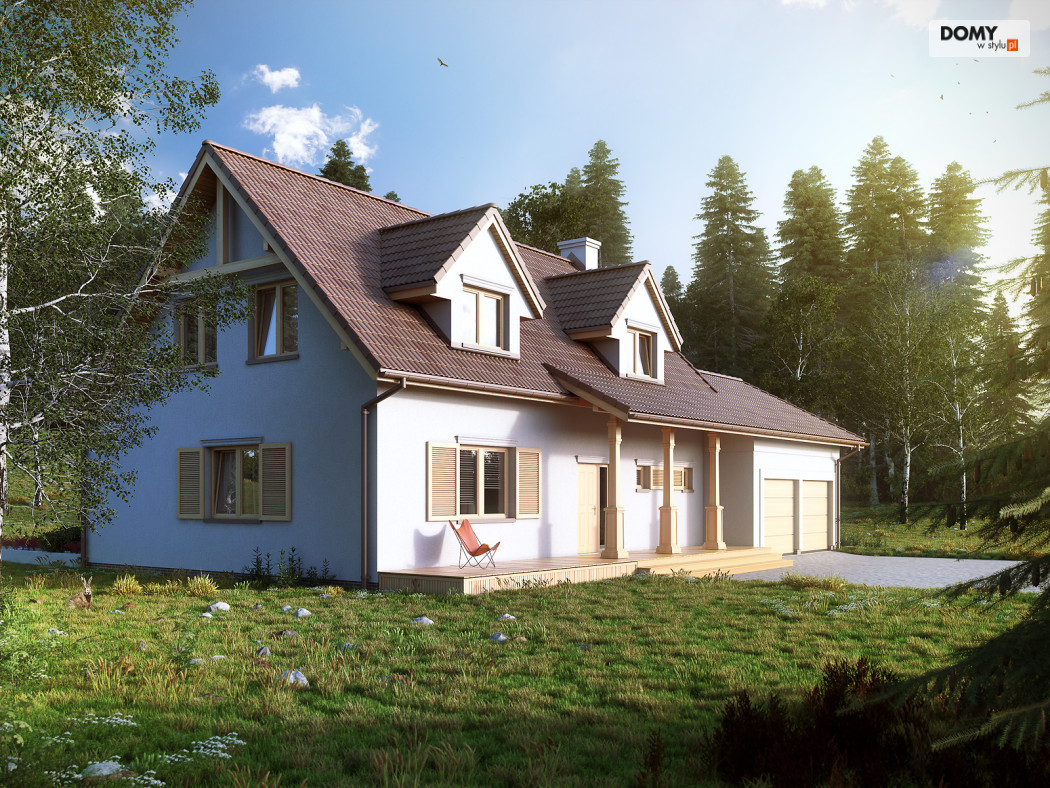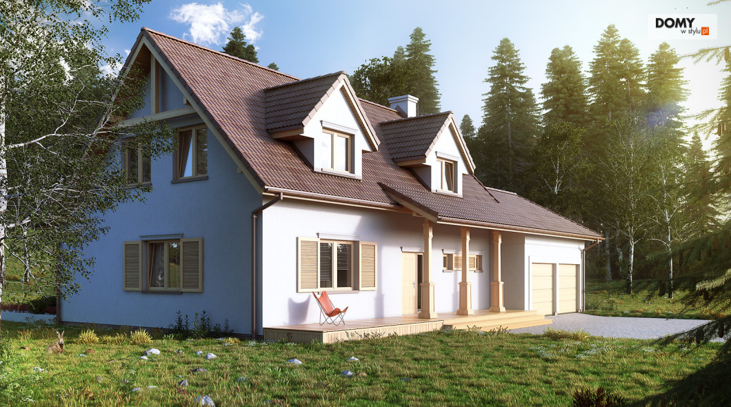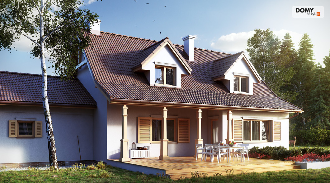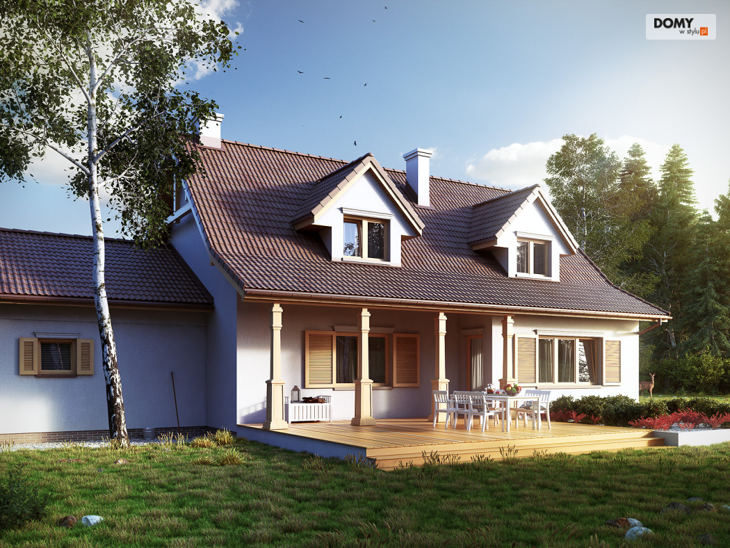 Dom parterowy z użytkowym poddaszem, niepodpiwniczony. Przeznaczony dla 3 – 4-osobowej rodziny. Zaprojektowano zadaszony taras ogrodowy. Na parterze znajduje się dodatkowy pokój. Na poddaszu są trzy sypialnie, garderoba i łazienka.