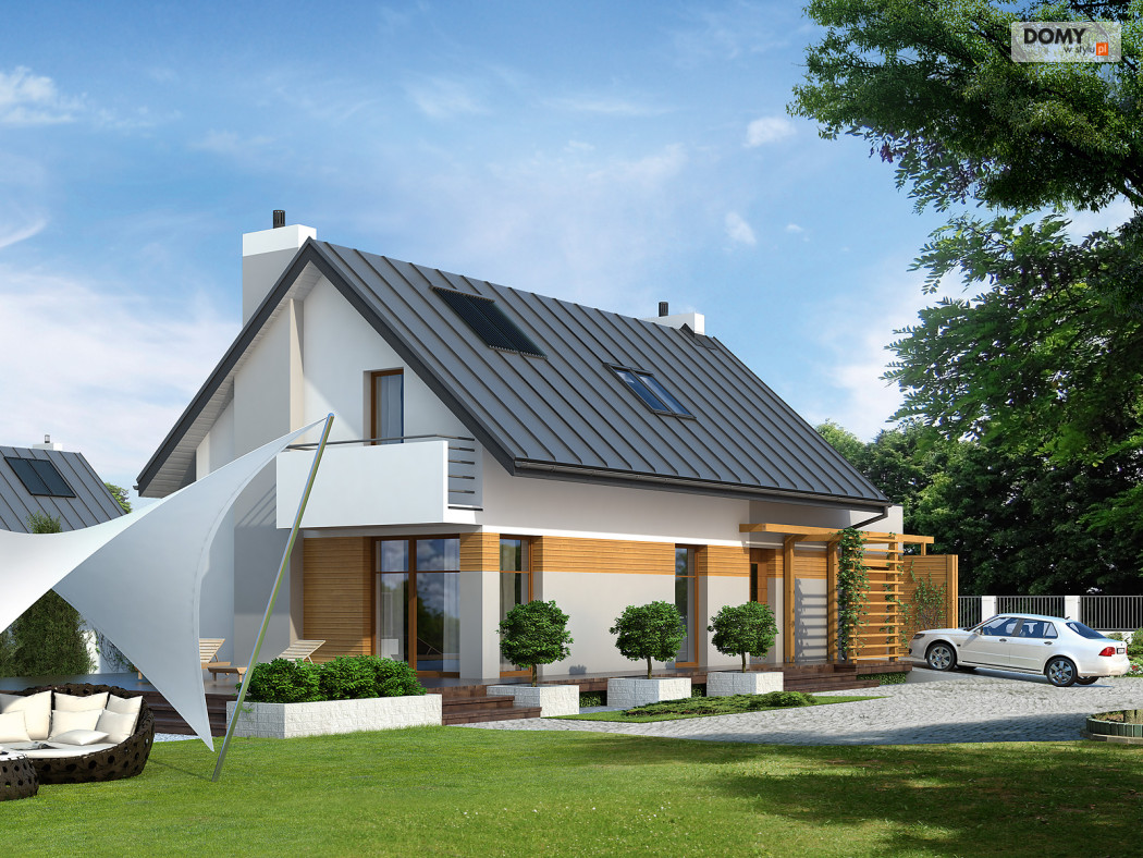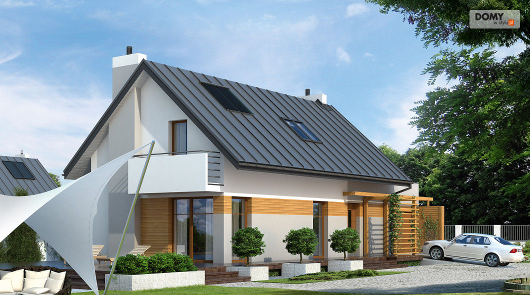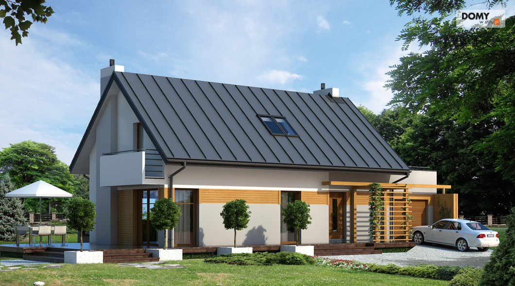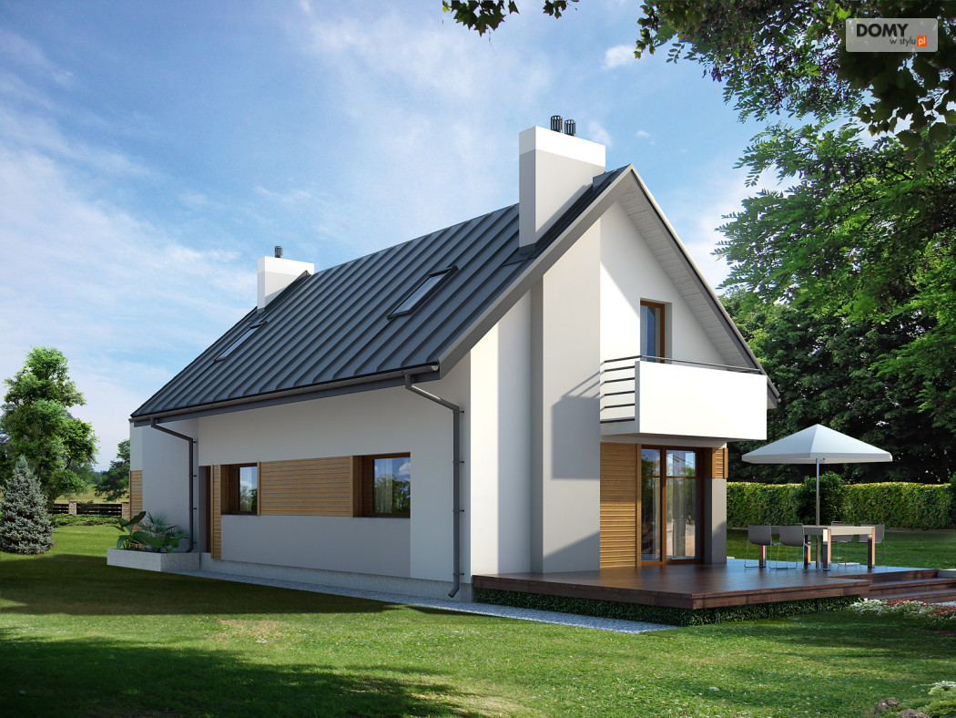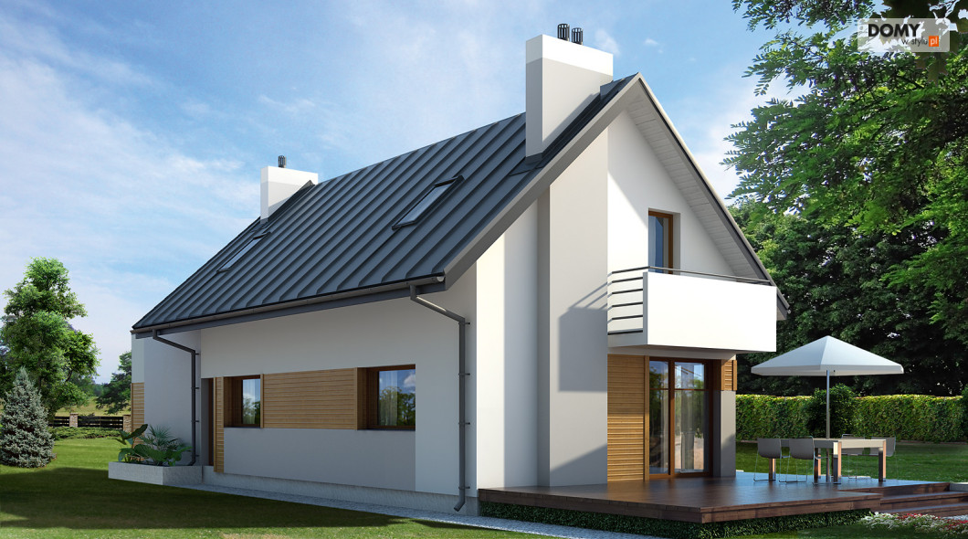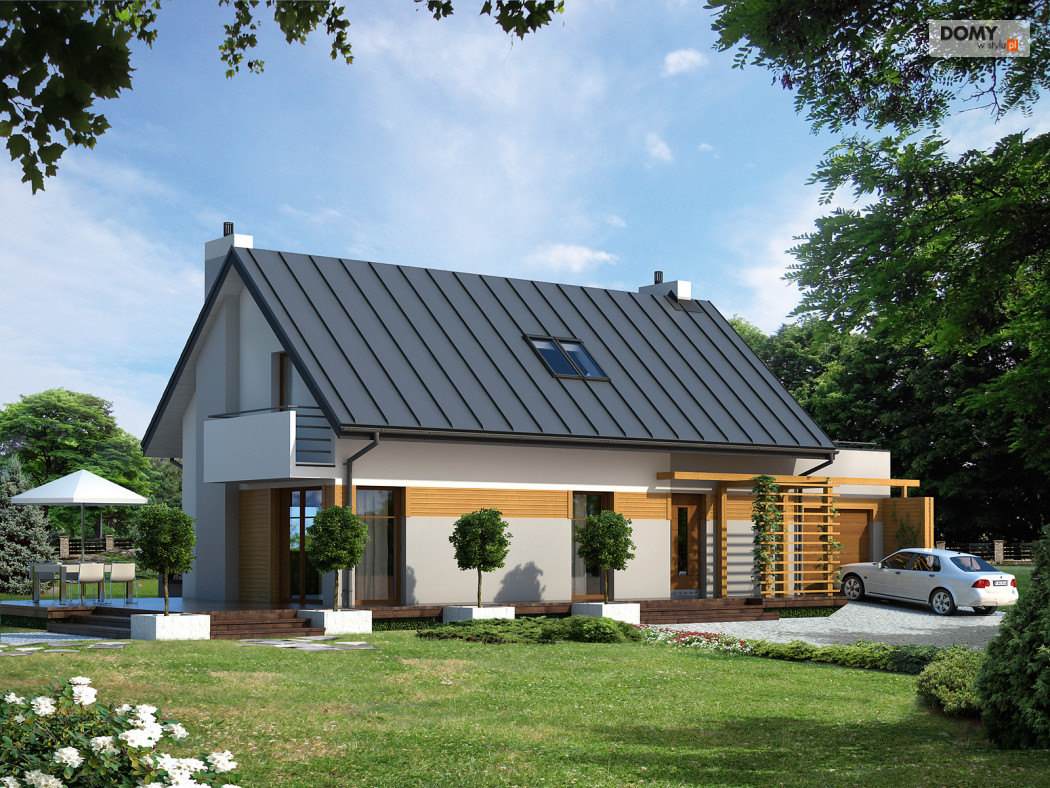 Niewielki ale wygodny dom na wąską działkę. Nowoczesna, prosta bryła z dwuspadowym dachem. Zlokalizowana na parterze część dzienna mieści w sobie pokój dzienny z jadalnią, kuchnię i spiżarnię, dodatkowo znajdują się tu: kotłownia i jednostanowiskowy garaż. Na poddaszu znajdują się: trzy sypialnie, jedna z obszernym tarasem i duża łazienka. Do bryły domu przylega letni salon – rozległy, drewniany taras.