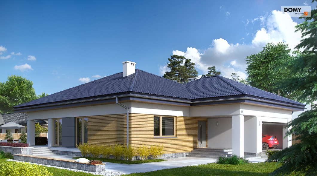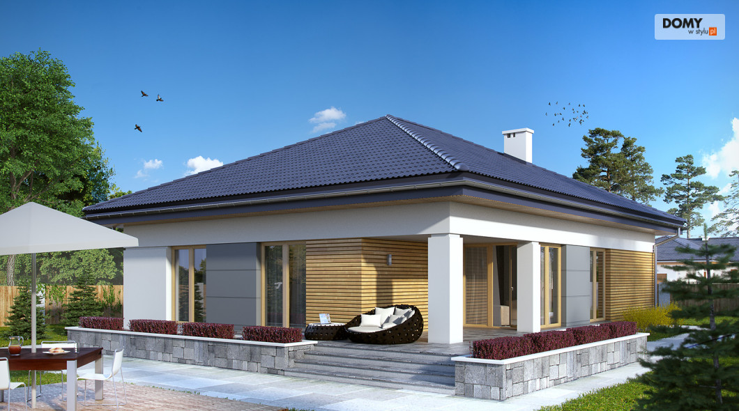 Parterowy, jednorodzinny budynek mieszkalny z wygodnym dwustanowiskowym garażem, przeznaczony dla 4-osobowej rodziny.  Prosta bryła o nowoczesnych elewacjach z ciekawie zaakcentowanym wejściem.  Wyraźny podział na część dzienną i nocną.  Przestronna, otwarta część dzienna z wydzieloną spiżarnią.