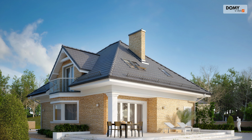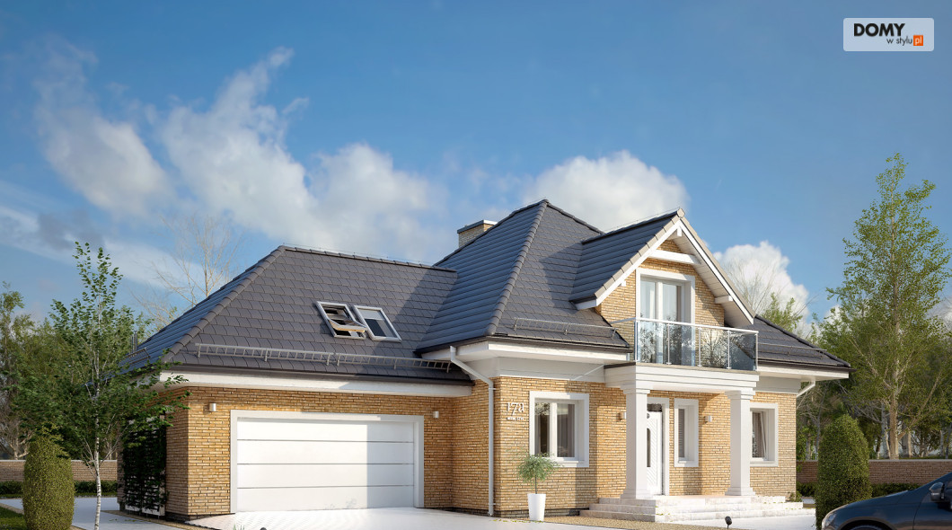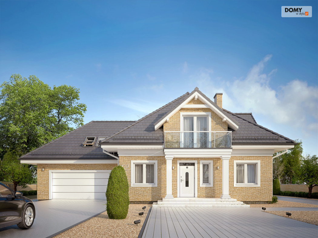 Budynek mieszkalny jednorodzinny z użytkowym poddaszem i dwustanowiskowym garażem. Na parterze znajdziemy część dzienną i dodatkowy pokój na gabinet. Na poddaszu zaprojektowano trzy sypialnie, łazienkę i dużą garderobę nad garażem (z możliwością zaadaptowania na inne pomieszczenie).