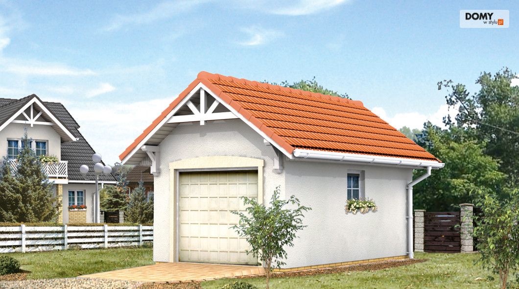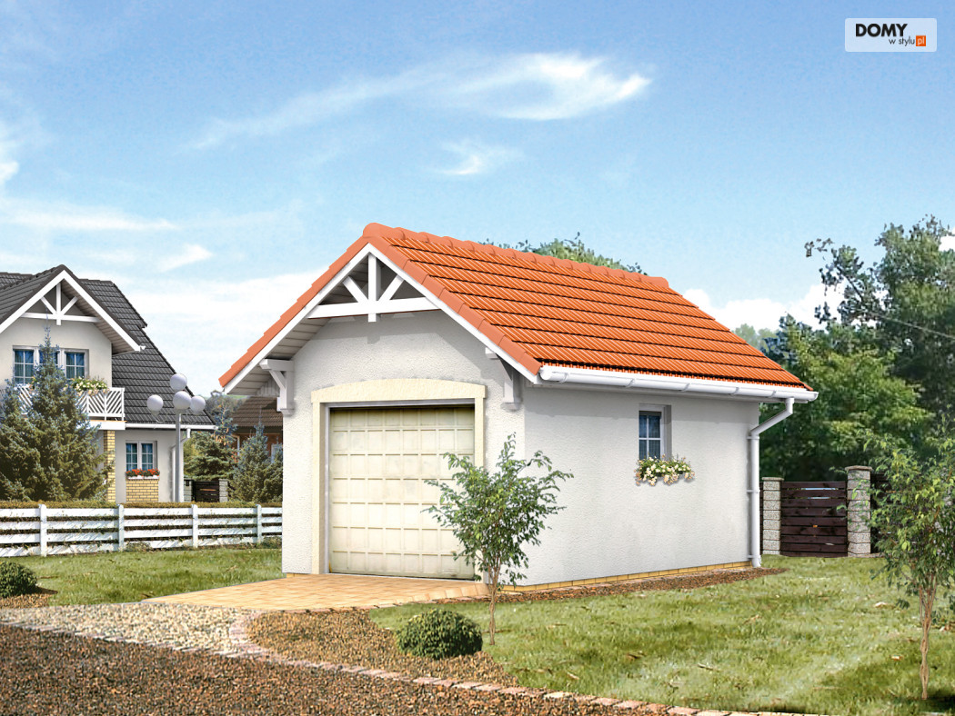 Garaż jednostanowiskowy, wono stojący. Dach dwuspadowy.