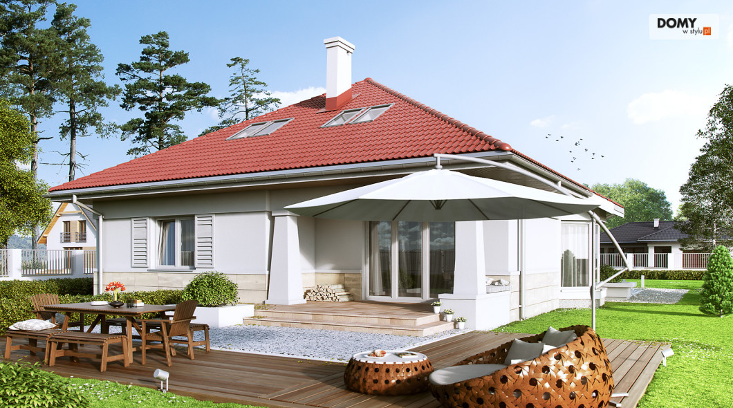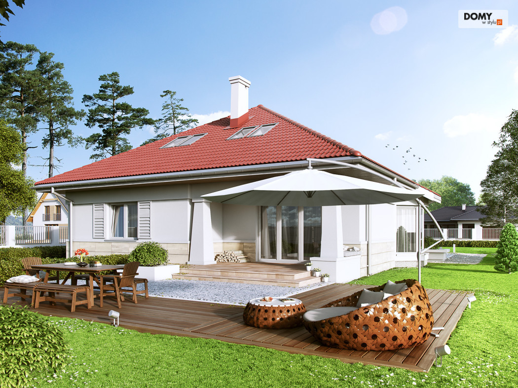 Jednorodzinny budynek mieszkalny, parterowy, niepodpiwniczony, z możliwością adaptacji poddasza na funkcje mieszkalne. Program użytkowy budynku zapewnia komfort mieszkania 3-osobowej rodzinie. Pomieszczenia jakie zaprojektowano w budynku, to: w części dziennej - salon, kuchnia połączona z jadalnią, spiżarnia; w części nocnej - dwie sypialnie, w tym jedna z garderobą i łazienka; w części gospodarczej - kotłownia i garaż.