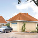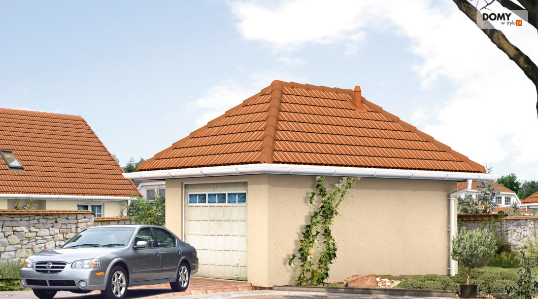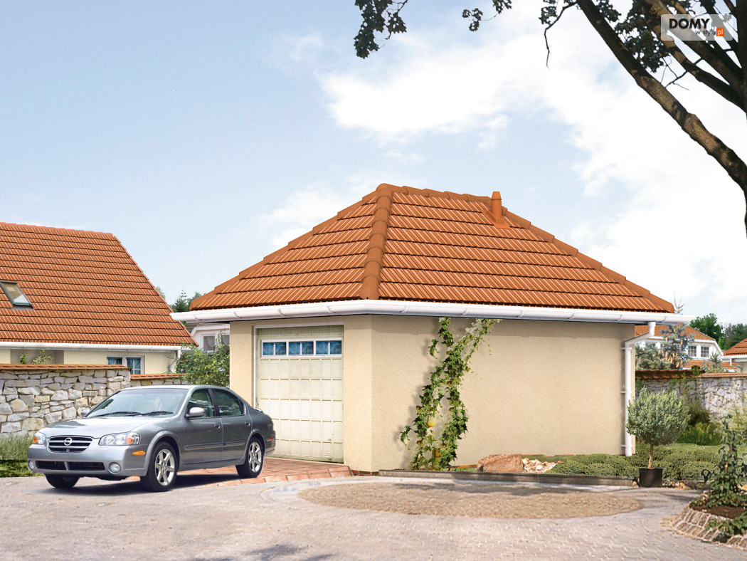 Garaż jednostanowiskowy, wolno stojący. Dach czterospadowy.