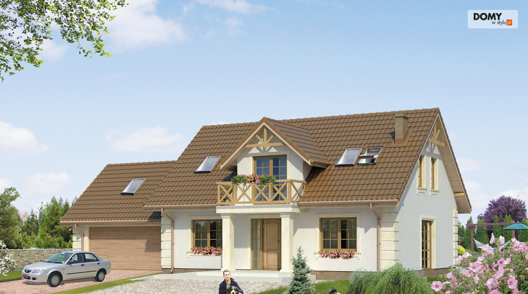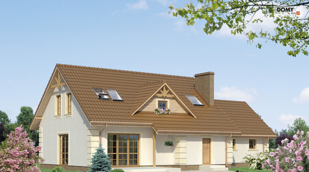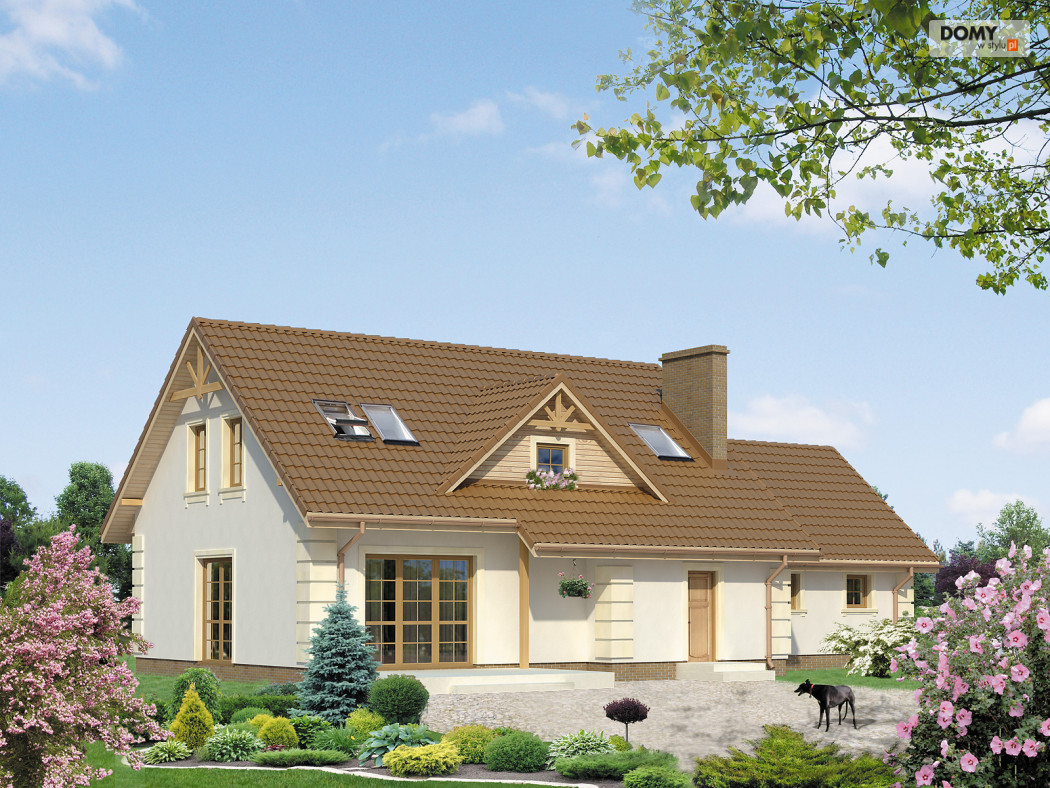 Dom jednorodzinny z użytkowym poddaszem i dwustanowiskowym garażem, który można dobudować później. Parter oprócz części dziennej posiada dodatkowy pokój z łazienką. Na poddaszu znajdują się trzy pokoje i łazienka.