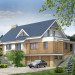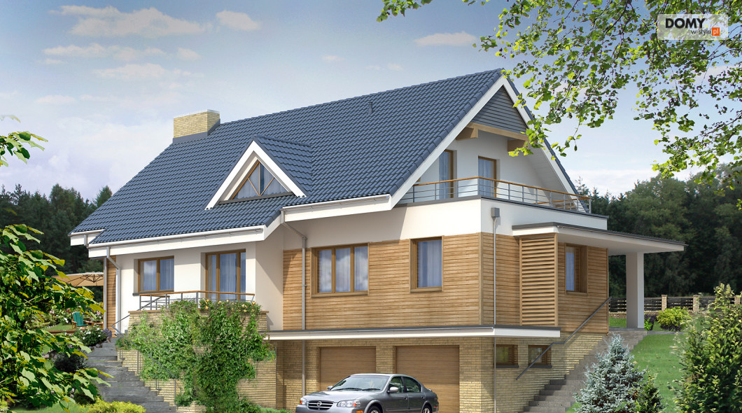 Energooszczędny dom dwurodzinny o nowoczesnej bryle, idealny na pochyły teren. Jest to budynek dwurodzinny z oddzielnymi wejściami. Pierwsze mieszkanie ma na parterze część dzienną: salon z kuchnią i wc oraz na poddaszu trzy sypialnie i łazienkę z pralnią. Drugie mieszkanie znajduje się na parterze i zawiera salon, kuchnię, sypialnię i łazienkę. Zaprojektowano również piwnicę z dwustanowiskowym garażem dostępną z dwóch mieszkań.