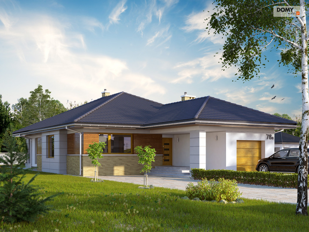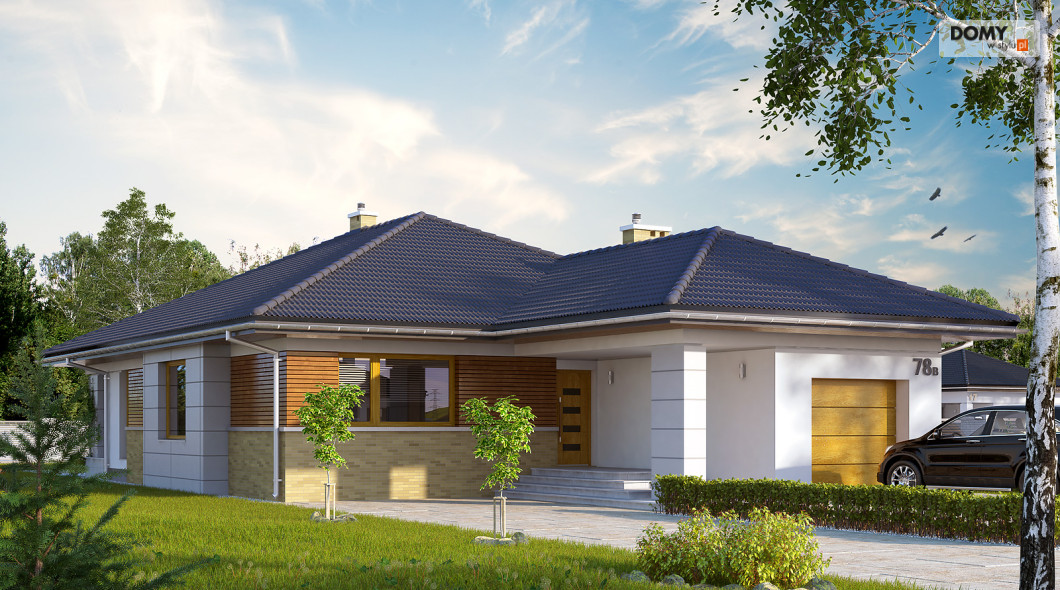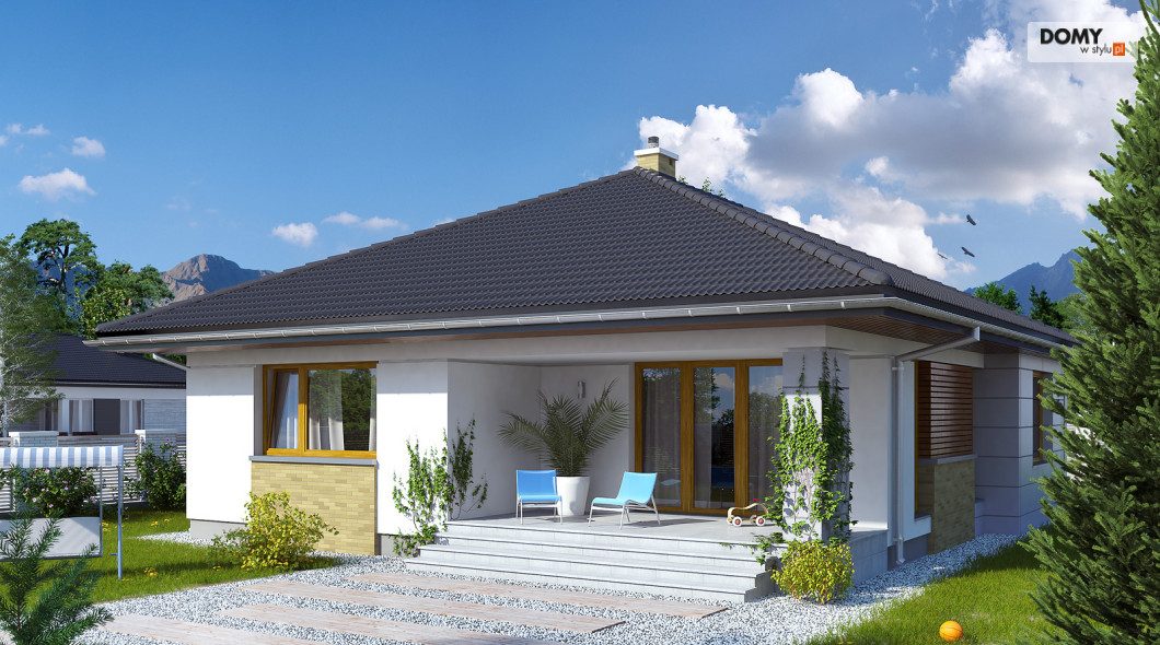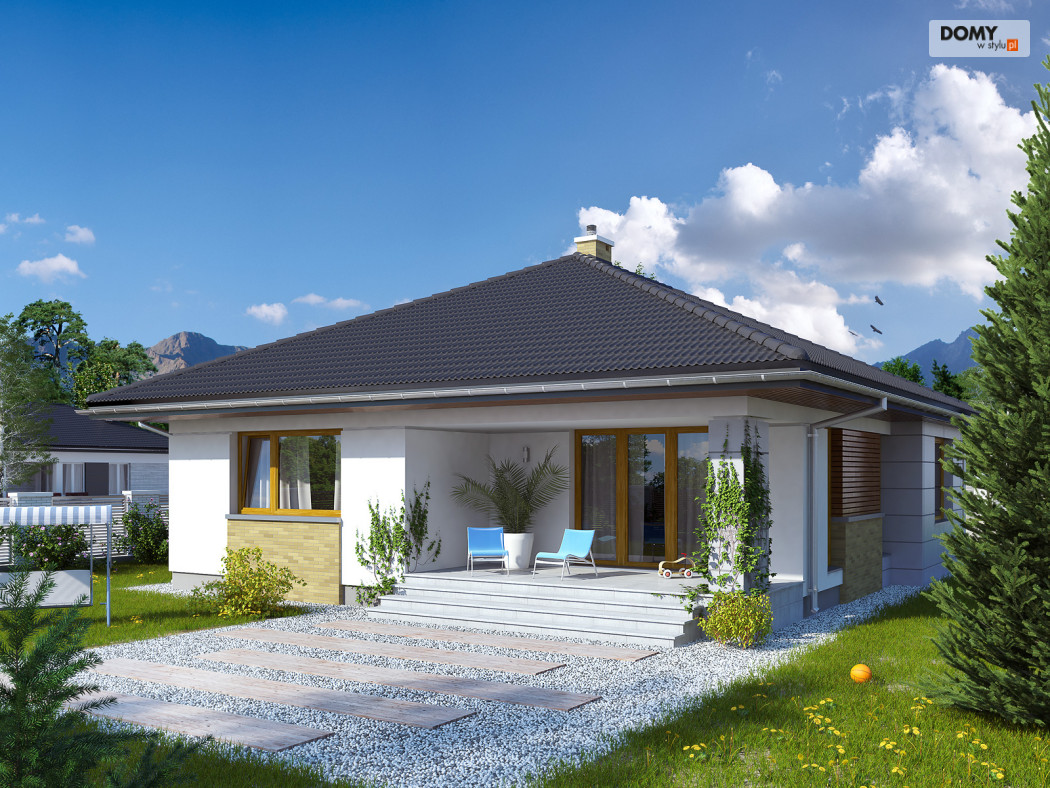 Przestronny dom jednorodzinny z dwoma łazienkami i trzema sypialniami w części nocnej oraz efektownym holem wejściowym, spiżarnią, dużą kuchnią, ciekawie zaakcentowaną jasną jadalnią, salonem, który otwiera sie na taras w części dziennej. Dodatkowym uzupełnieniem jest jednostanowiskowy garaż, spora kotłownia i wiatrołap połączony z wygodną szatnią. Bryłę wyróżnia podcieniowe wejście. Dom idealny na wąską działkę.