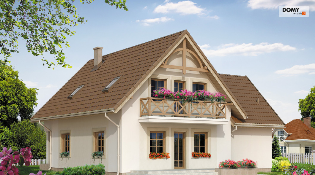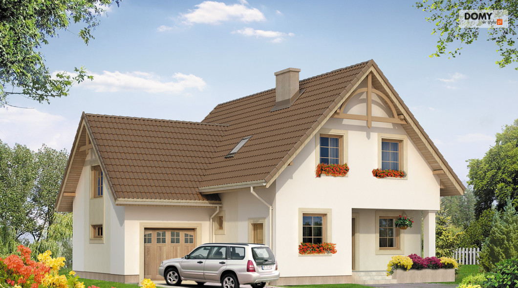 Dom jednorodzinny z użytkowym poddaszem i garażem, zaprojektowany dla dużej rodziny. Na parterze znajdziemy dodatkowy pokój. Na poddaszu zaprojektowano aż pięć sypialni, łazienkę oraz garderobę.