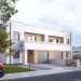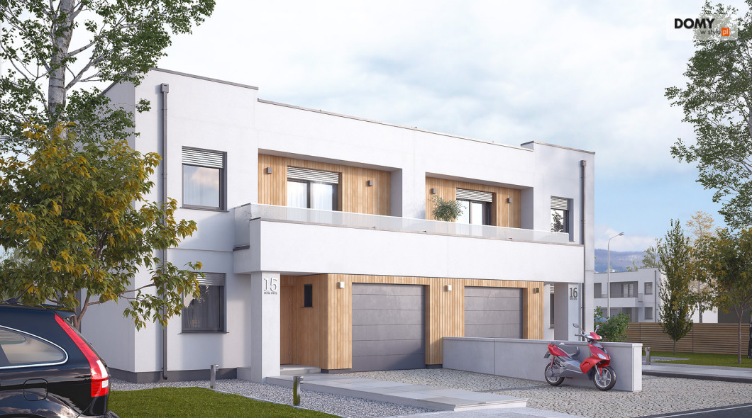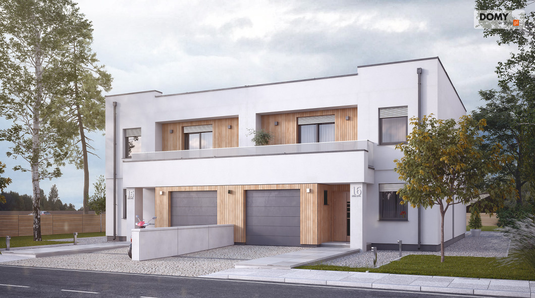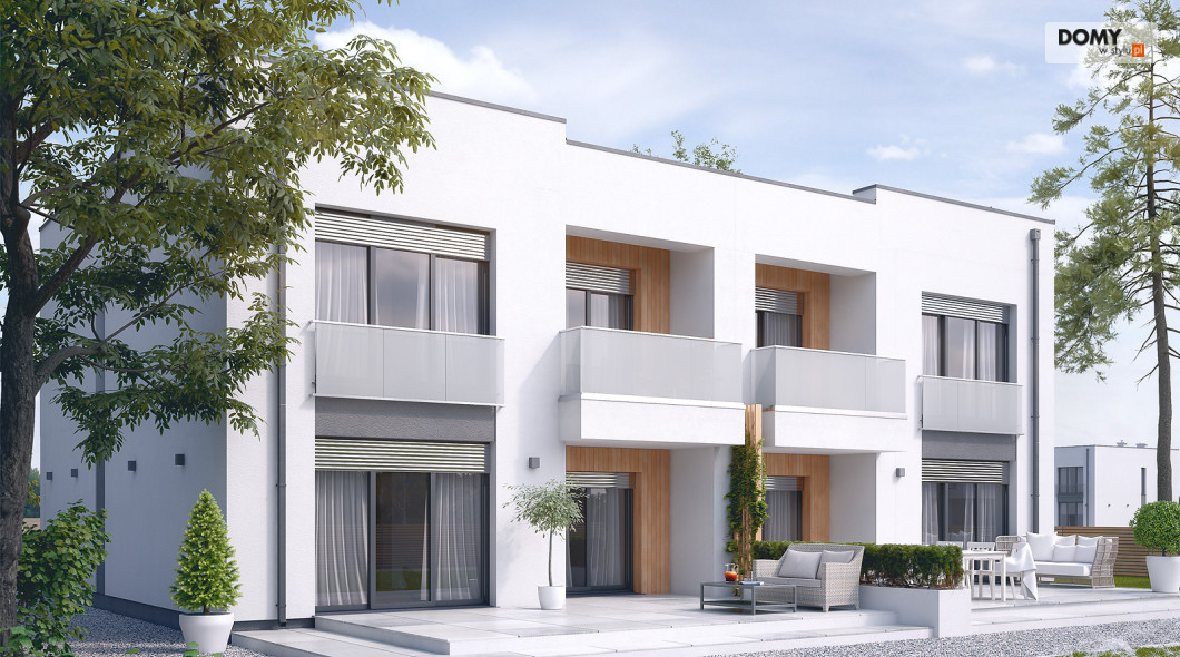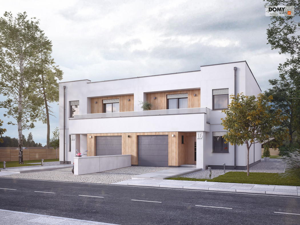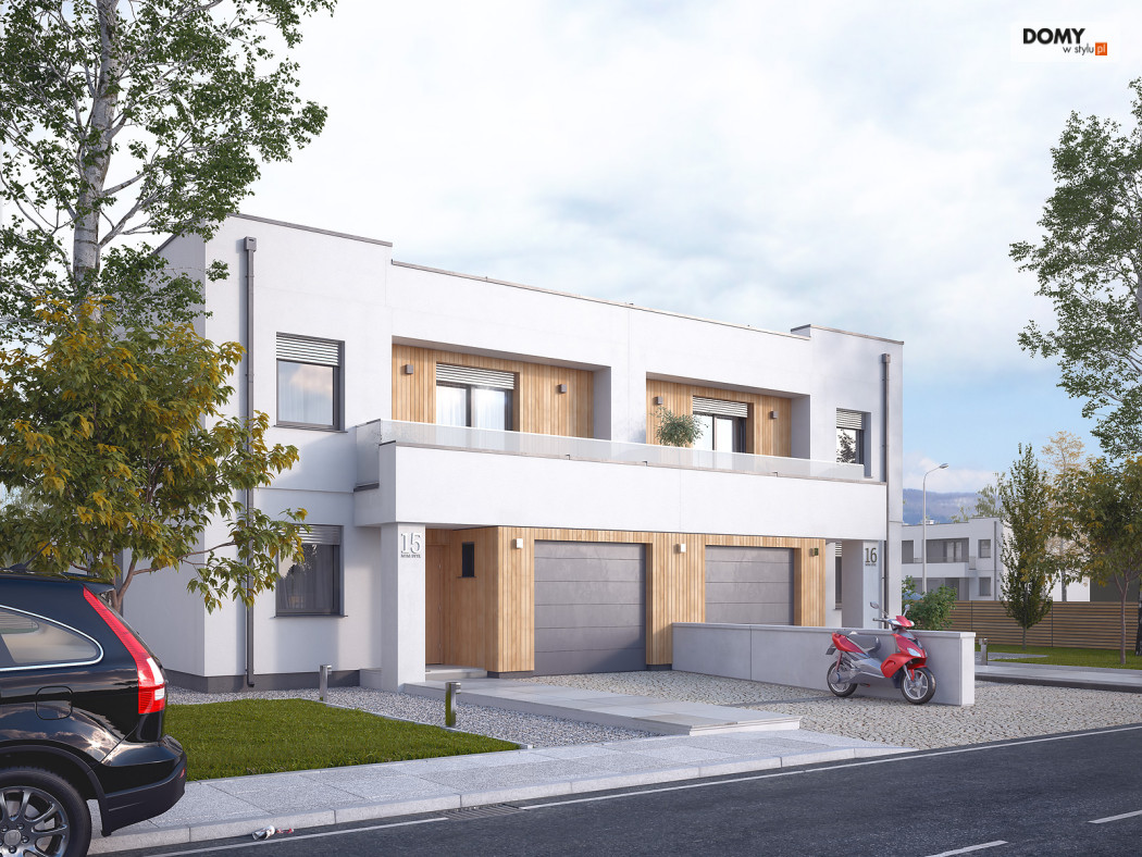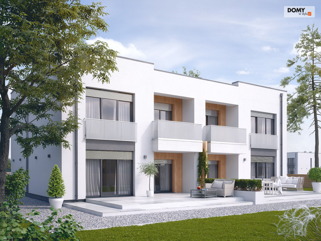 Pistacjowy jest propozycją domu dwurodzinnego typu bliźniak. Program funkcjonalny tworzą strefa nocna na piętrze oraz strefa dzienna na parterze. Na pierwsza z nich składają się pomieszczenia: kuchnia, wiatrołap, hol, łazienka oraz przestronny salon z jadalnia. Na piętrze zaprojektowano 3 sypialnie przeznaczone dla 3-4 osób. W bryłę budynku wkomponowano również garaż. Projekt Pistacjowy cechuje się architekturą nawiązującą do wczesnego modernizmu z początku XX wieku. Duże przeszklenia, płaski dach, minimalistyczna bryła, oszczędne elewacje i otwarta przestrzeń to charakterystyczne cechy tego projektu. Jego atutem jest również zadaszony taras.