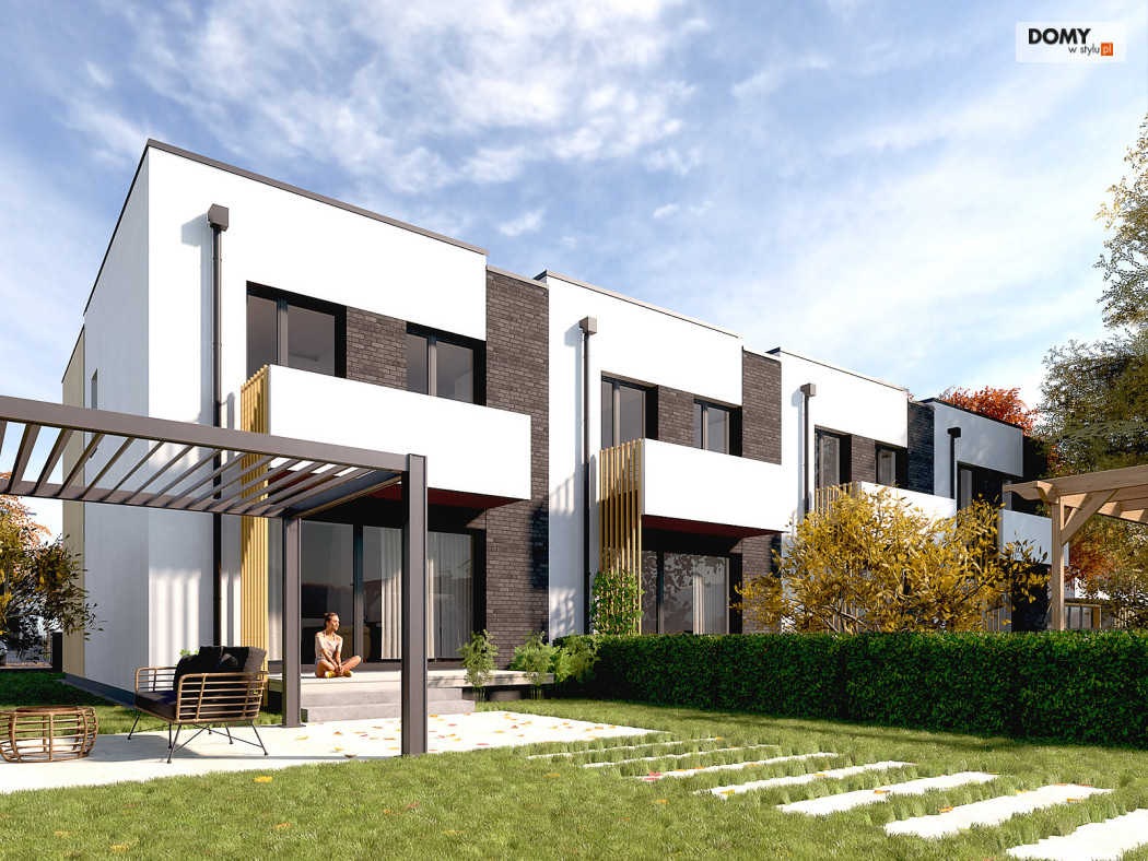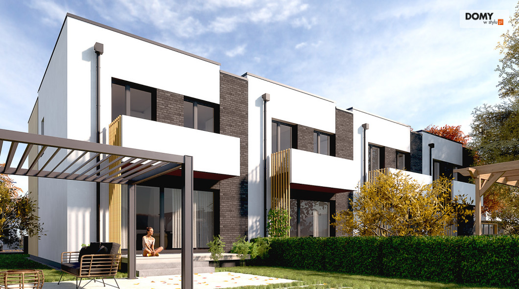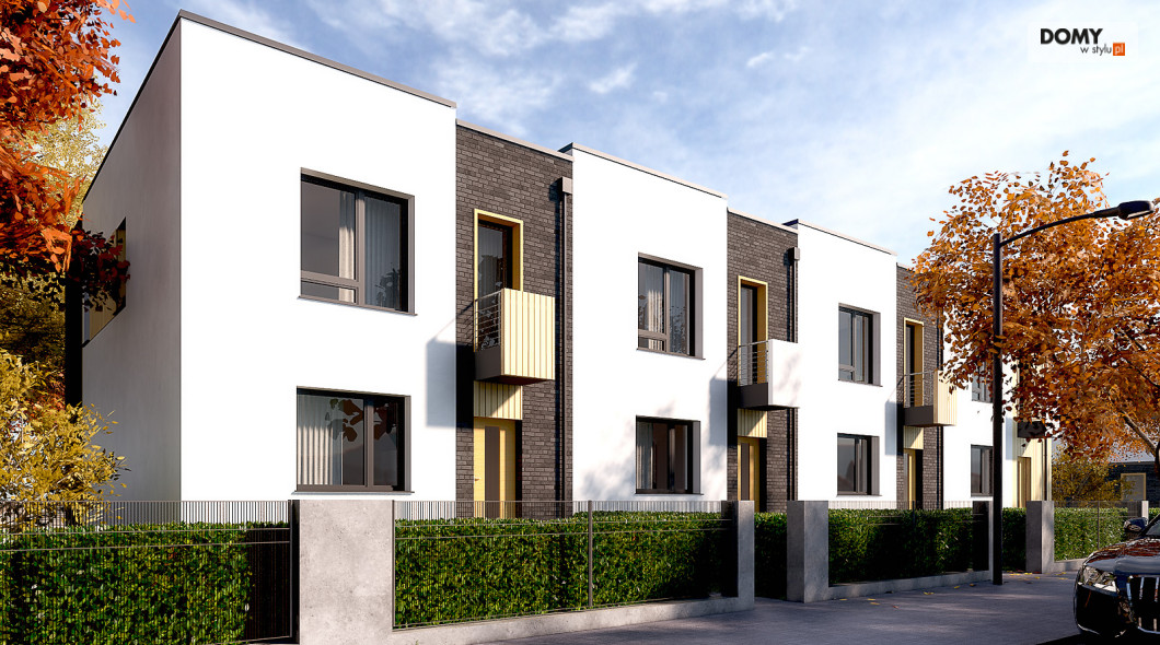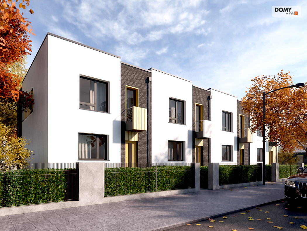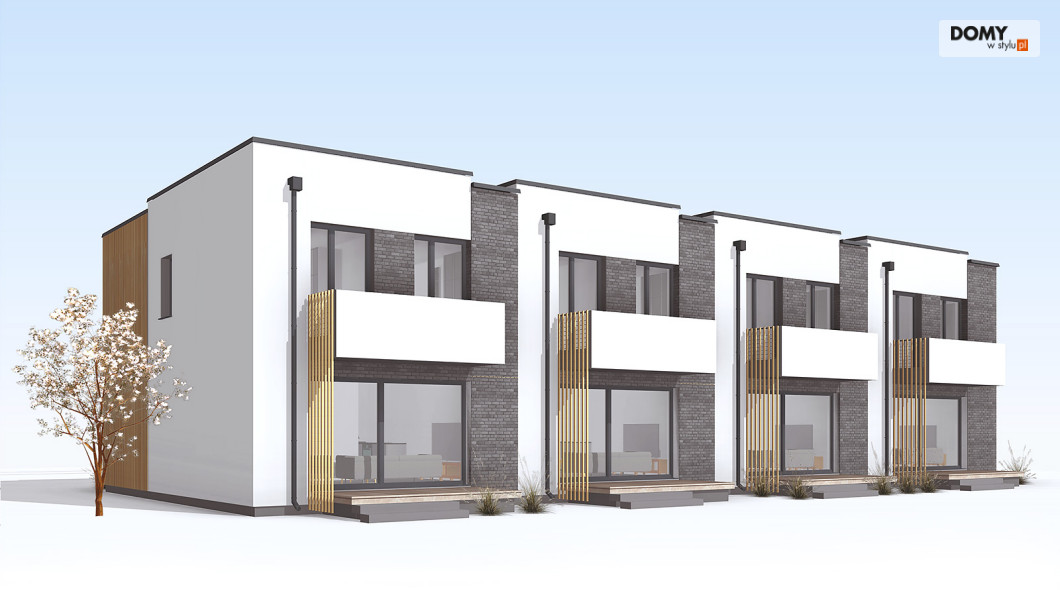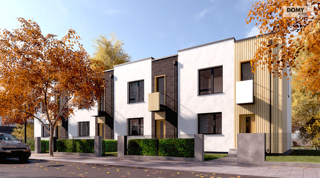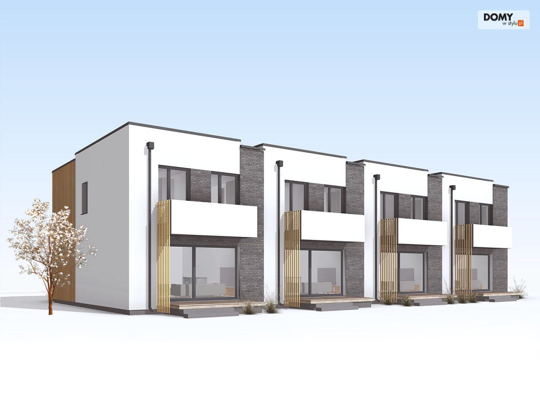 Niewielka szeregówka przeznaczona dla 4-osobowej rodziny. Projekt przyciąga uwagę prostą, niedrogą w budowie bryłą i nowoczesnym detalem. Rozdział na strefę dzienną i prywatną odpowiada podziałowi na kondygnacje. Otwarta przestrzeń parteru umożliwia stworzenie przytulnego i nowoczesnego wnętrza. Układ został rozplanowany wokół centralnego pionu mieszczącego pomieszczenia i urządzenia techniczno-sanitarne. Na piętrze znajduje się łazienka i trzy wygodne sypialnie z dostępem do balkonów. Istnieje możliwość wykonania projektu budynku z inną liczbą i układem segmentów.