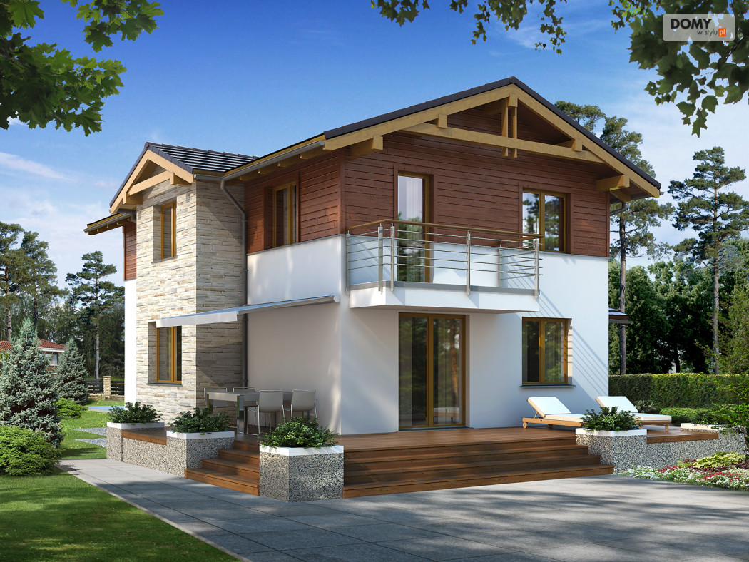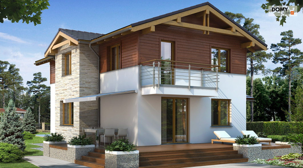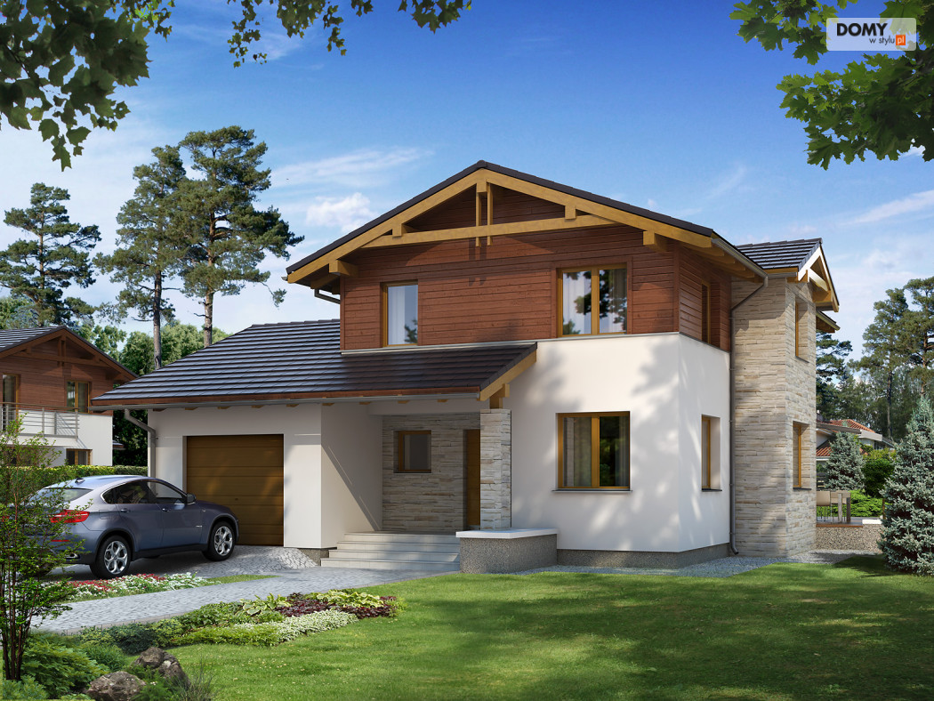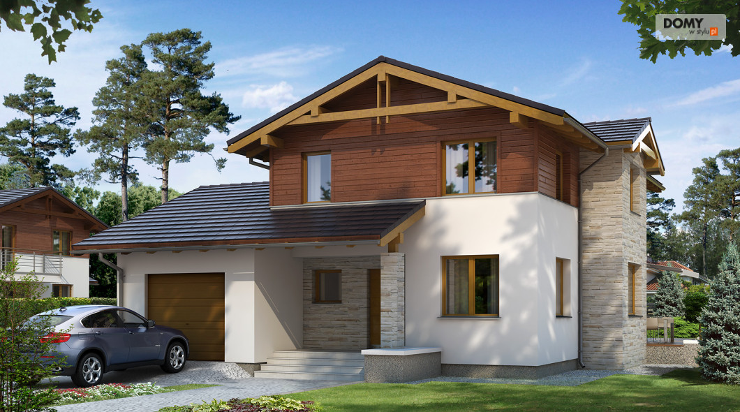 Dwukondygnacyjny dom jednorodzinny, niepodpiwniczony, przeznaczony dla 4 – 5-osobowej rodziny. Na parterze, obok przestronnej, jednoczęściowej części dziennej, zaprojektowano dodatkowy pokój oraz część gospodarczą. Pełna druga kondygnacja, na której przewidziano trzy sypialnie, garderobę oraz łazienkę dostępne z sypialni