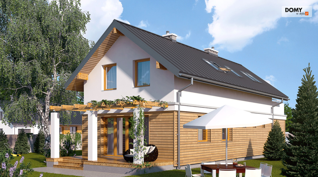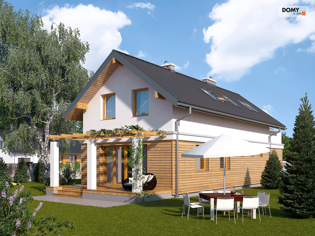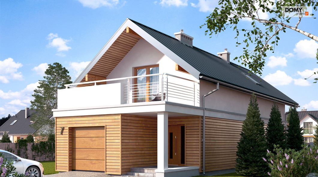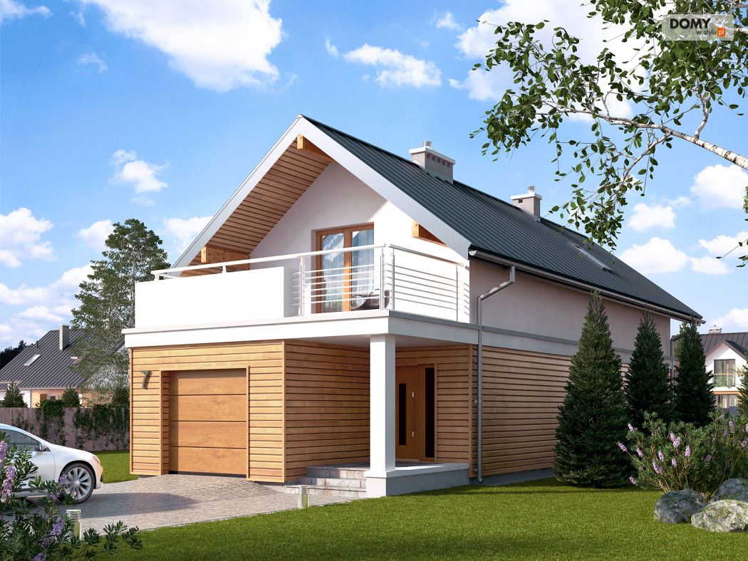 Niewielki dom jednorodzinny z garażem, idealny na wąską działkę. Dom o nowoczesnym i oryginalnym wyrazie. Odznacza się optymalnym wykorzystaniem przestrzeni. Na parterze zaprojektowano przestronny salon, jadalnię, kuchnię oraz garaż i dużą kotłownię. Na poddaszu znajdują się trzy sypialnie, łazienka i garderoba. Projekt mieści się na działce o szerokości poniżej 16 m w związku z tym, zgodnie z przepisami zawartymi w warunkach technicznych, istnieje możliwość przesunięcia domu ścianą bez otworów okiennych na odległość 1,5 m od granicy działki.