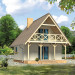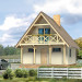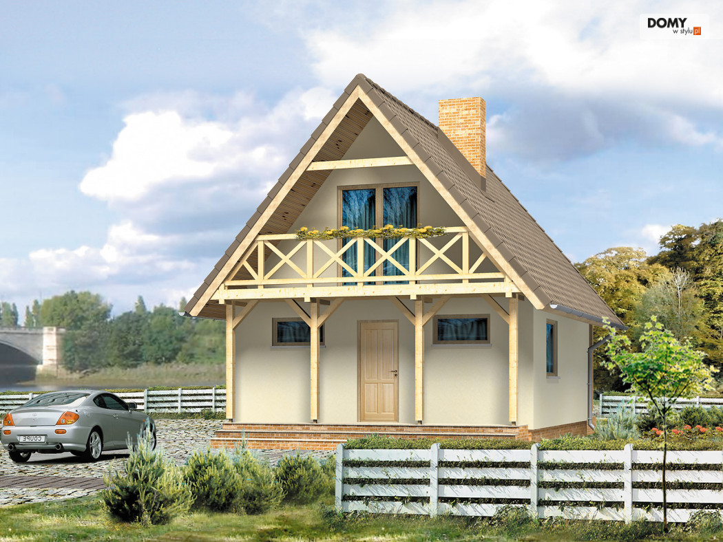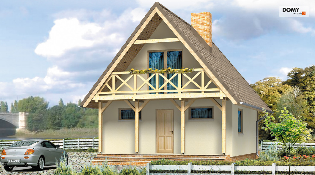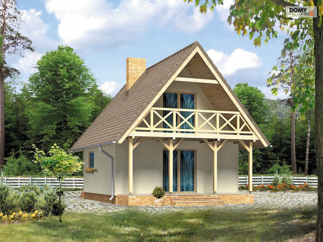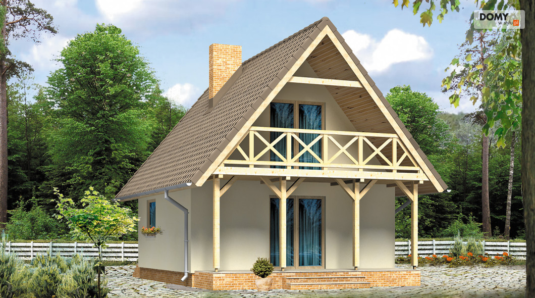 Niewielki dom letniskowy na planie kwadratu z tarasami przy ścianach szczytowych. Budynek o prostej konstrukcji, łatwy w budowie. Funkcjonalny układ wnętrza. Możliwość ogrzewania kominkiem.