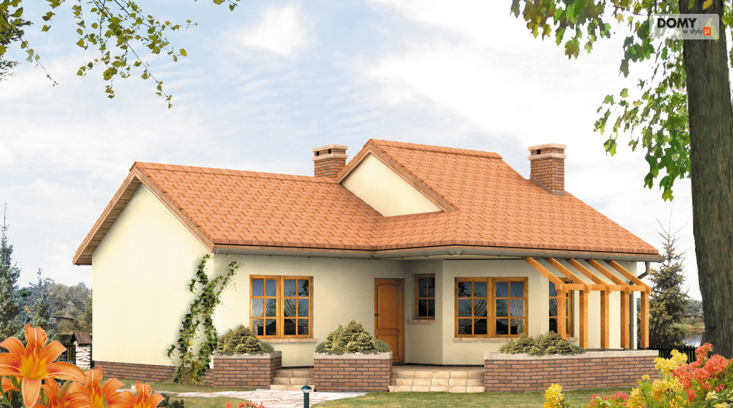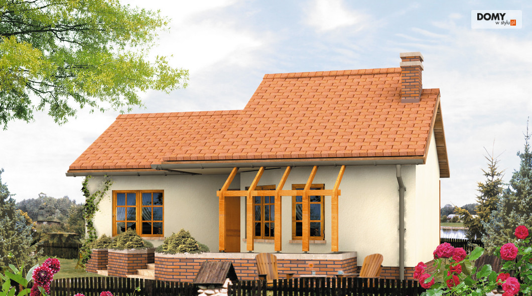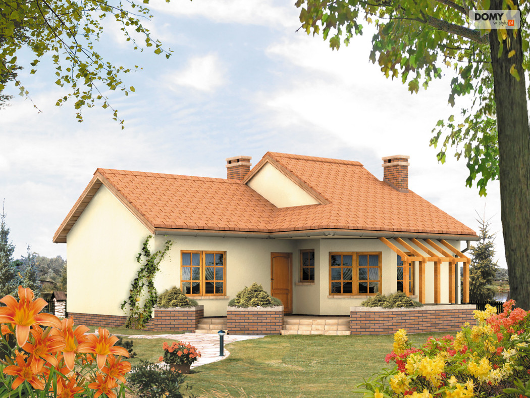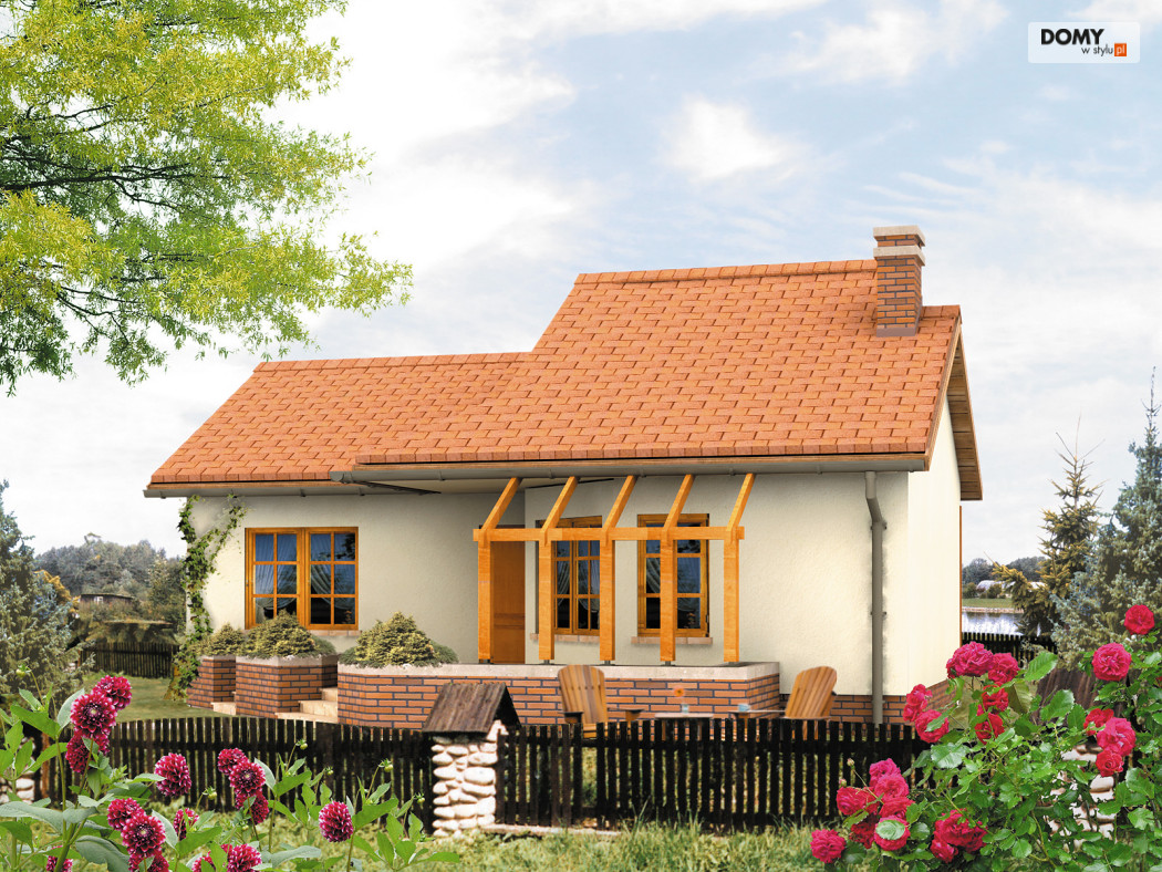 Mały dom jednorodzinny, parterowy, niepodpiwniczony. Częściowo zadaszony taras. Możliwość rozbudowy domu o garaż.