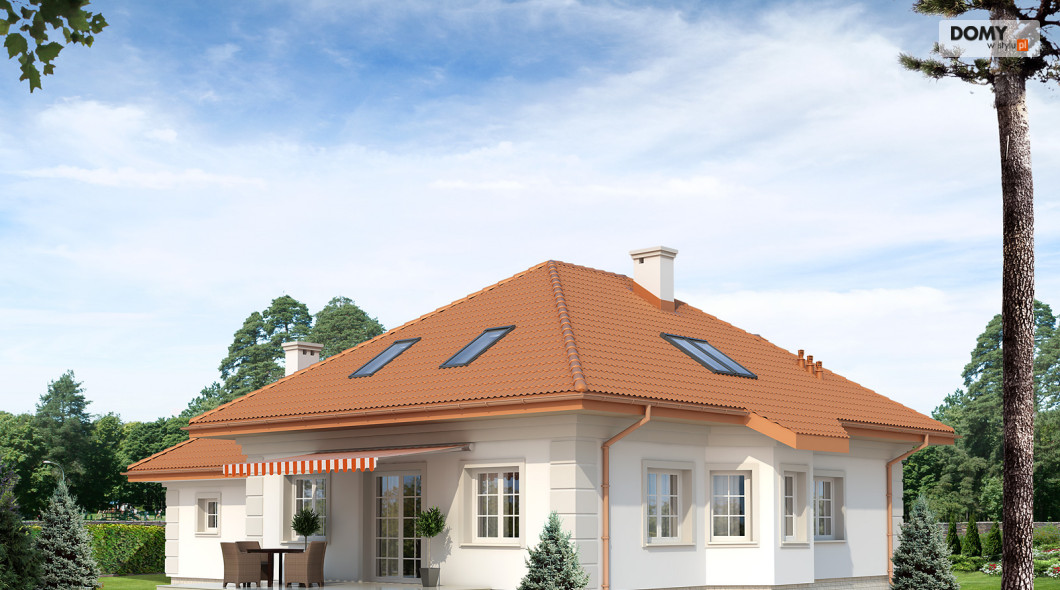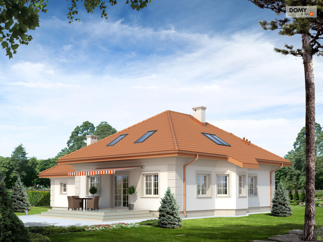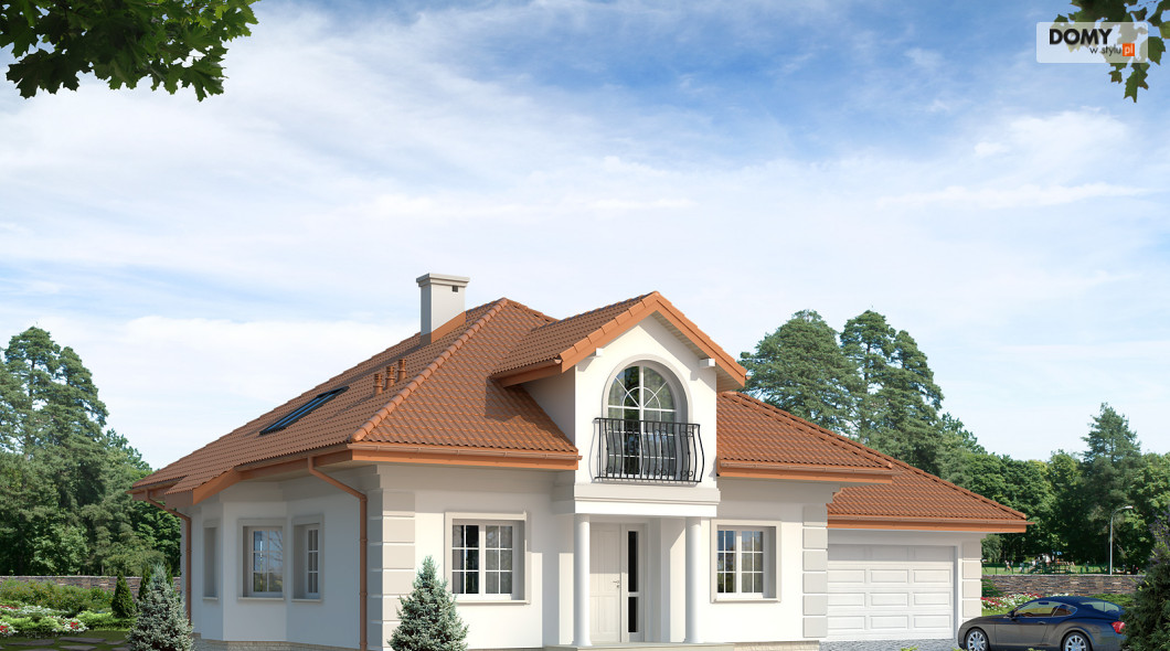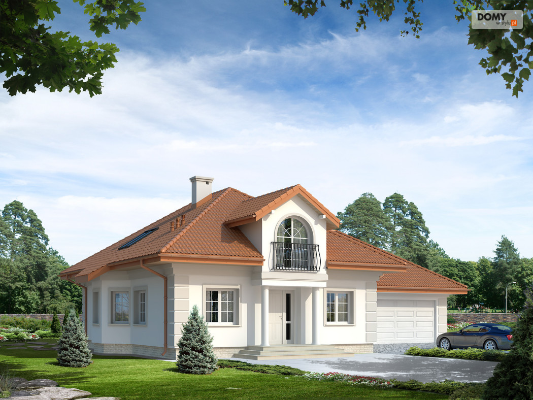 Dom mieszkalny jednorodzinny z użytkowym poddaszem i dwustanowiskowym garażem, przeznaczony dla 2-4 osób. Przestronny salon otwarty jest na taras i kuchnię. Liczne pomieszczenia dodatkowe: biblioteka na poddaszu, spiżarnia, pomieszczenie gospodarcze i dwie garderoby odpowiadają za praktyczną wygodę użytkowania domu.