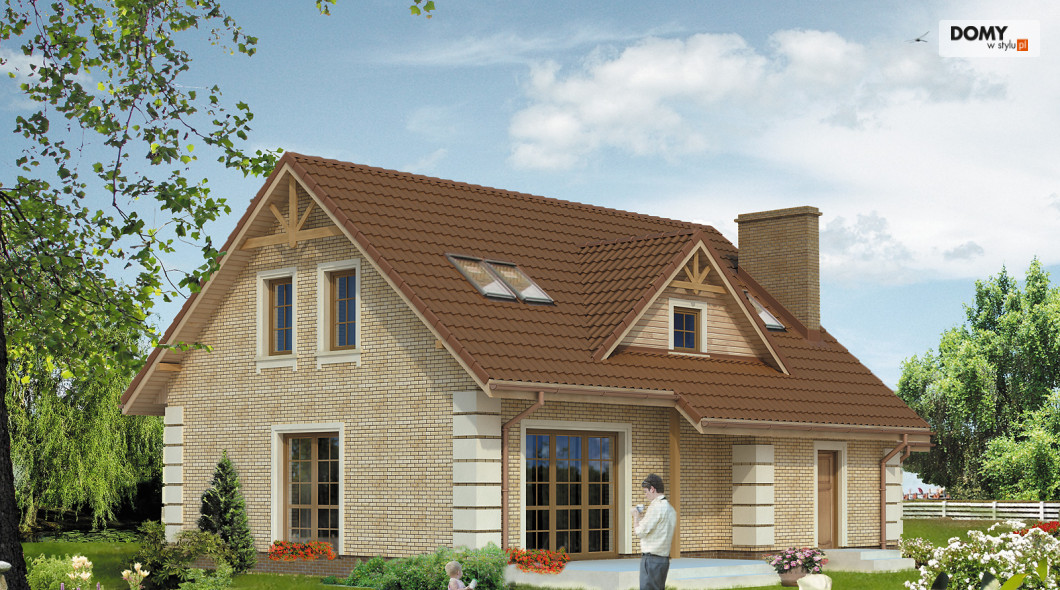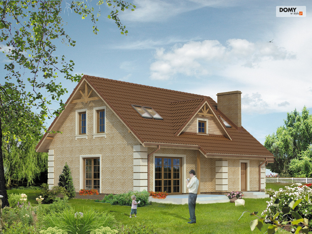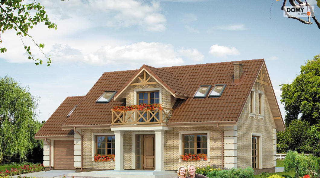 Dom jednorodzinny, parterowy z poddaszem użytkowym i garażem jednostanowiskowym. Na parterze, oprócz podstawowych pomieszczeń strefy dziennej, zaprojektowano dodatkowy pokój z łazienką. Na poddaszu zaprojektowano dwie sypialnie z garderobą i łazienkę.