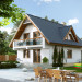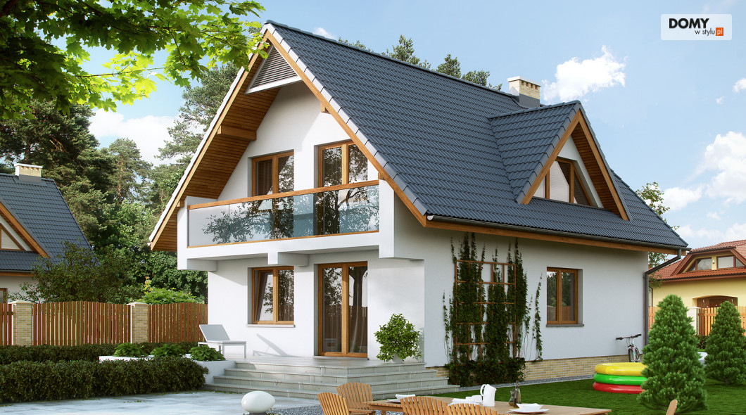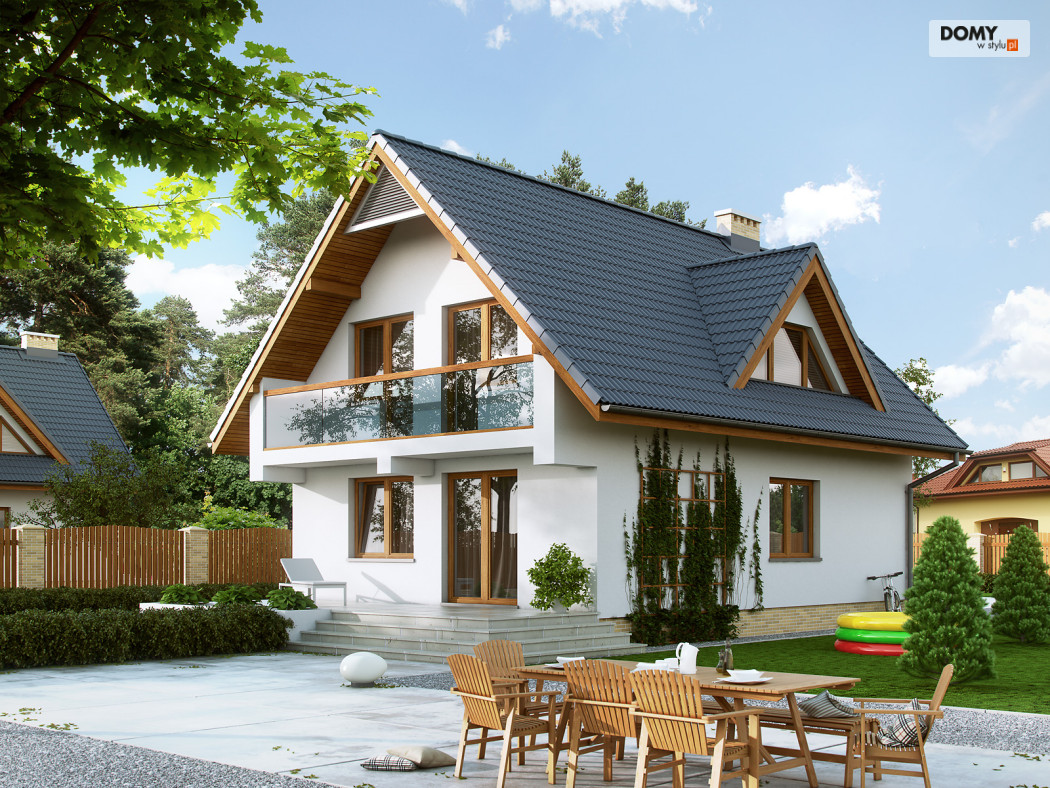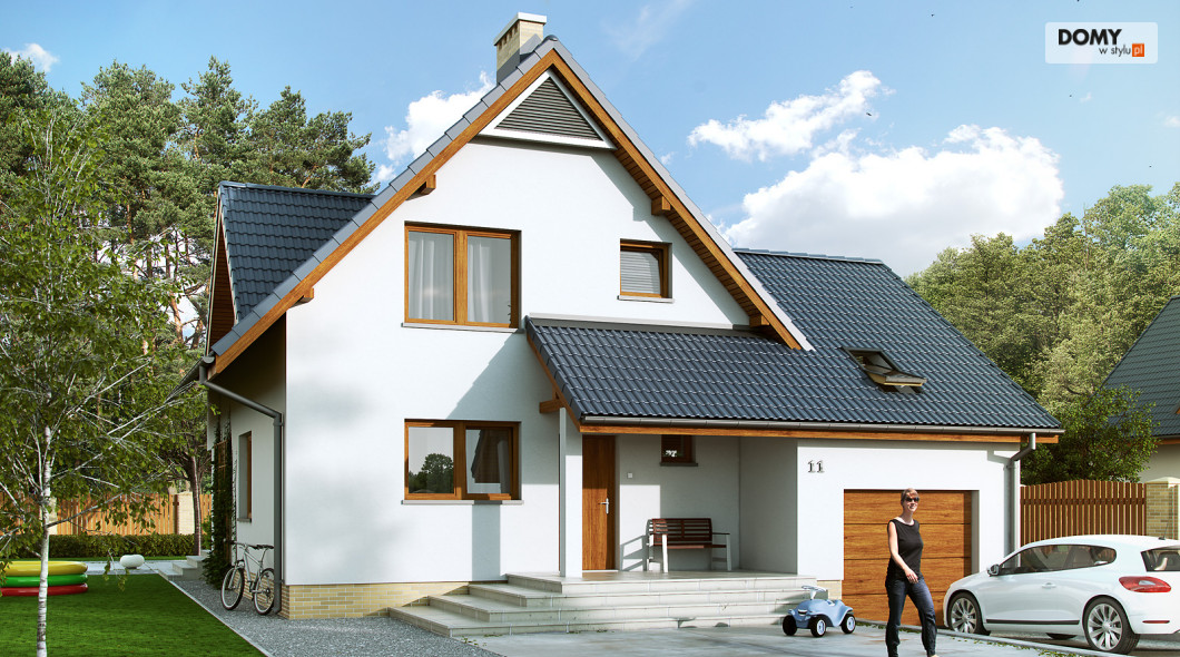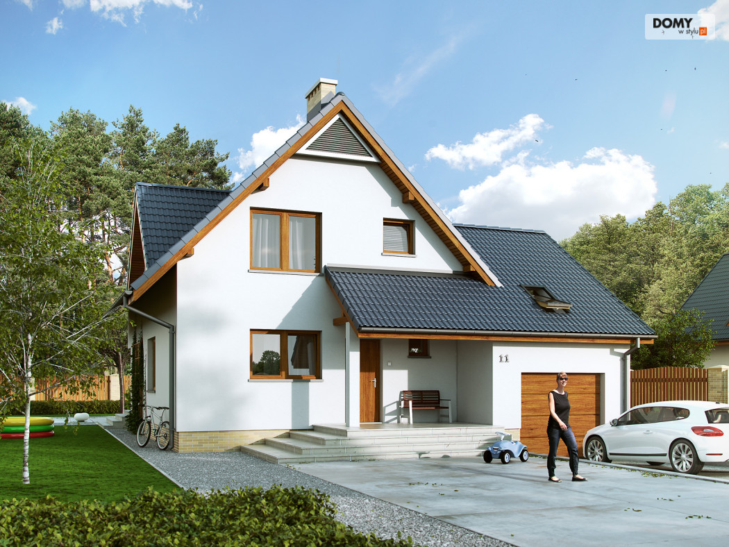 Dom jednorodzinny, parterowy z użytkowym poddaszem, niepodpiwniczony. Niewielki dom o zwartej bryle i racjonalnym układzie wewnętrznym. Na parterze kuchnia z jadalnią, pokój dzienny z kominkiem. Na poddaszu wygodna łazienka i sypialnie. Nad garażem strych lub pracownia.