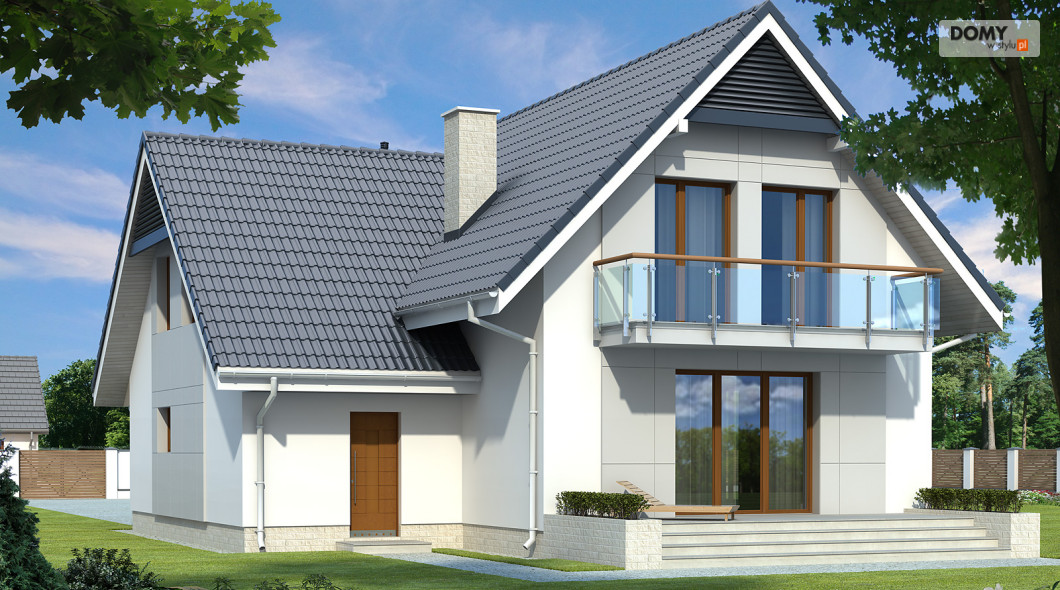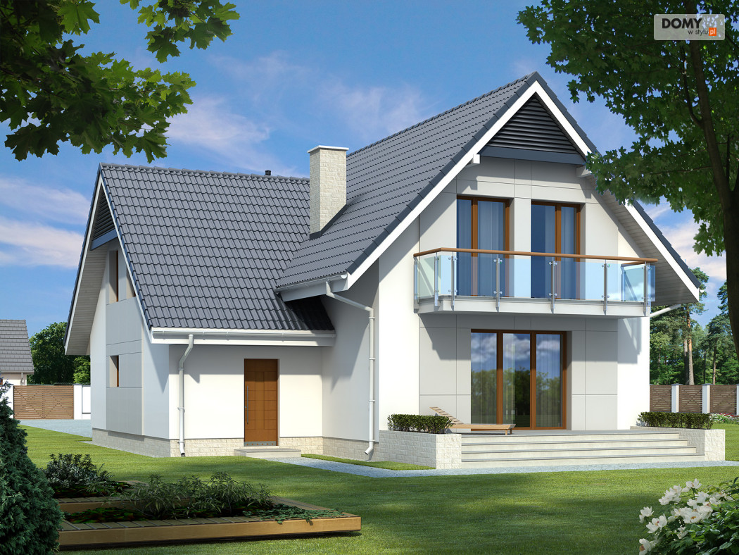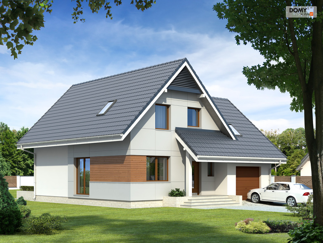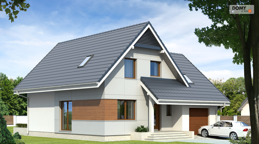 Mały dom mieszkalny z użytkowym poddaszem, niepodpiwniczony. Na parterze znajduje się przestronny pokój połączony z jadalnią i kuchnią, kotłownia oraz garaż. Na poddaszu zaprojektowano trzy sypialnie. Nad garażem na półpiętrze znajduje się pomieszczenie gospodarcze oraz mały pokój, gabinet lub pokój gościnny.