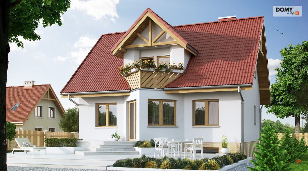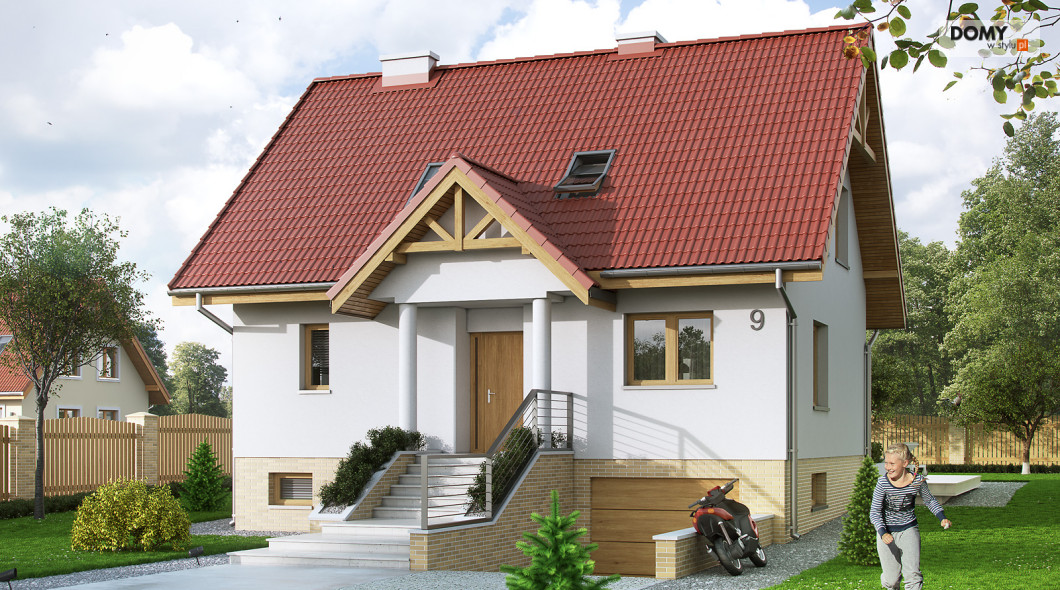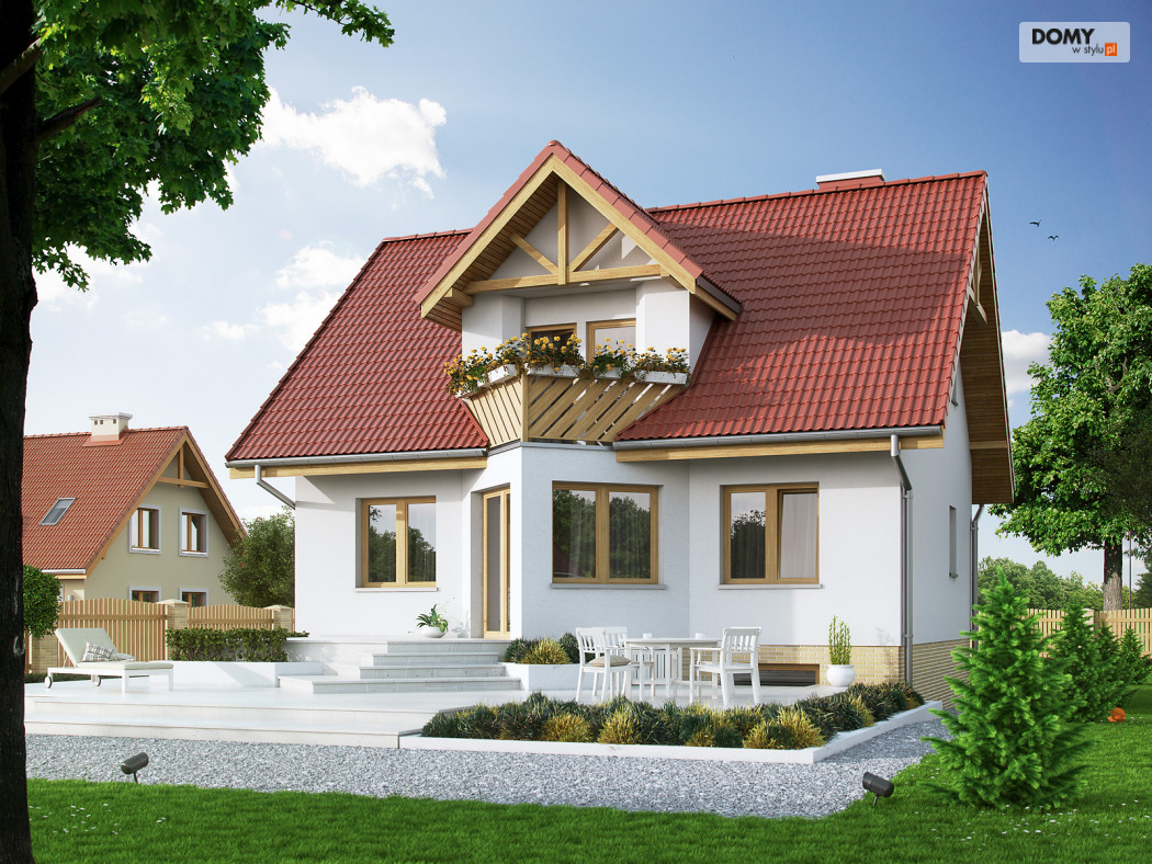 Dom jednorodzinny, parterowy z użytkowym poddaszem, podpiwniczony. Mały, zwarty, bardzo wygodny dom dla 4 osób. Na parterze dodatkowy pokój (gabinet lub pokój seniora), przestronna kuchnia z jadalnią oraz pokój dzienny z wykuszem przy tarasie. Na poddaszu sypialnie z niewielkim balkonem i garderobą.