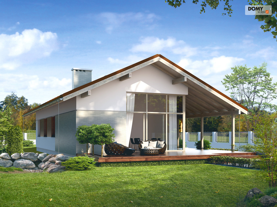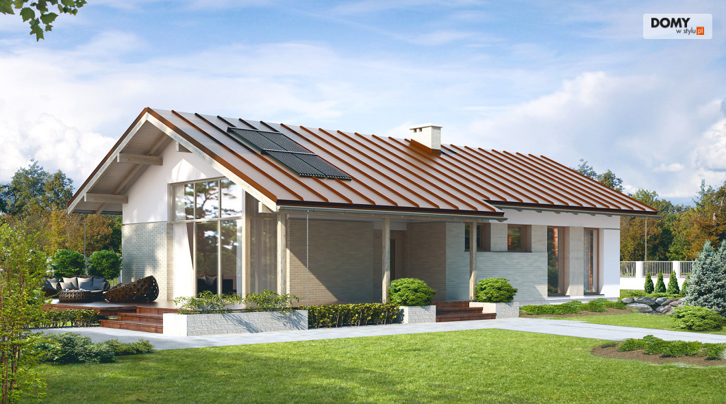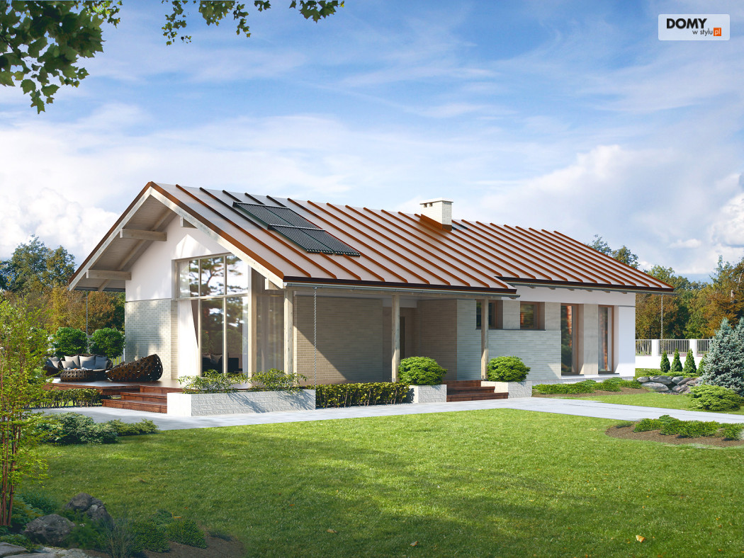 Parterowy dom jednorodzinny o czystym układzie funkcjonalnym z wyraźnym podziałem na część dzienną i nocną. Salon posiada wysoki sufit oraz duże przeszklenie z wyjściem na taras. Przeznaczony dla 4-osobowej rodziny. Dom zaprojektowany w technologii Multi-Comfort z zastosowaniem produktów marki Saint-Gobain łączy unikalne właściwości produktów z rozsądną ceną. Standard Multi-Comfort oznacza szereg korzyści, takich jak: niskie koszty ogrzewania, komfort termiczny, akustyczny, dobra jakość powierza, bezpieczeństwo przeciwpożarowe (klasa A1). Wszystko to jest możliwe za sprawą zastosowanych w projekcie sprawdzonych materiałów znanych i cenionych marek: Isover, Weber, Rigips, Glassolutions. Produkty Grupy Saint-Gobain są wytwarzane z naturalnych materiałów i posiadają deklaracje środowiskowe. W procesie eksploatacji budynki zaprojektowane w technologii Multi-Comfort posiadają niewielkie zapotrzebowanie na energię pierwotną. Więcej informacji o domach w standardzie Multi-Comfort: www.multi-comfort.pl