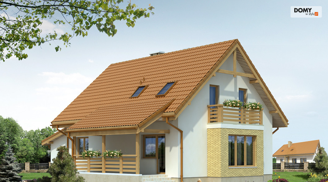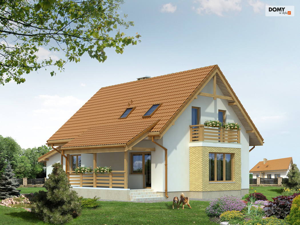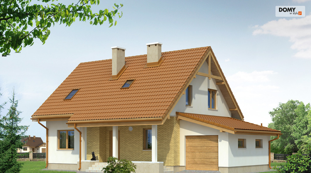 Dom jednorodzinny z poddaszem użytkowym, przeznaczony dla 4 – 5-osobowej rodziny Na parterze zaprojektowano salon z jadalnią i kuchnią, gabinet, sporą łazienkę, kotłownię, spiżarnię pod schodami oraz garaż. Na poddaszu znajdują się trzy sypialnie, łazienka, pomieszczenie gospodarcze oraz garderoba dostępna z jednego z pokoi.
