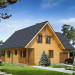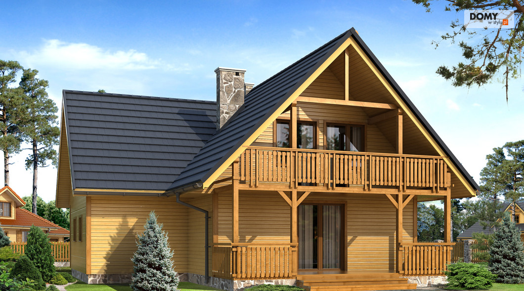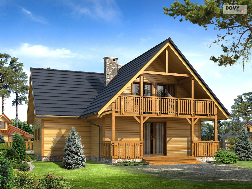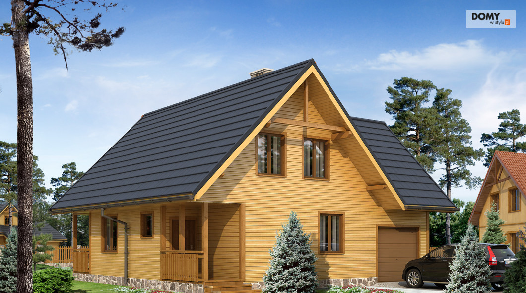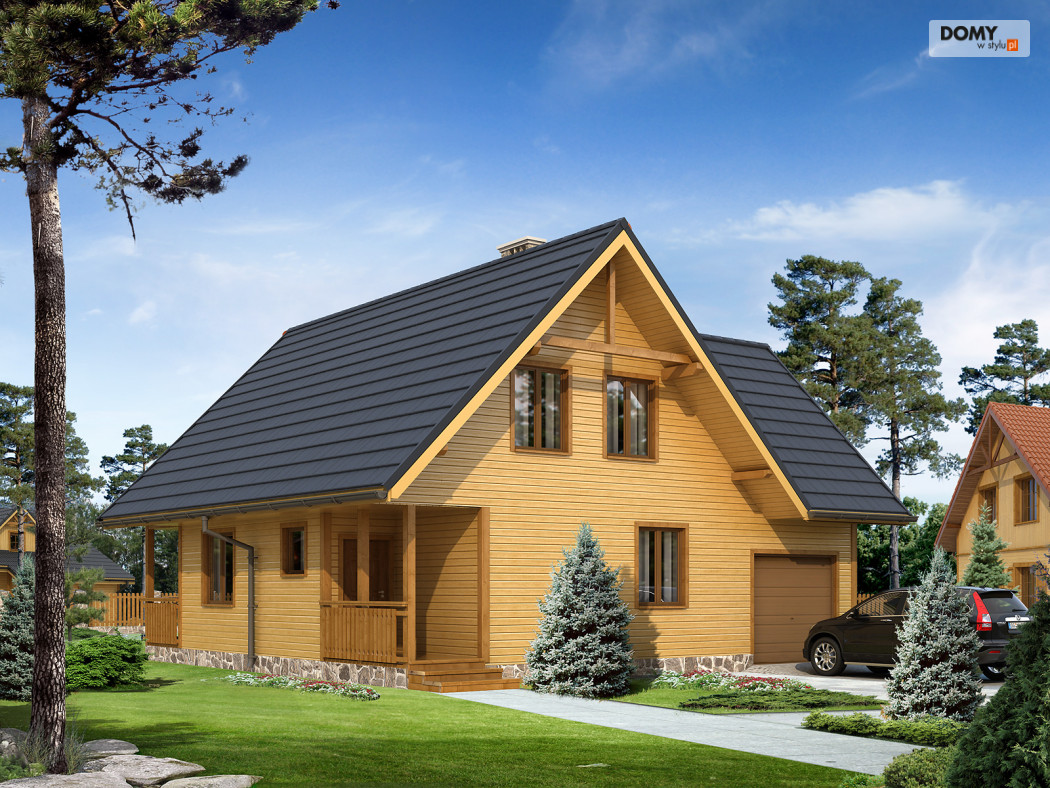 Drewniany dom z użytkowym poddaszem i garażem. Na parterze zlokalizowano przestronny pokój dzienny z wyjściem na zadaszony taras. Na piętrze zlokalizowano trzy sypialnie i łazienkę.