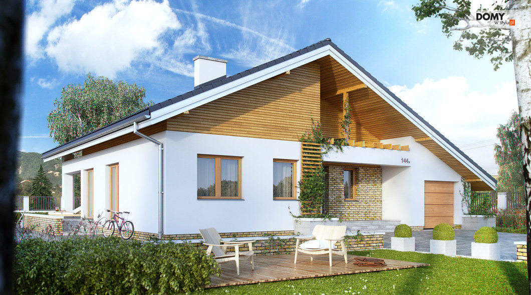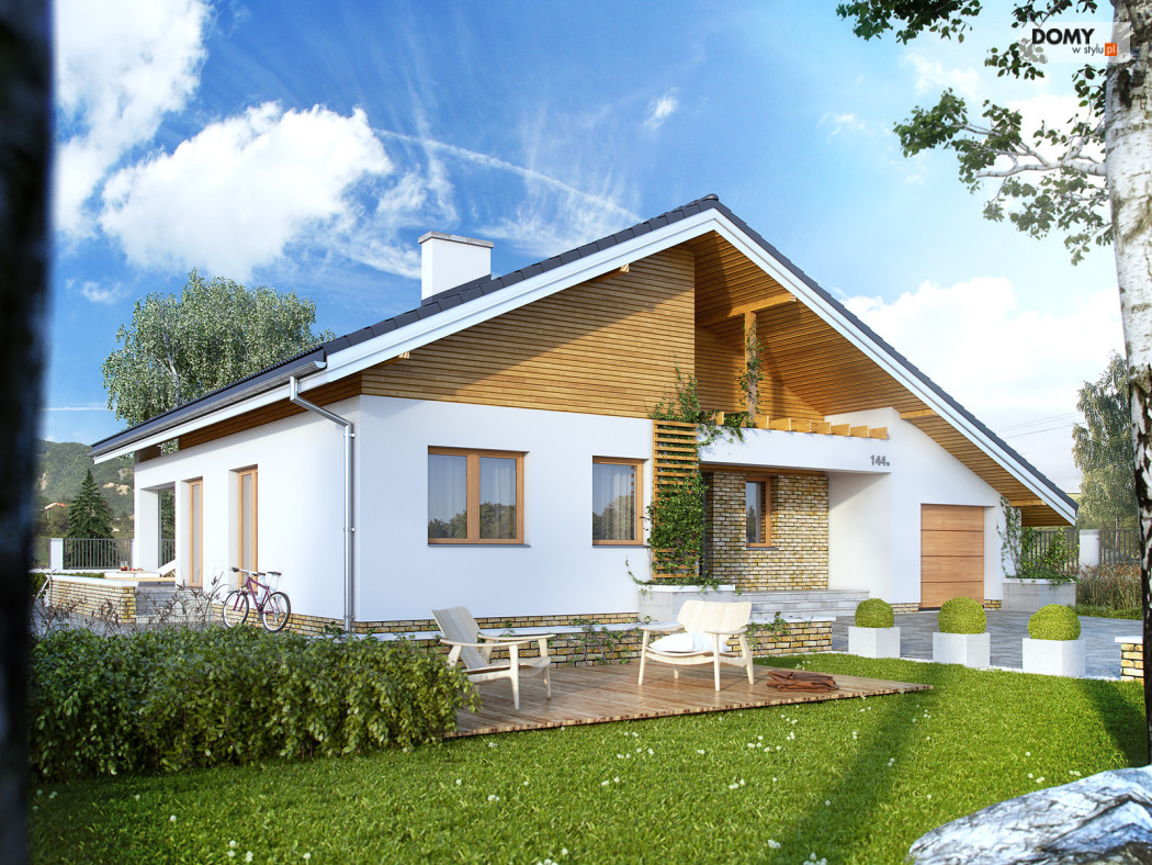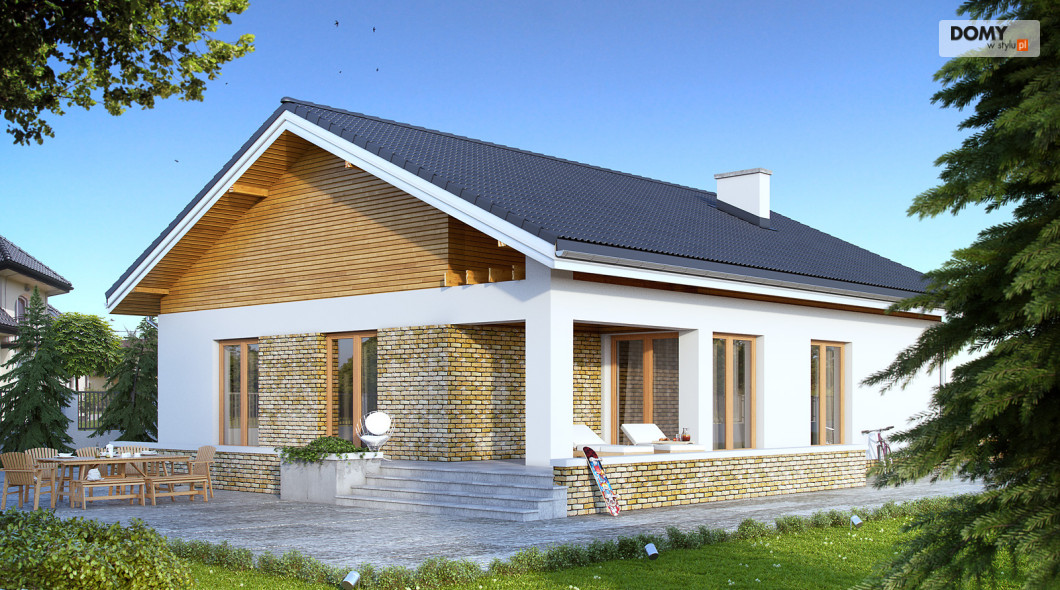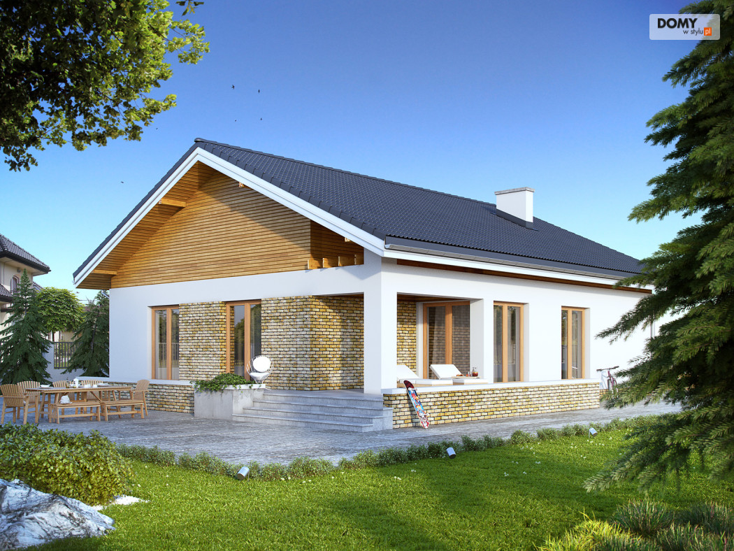 Jednorodzinny dom parterowy z garażem, przeznaczony dla 4-osobowej rodziny. Funkcjonalny układ pomieszczeń z wyraźnym podziałem na część dzienną i nocną. W prostej bryle budynku zaprojektowano przestronny, otwarty salon z kuchnią i jadalnią oraz częściowo zadaszony taras. W części nocnej przewidziano trzy przestronne sypialnie.