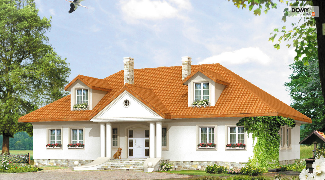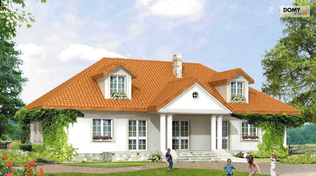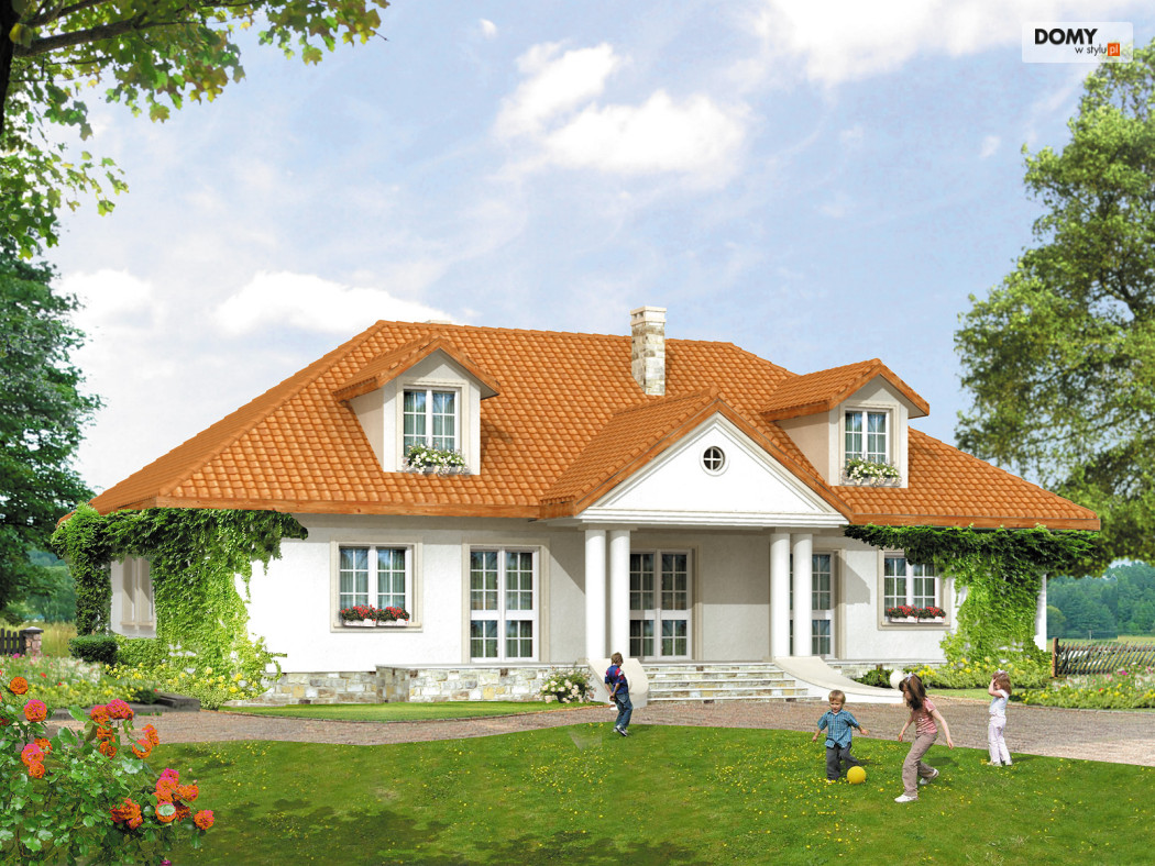 Dom parterowy z poddaszem użytkowym, przeznaczony dla 4 – 5-osobowej rodziny. Tradycyjna bryła o stylu dworkowym z dachem czterospadowym.