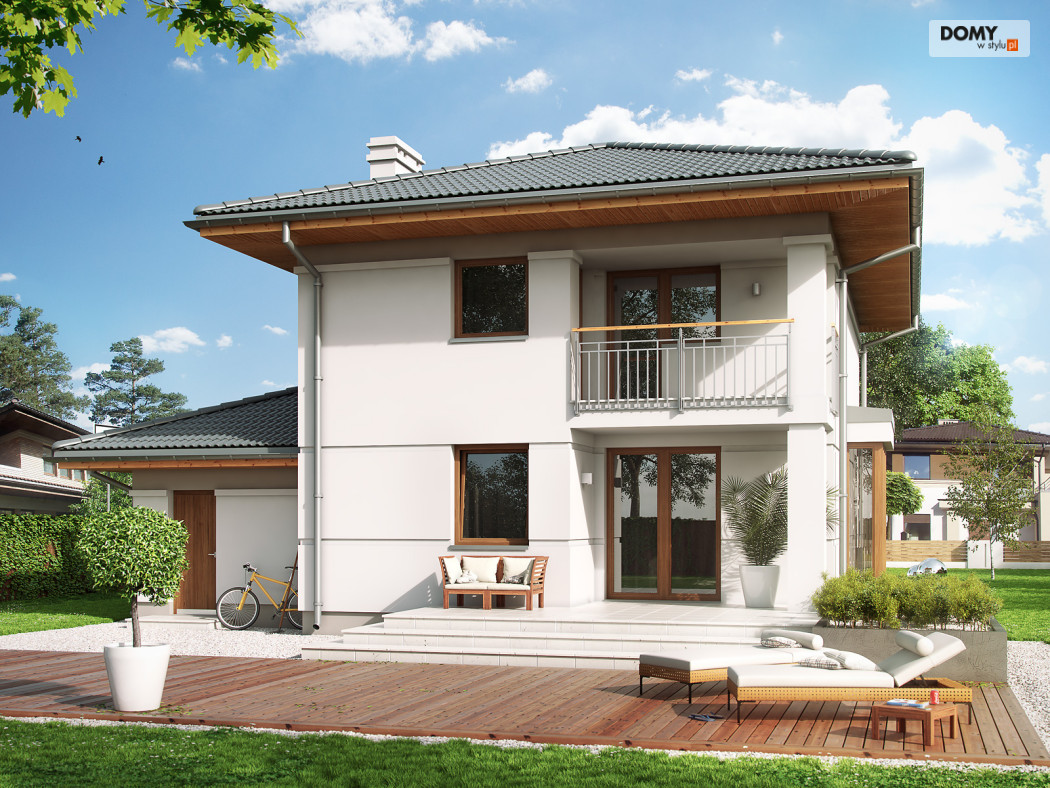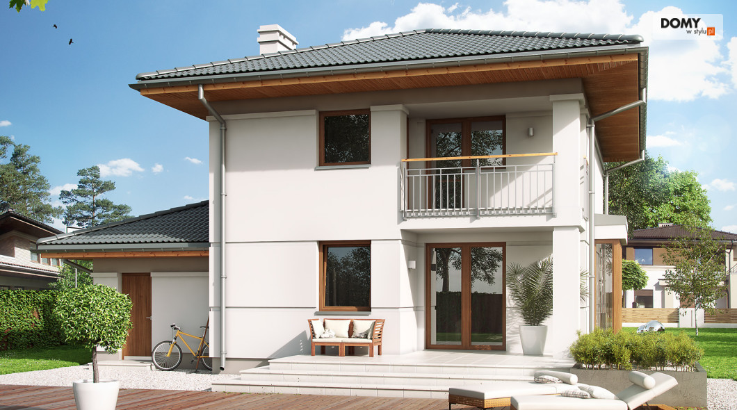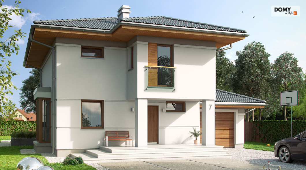 Dom jednorodzinny dla 4 – 5-osobowej rodziny, dwukondygnacyjny, z garażem, niepodpiwniczony. Na parterze zaprojektowano jednoprzestrzenną część dzienną z wydzielonymi aneksami: kuchennym, jadalnianym połączonym z ogrodem szklaną witryną oraz pokojem dziennym z kominkiem. Garaż i pomieszczenie techniczne łączą się z domem wewnętrznym wejściem. Na piętrze trzy sypialnie, łazienka i pralnia z garderobą. Dwie pełne kondygnacje dają możliwość łatwej aranżacji pomieszczeń także na piętrze. Dom charakteryzuje się zwartą bryłą o nowoczesnym wyglądzie.