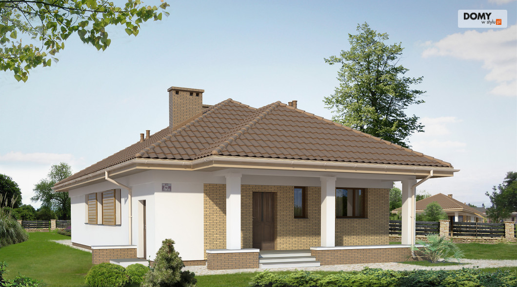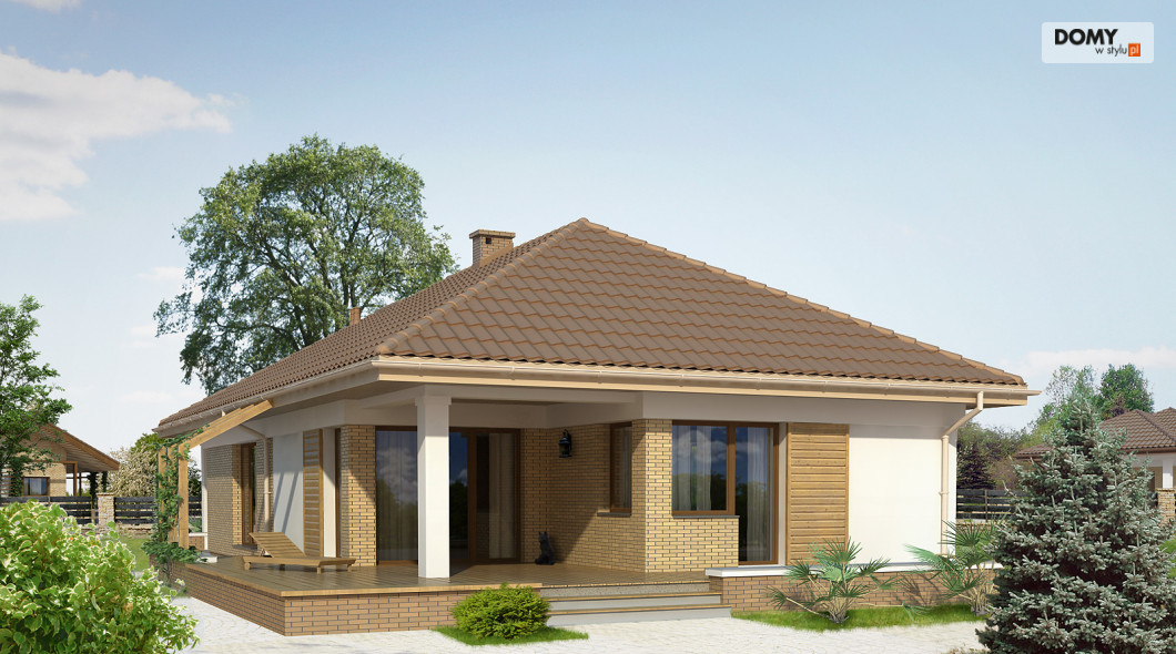 Budynek mieszkalny, jednorodzinny, parterowy przeznaczony dla 3-osobowej rodziny. Na parterze zaprojektowano dwie sypialnie, dwie łazienki, kotłownię, spiżarnię, kuchnię oraz pokój dzienny z jadalnią. Z pokoju dziennego mamy wyjście na przestronny, częściowo zadaszony taras.